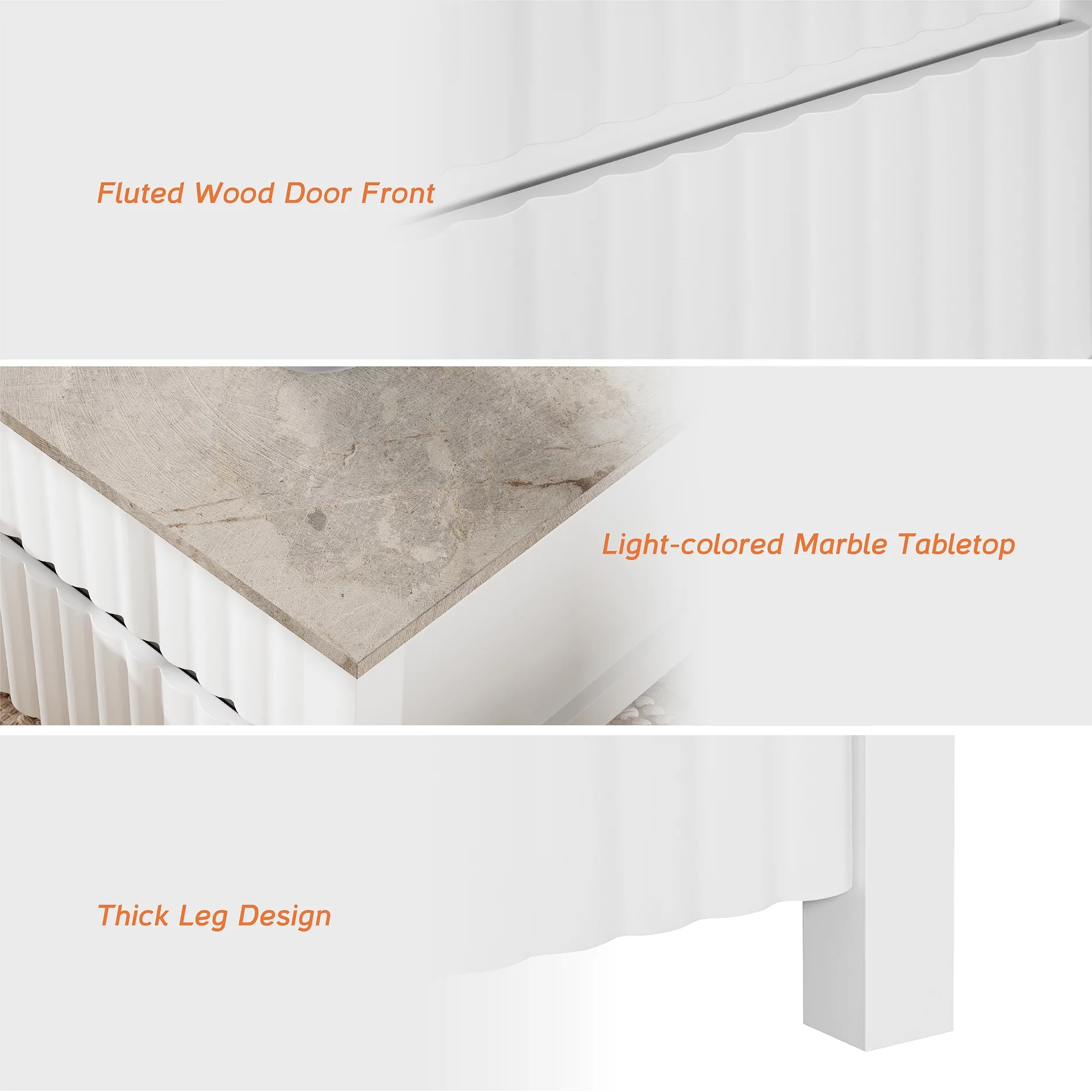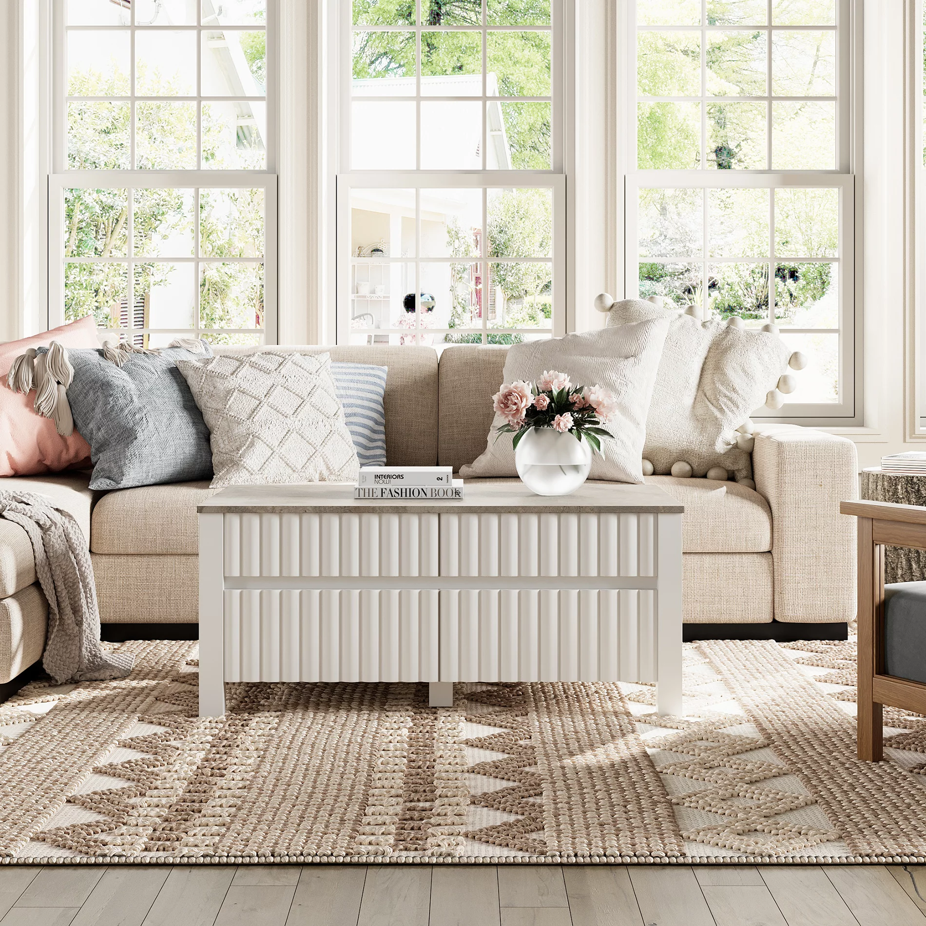 WAMPAT White Coffee Table, Modern Coffee Table with Hidden Storage Compartment and Sliding Drawers, Center Table Thick Wood Legs for Living Room Bedroom