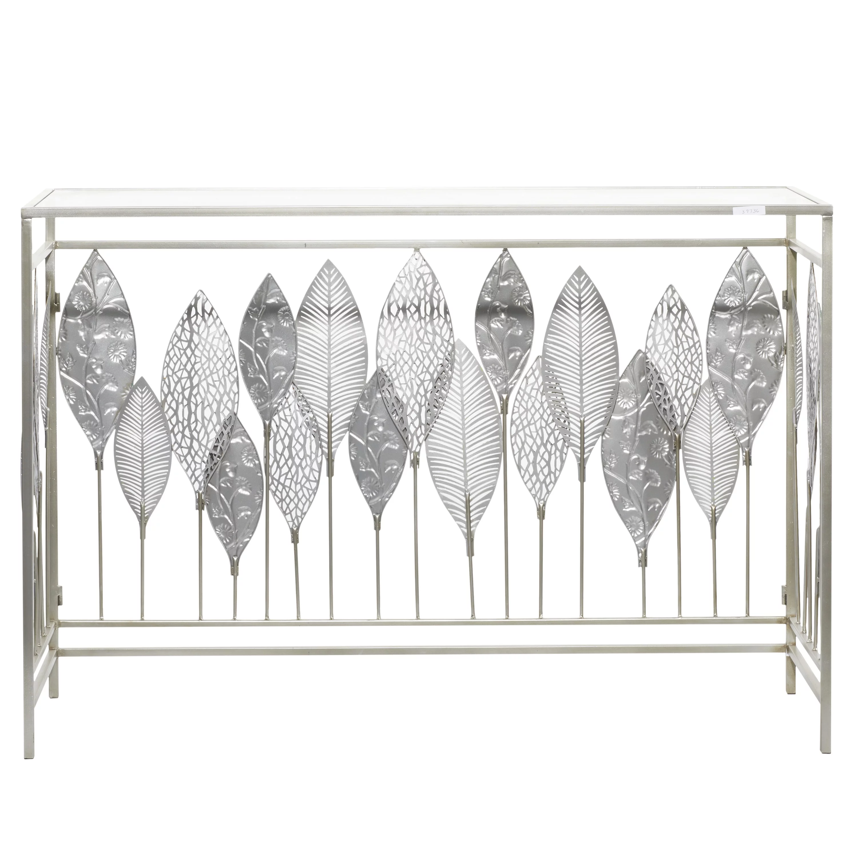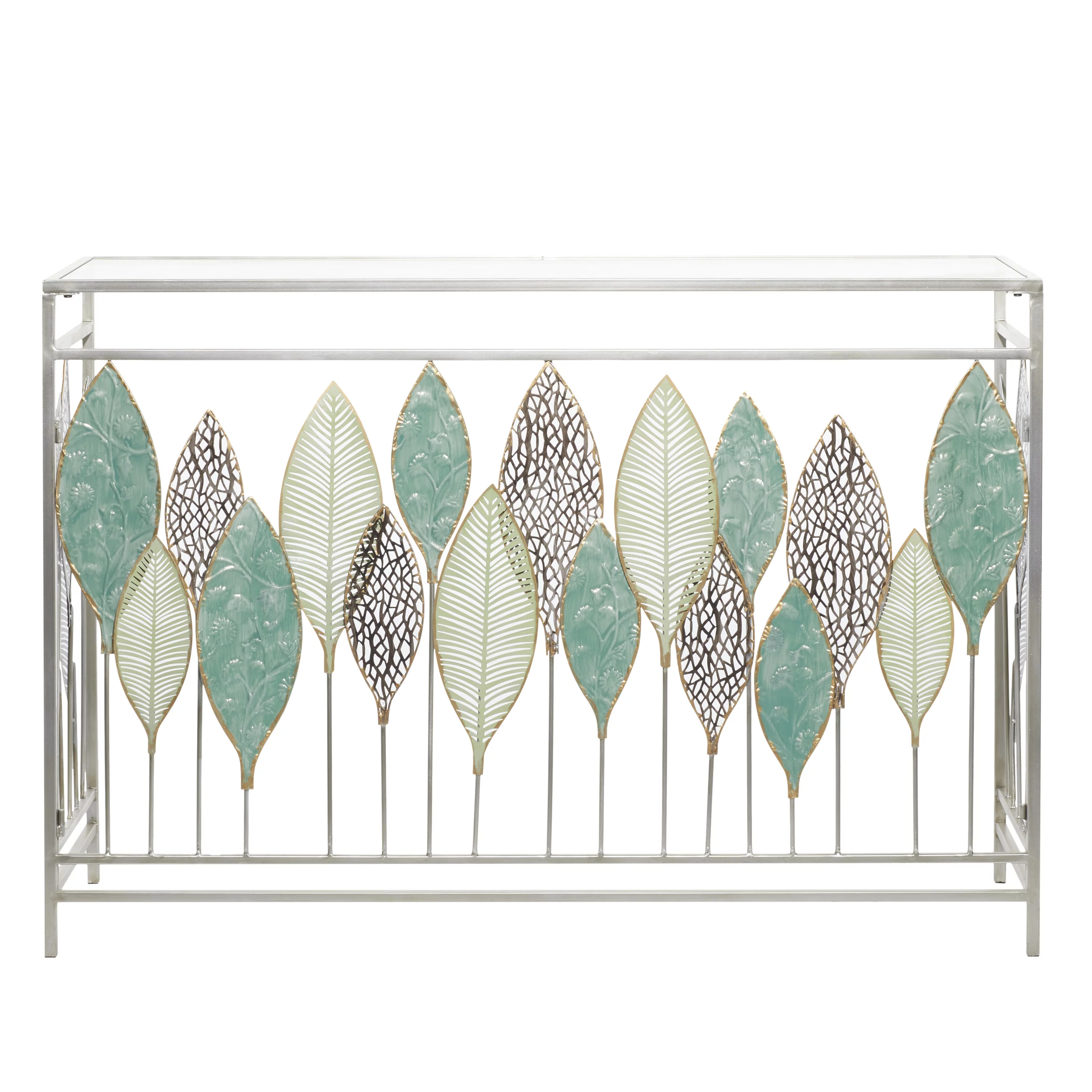 DecMode Silver Contemporary Rectangular Metal Console Table with Green Leaves Sculpture, 44"W x 30"H