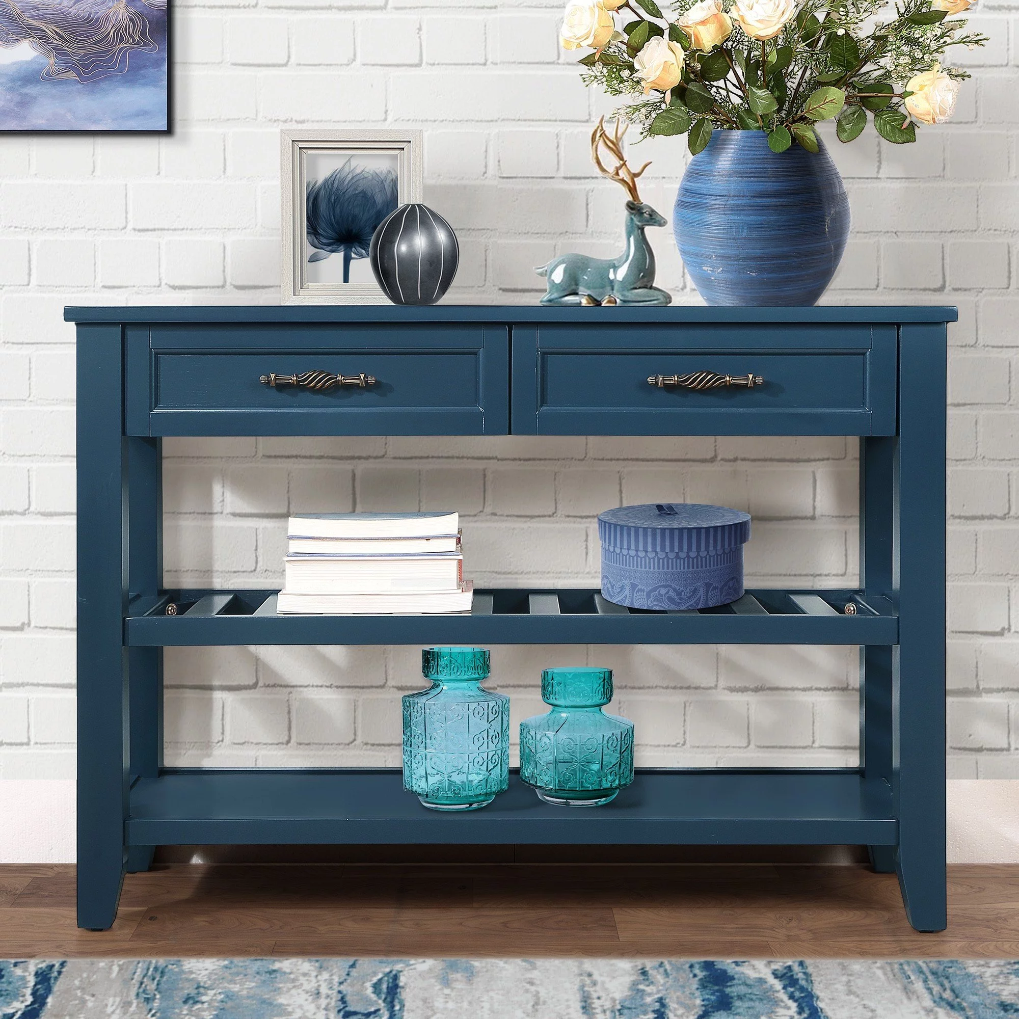 Console Sofa Table with 2 Storage Drawers and 2 Tiers Shelves, Mid-Century Style 42'' Solid Wood Buffet Sideboard for Living Room Furniture Kitchen Dining Room Entryway Hallway,Navy Blue