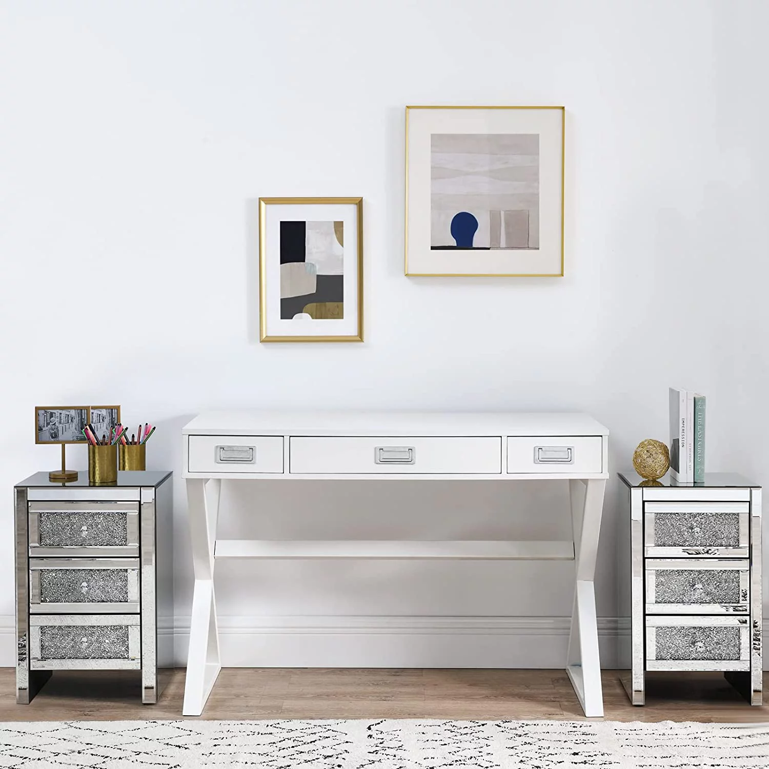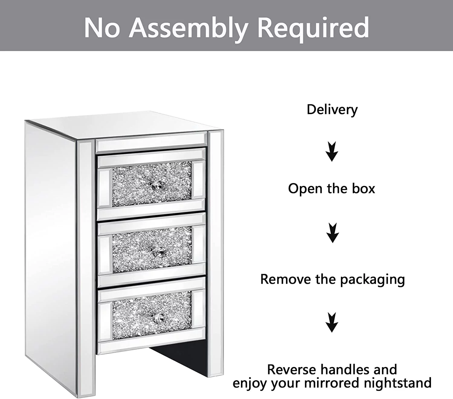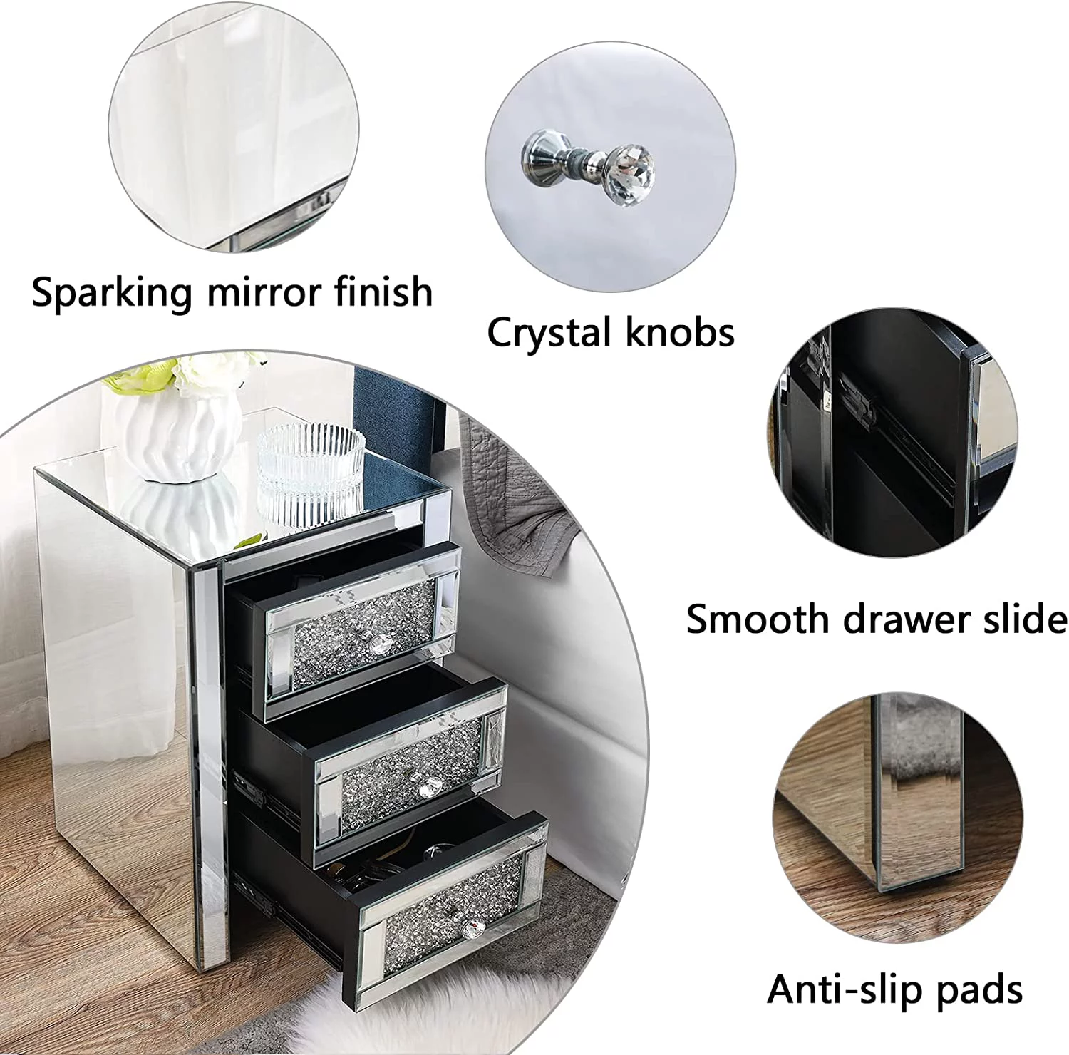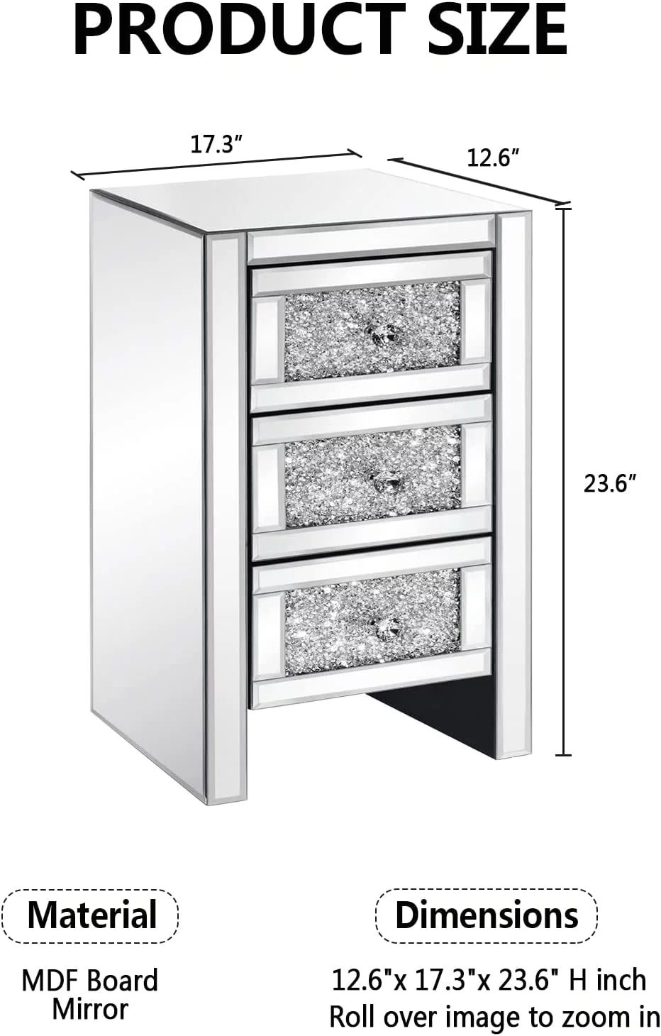 Alohappy Mirrored Nightstand with 3-Drawers, Mirror and Crystal Surface End Table Silver Bedside Table for Living Room/Bedroom, Fully Assembled, Crystal Sliver