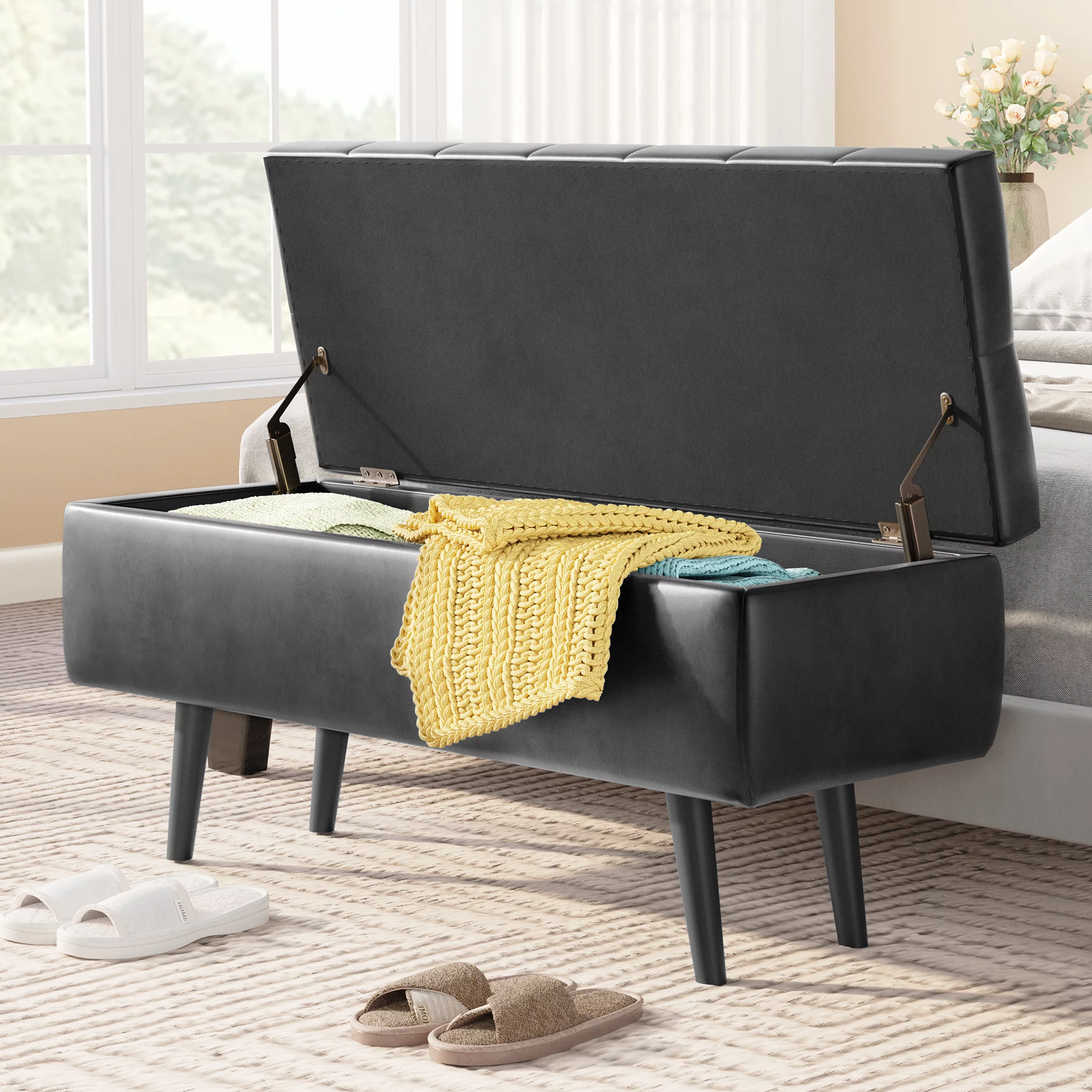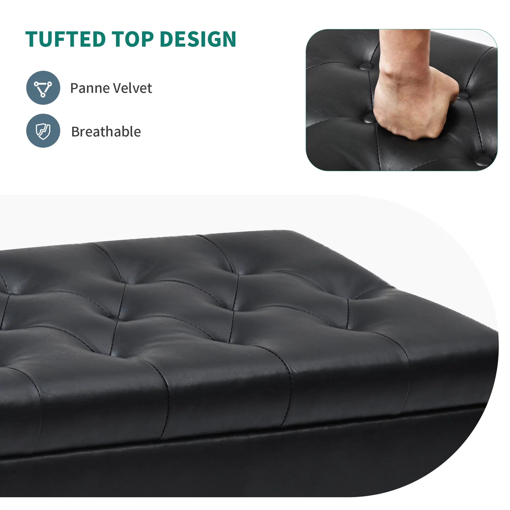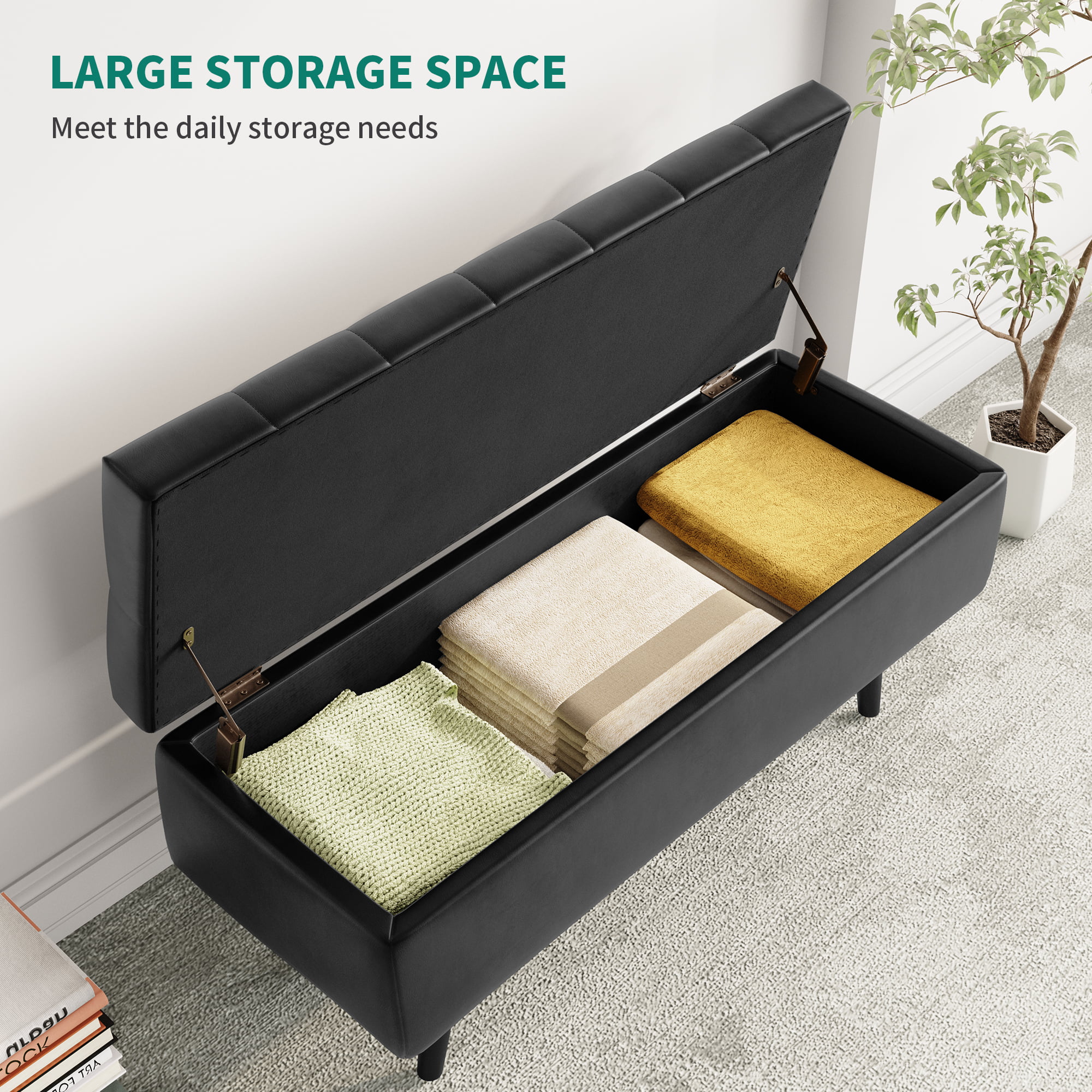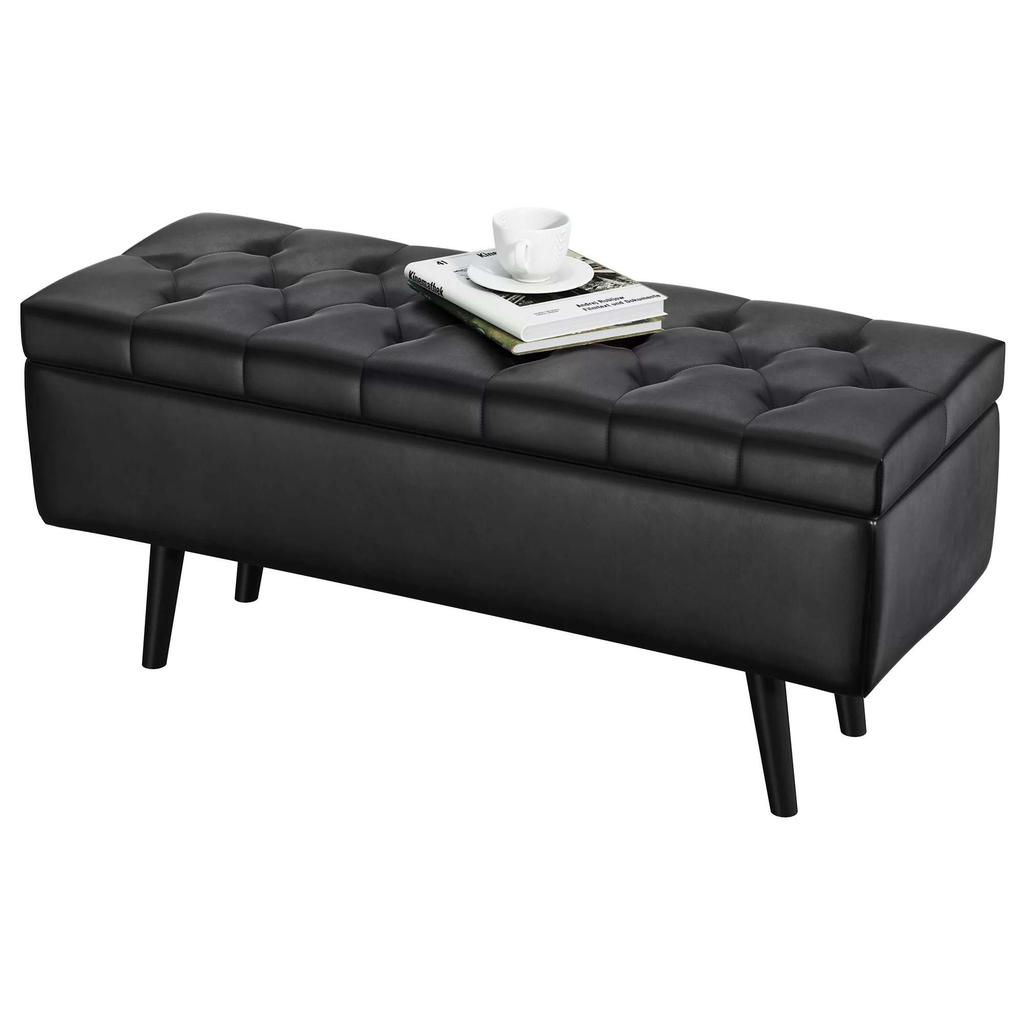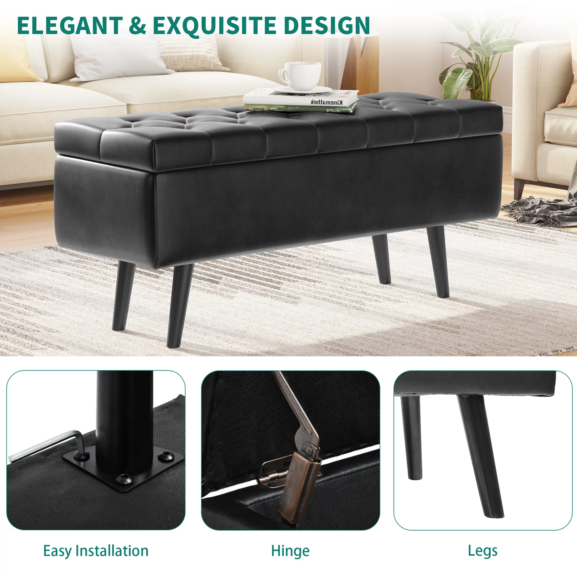 Dextrus Storage Ottoman Bench, Faux Leather Storage Bench in Upholstered Fabrics for Bedroom, Living Room (Black)