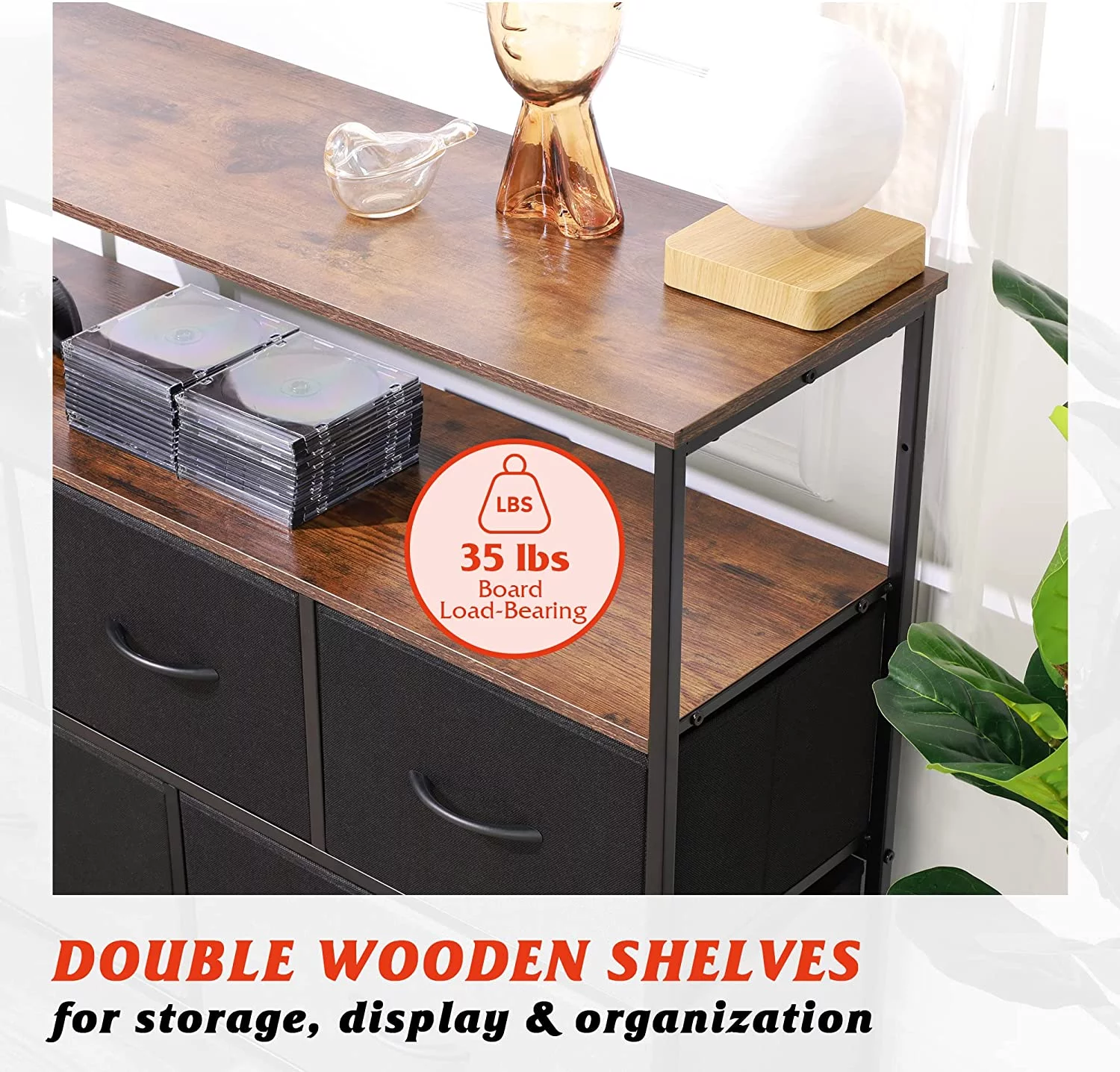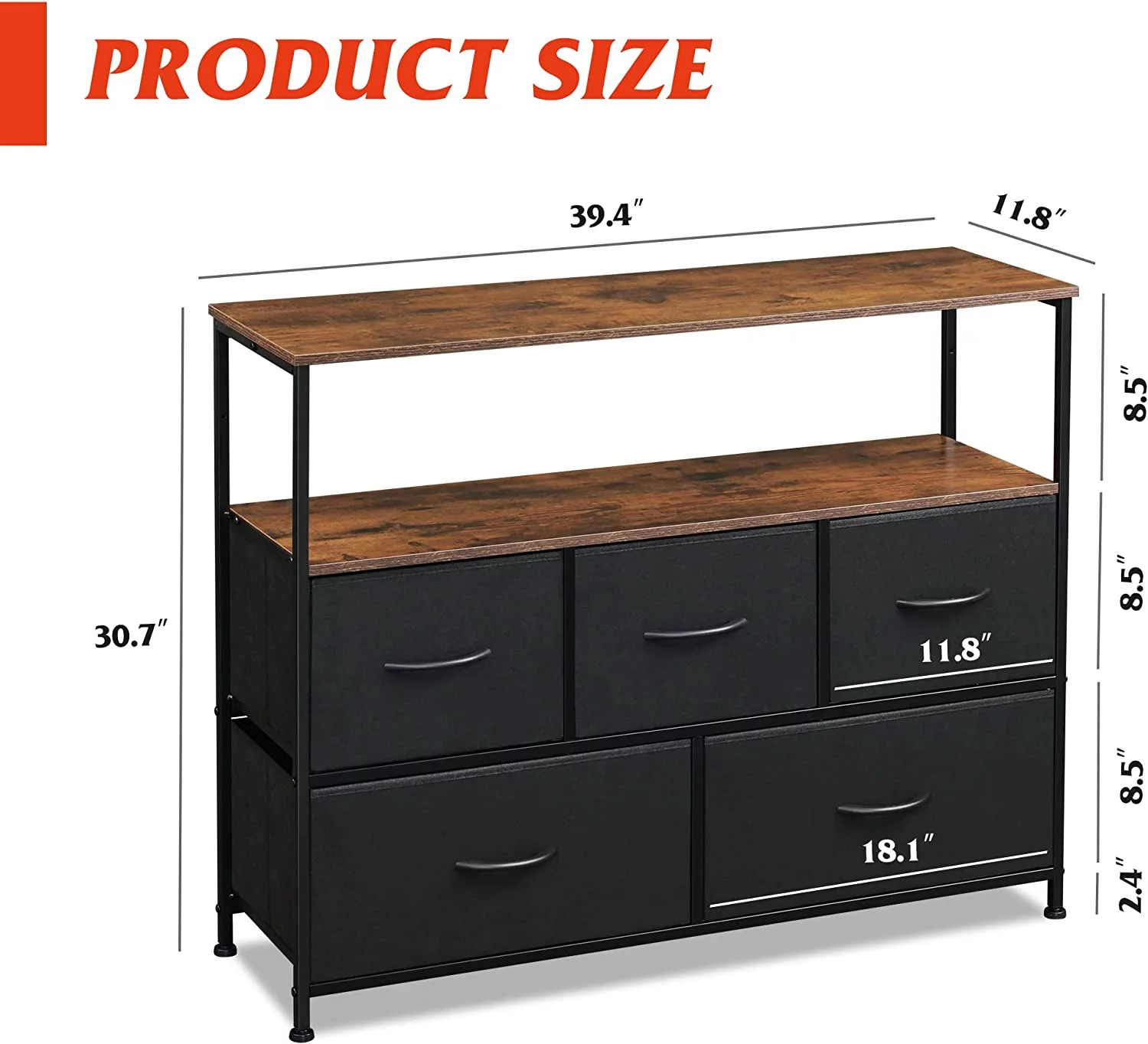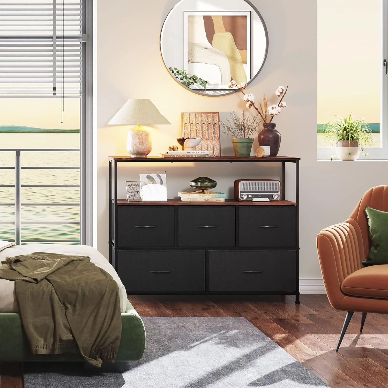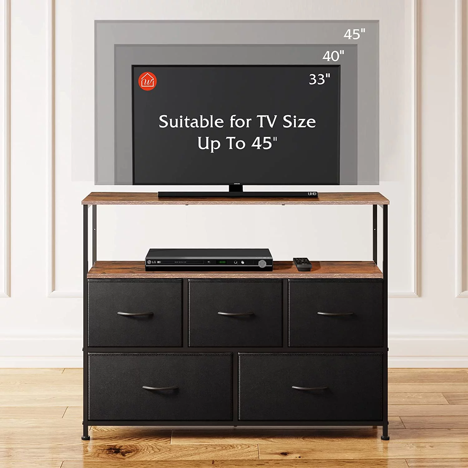 JIAH TV Stand, Entertainment Center with Fabric Drawers, Media Console Table with Open Shelves for TV up to 45 inch, Storage Drawer Unit for Bedroom, Entryway, Black and Rustic Brown