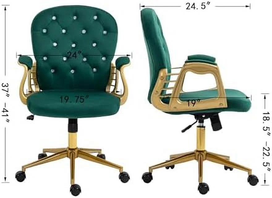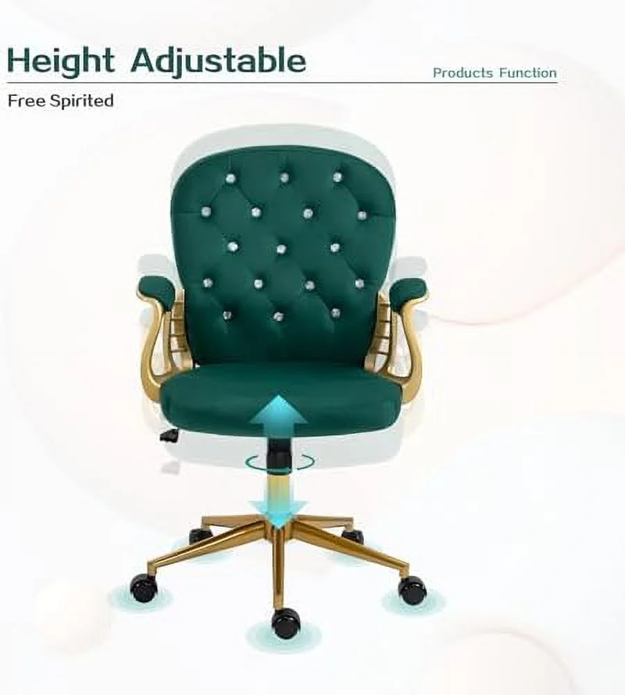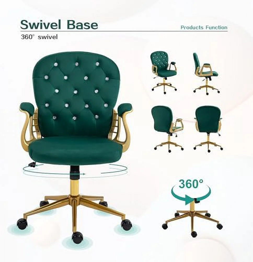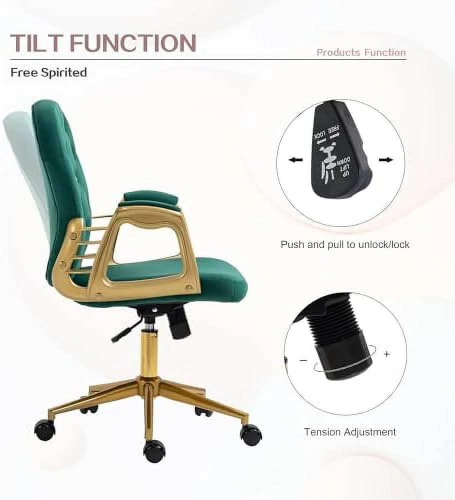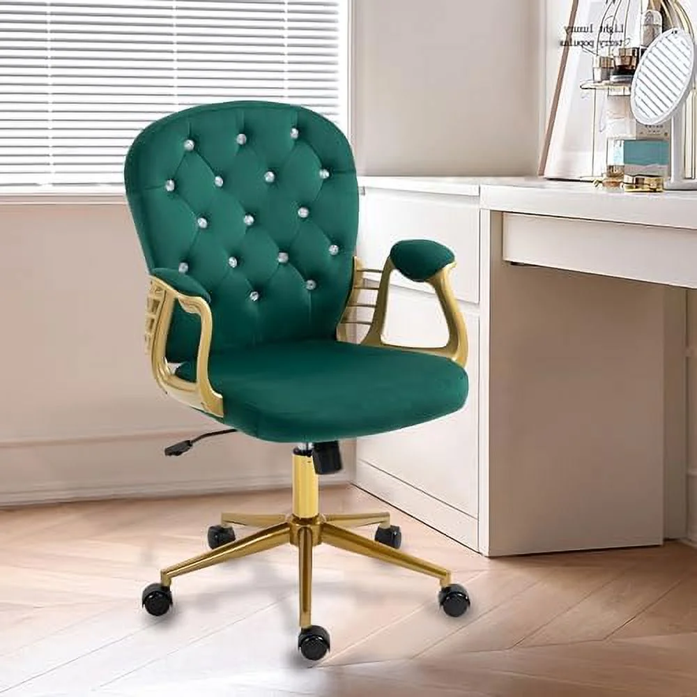 KHBIULIFE Velvet Office Chair with Wheels Button Tufted Desk Chair with Gold Base Cute Armchair Roller Chair Rolly Chair Vanity Chair with Back for Teen Girls Women Tilt Pink