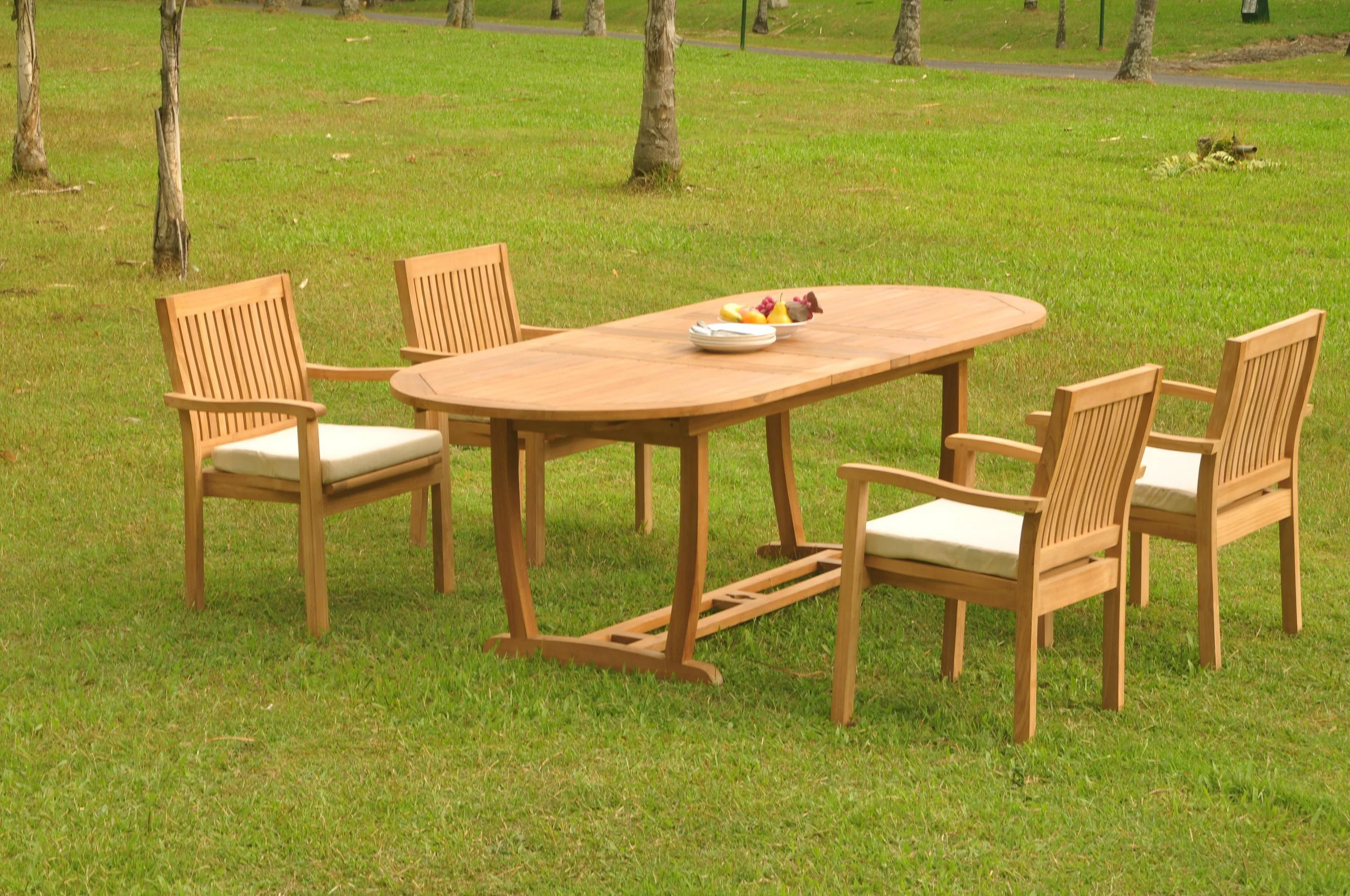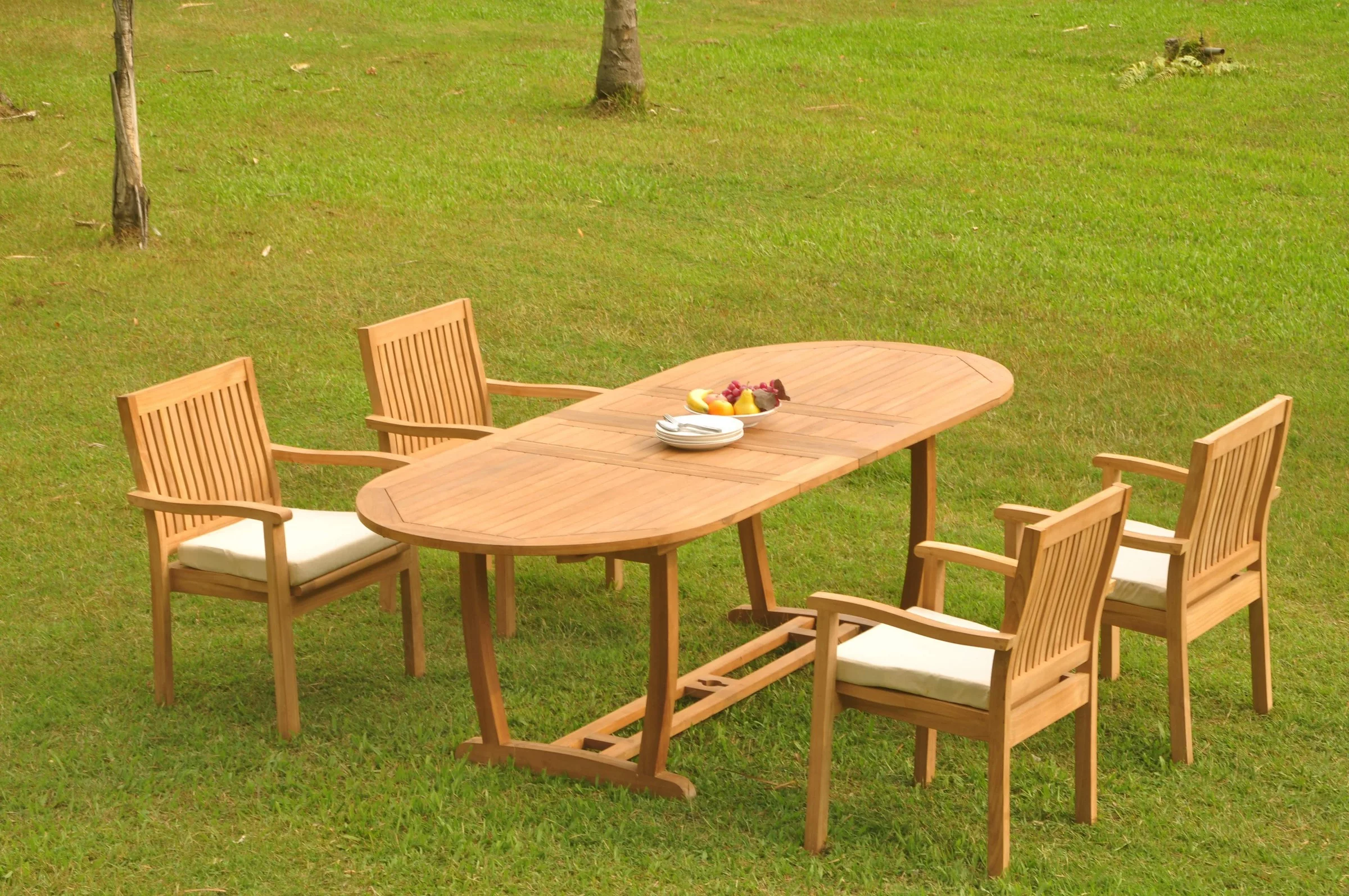 Grade-A Teak Dining Set: 4 Seater 5 Pc: 94" Mas Oval Trestle Leg Table And 4 Leveb Stacking Arm Chairs Outdoor Patio WholesaleTeak #WMDSWVm