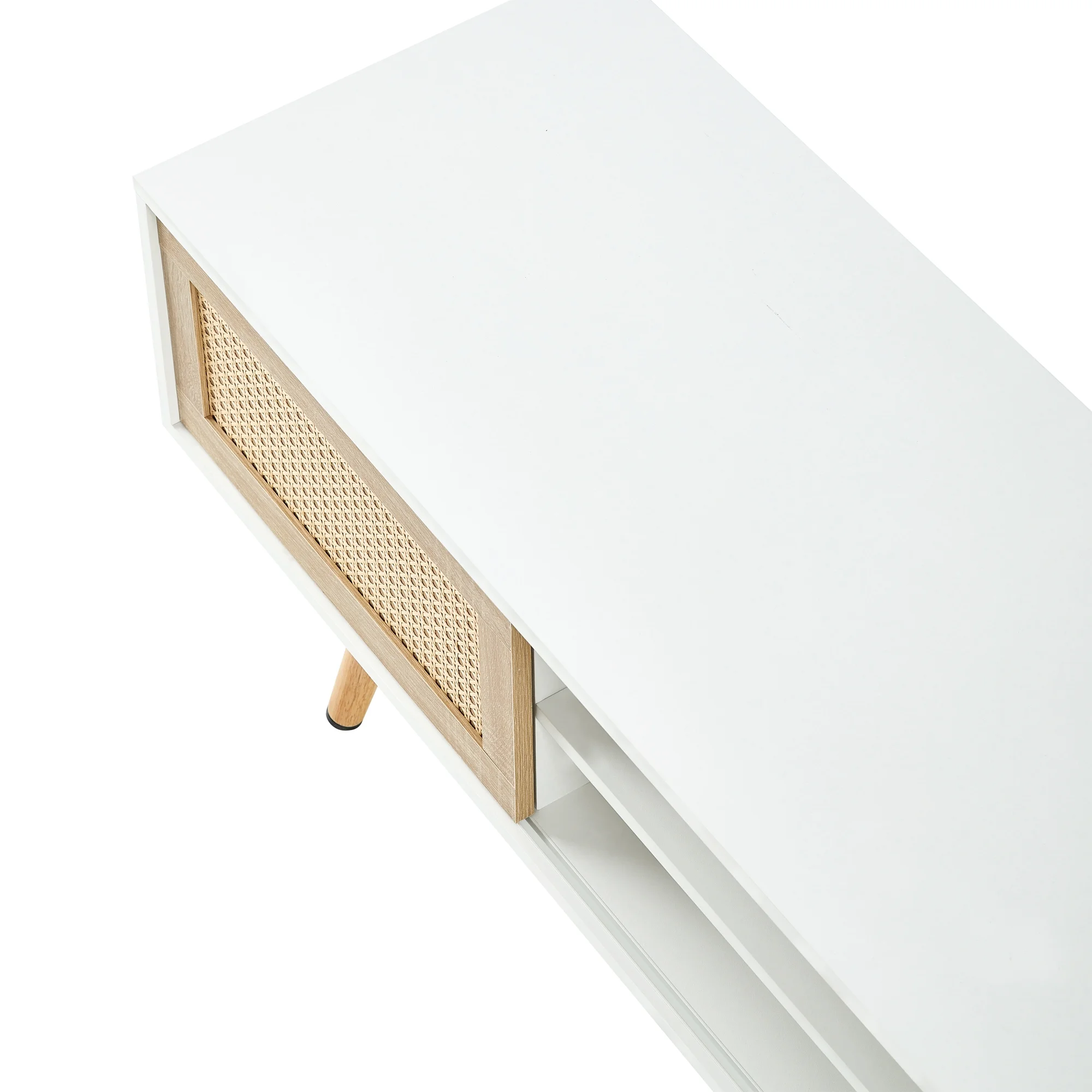 55.12" Rattan TV Cabinet with Double Sliding Doors - Adjustable Shelf, Solid Wood Legs - Stylish TV Console for Living Room - White