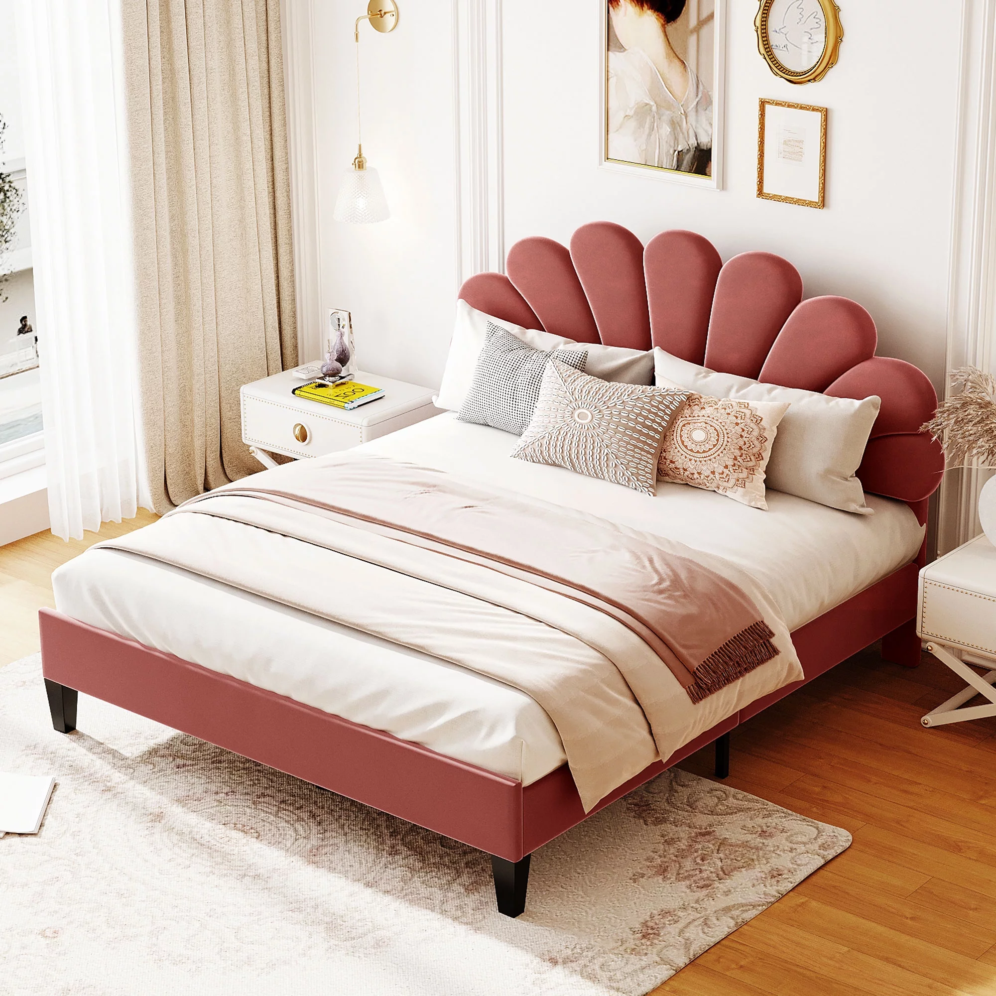 Sesslife Queen Bed Frame with Flower Pattern Headboard, Upgraded Velvet Upholstered Platform Bed with Wooden Slats, No Box Spring Needed, Queen Size Bed Frame for Adults, Holds 660lbs, Bean Paste Red