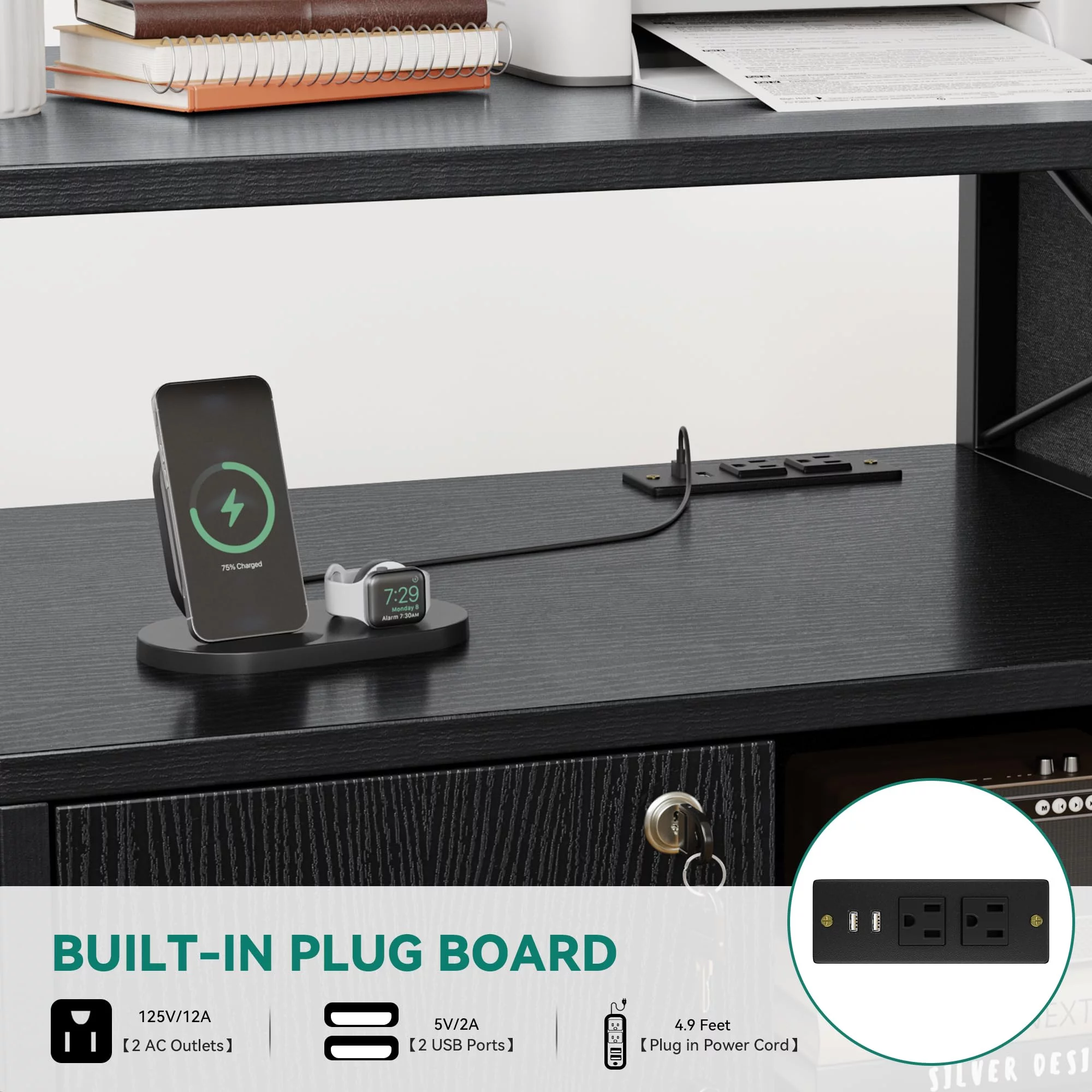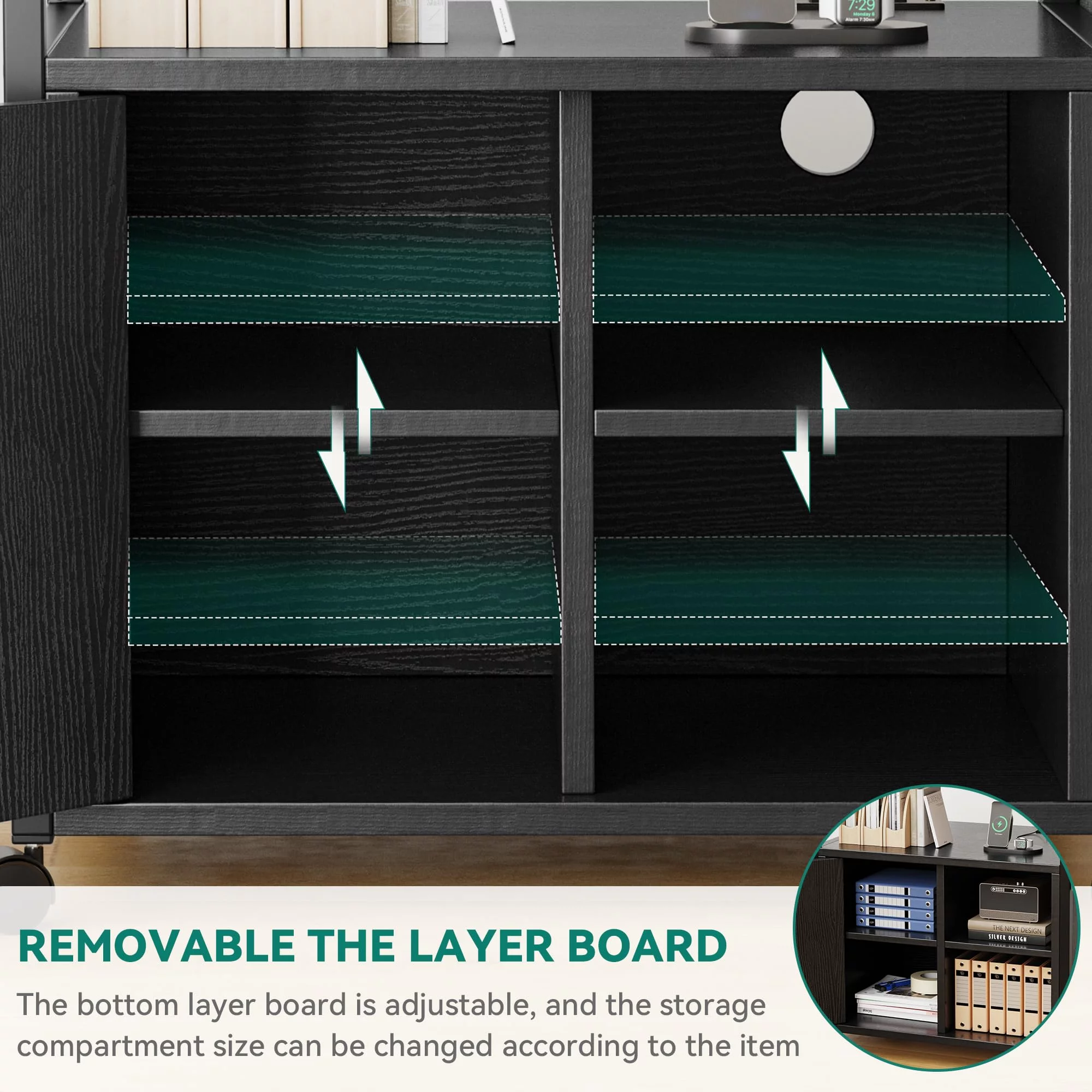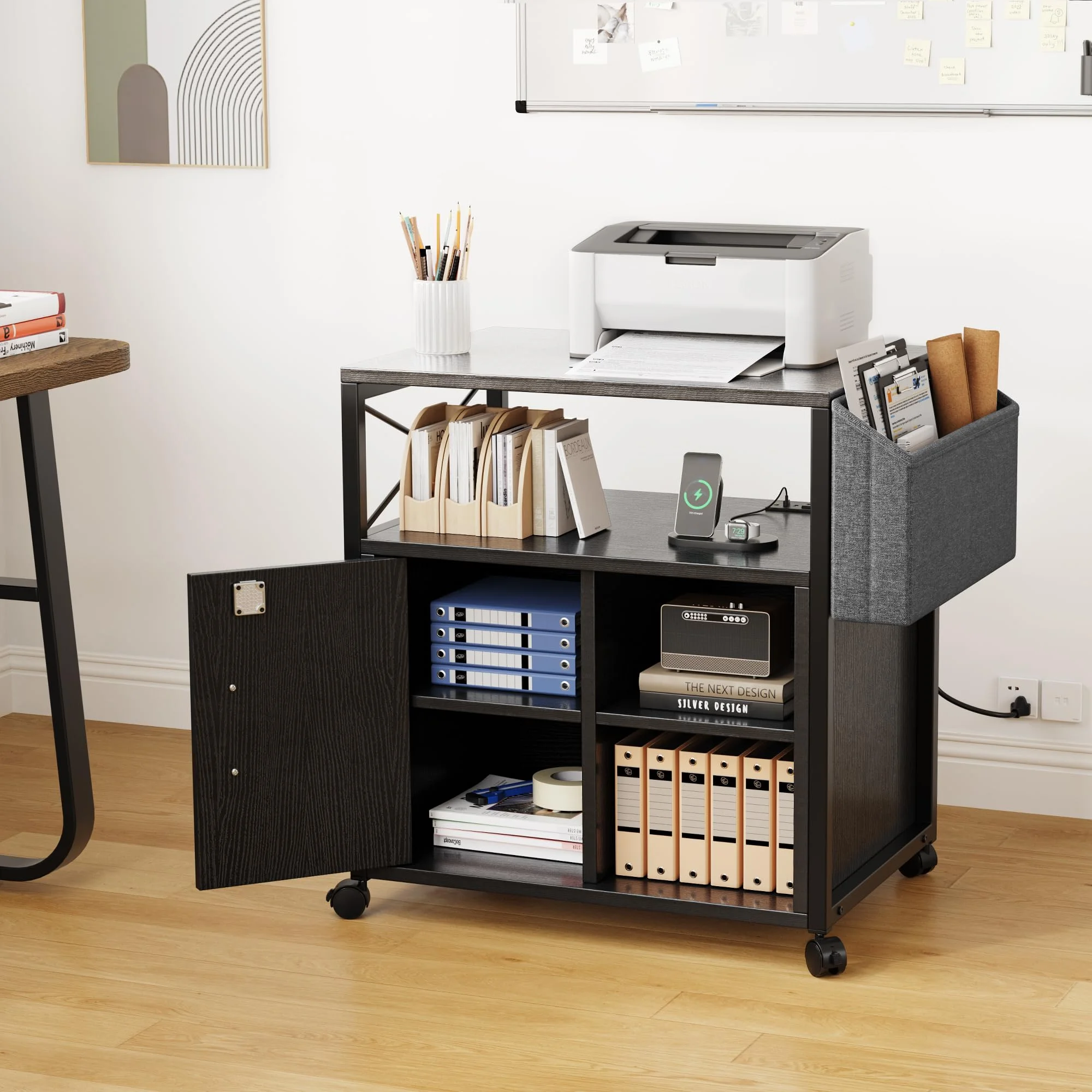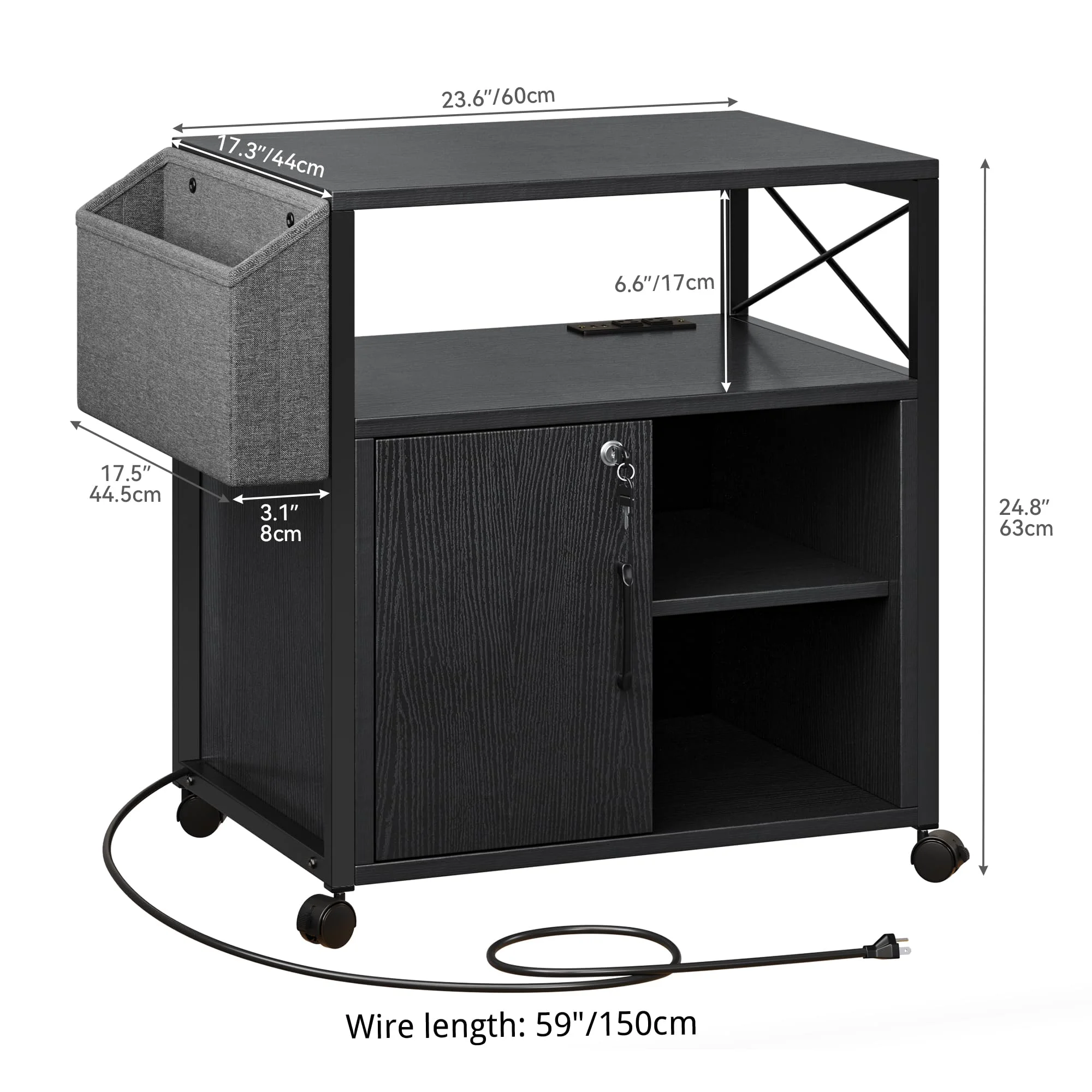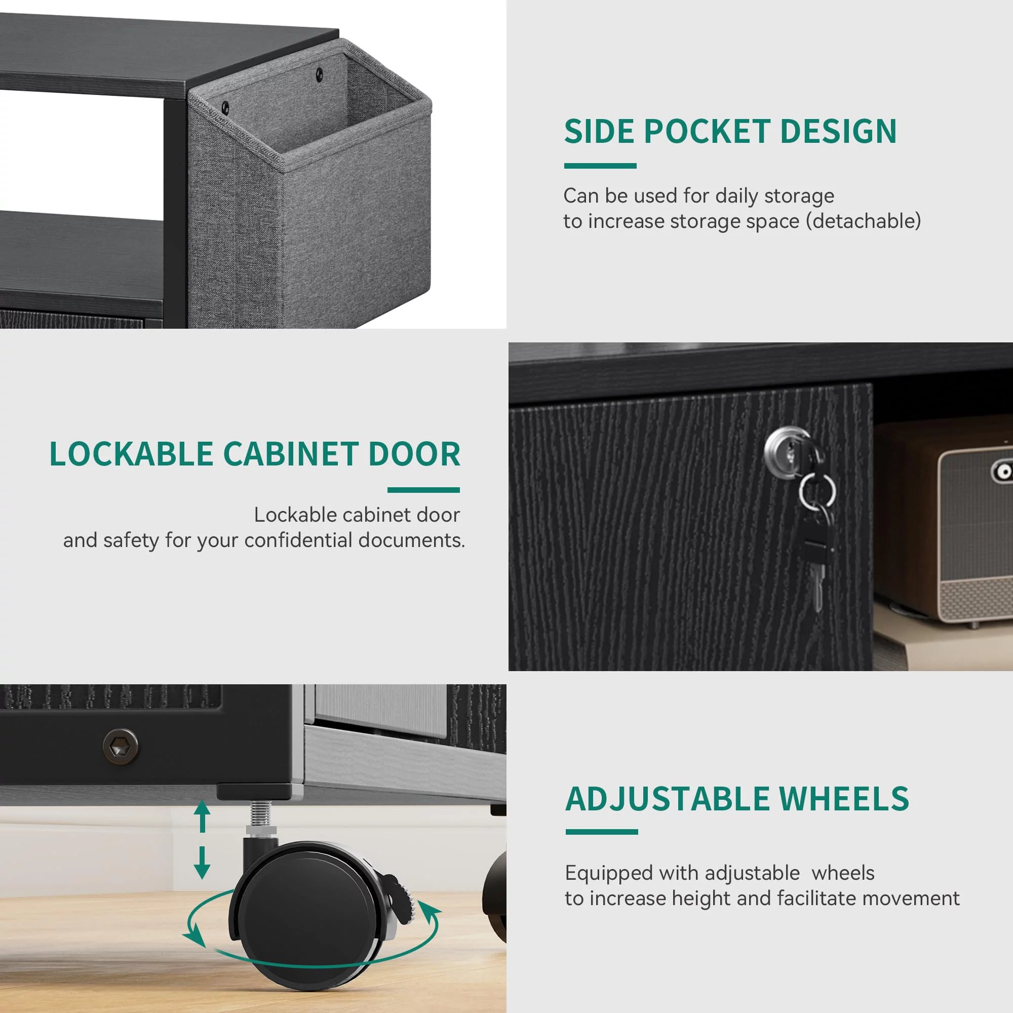 Dextrus Lateral File Cabinet, Wood Printer Stand with Charging Station, Mobile Filing Cabinet with Open Storage Shelves and Side Pocket, Fits A4, Letter, Legal Size Files, Office Furniture, Black