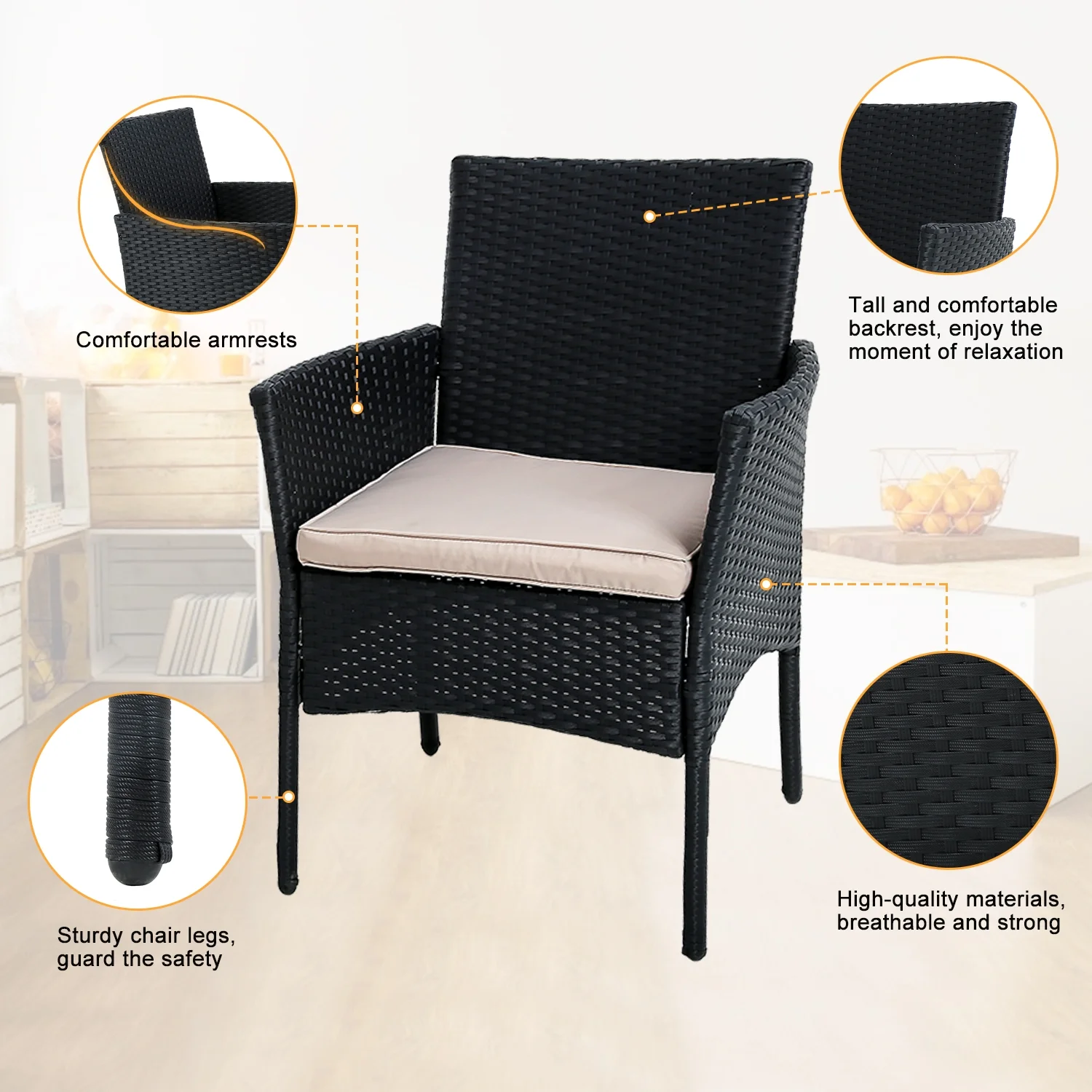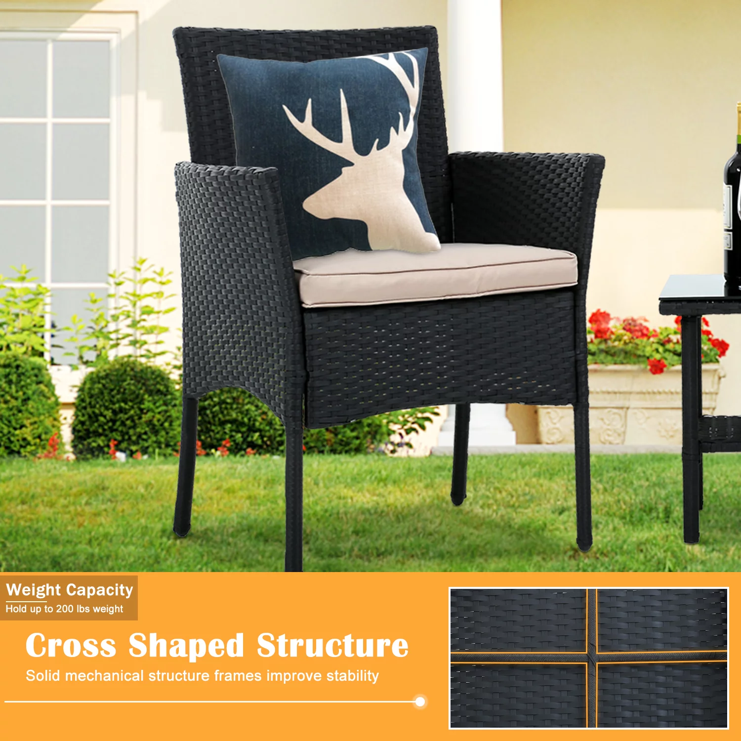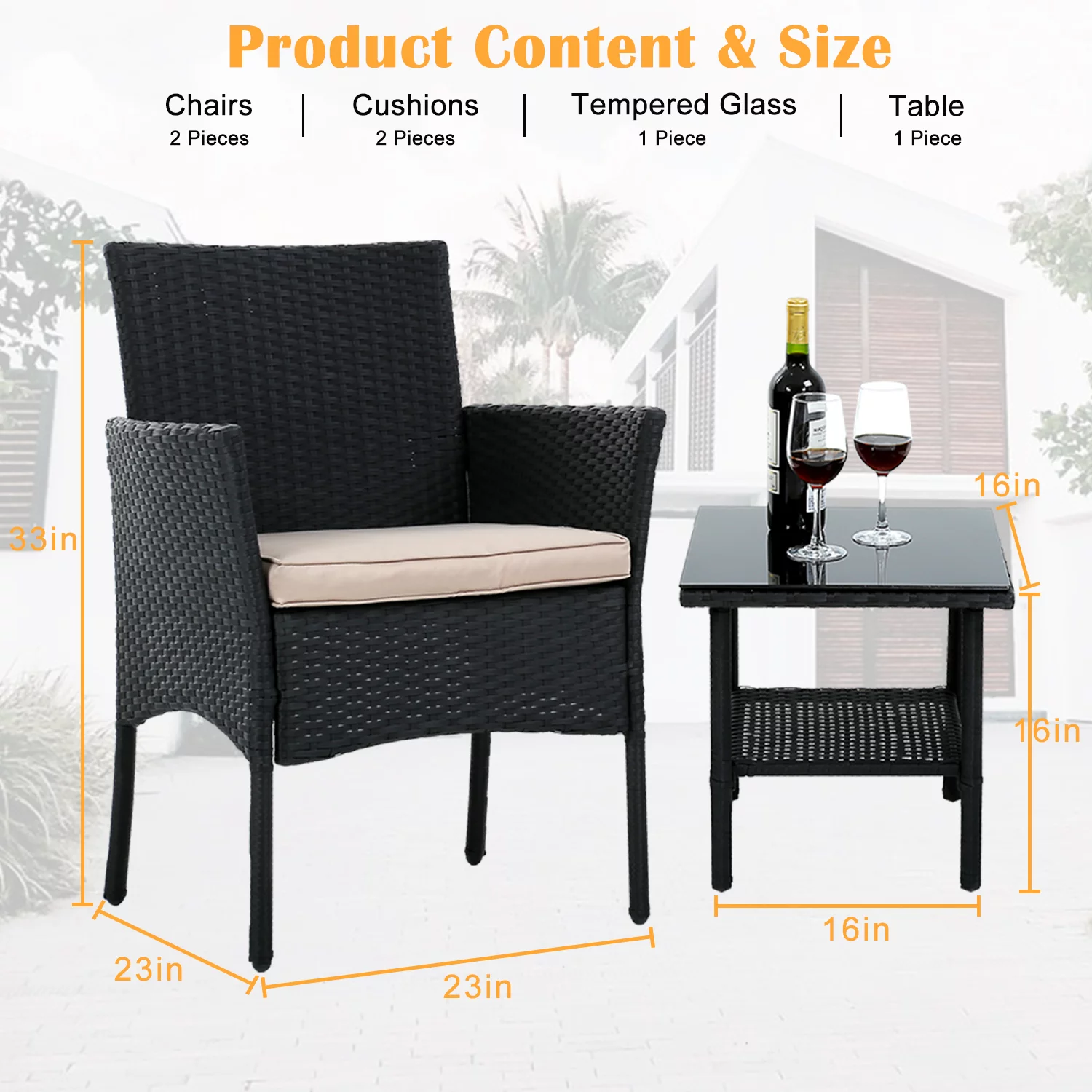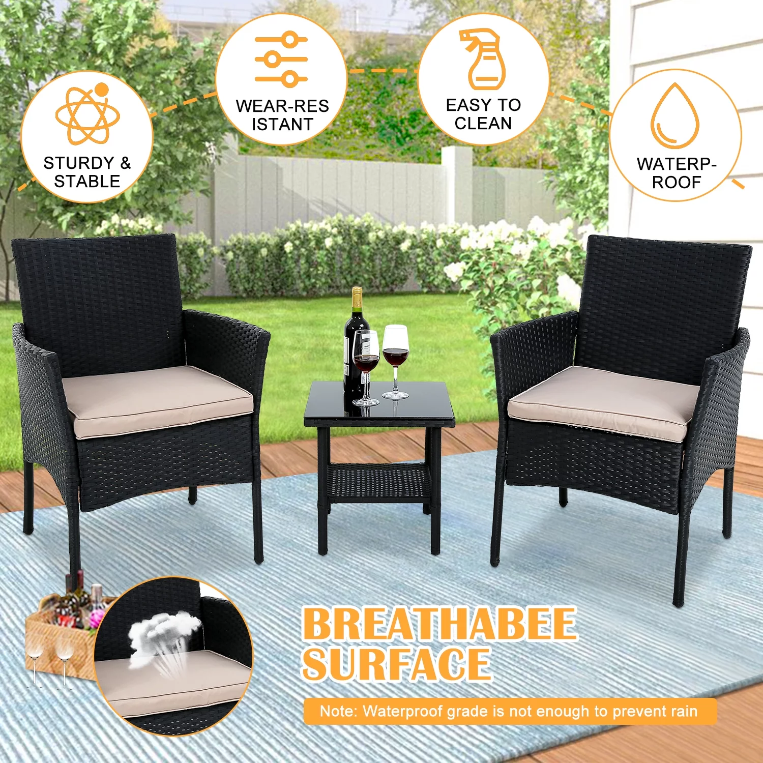 YRLLENSDAN Patio Furniture Sets,3 Pieces Patio Set Rattan Chair Wicker Bistro Set with Glass Table Rattan Chair Sets for Yard Lawn Porch (Black)