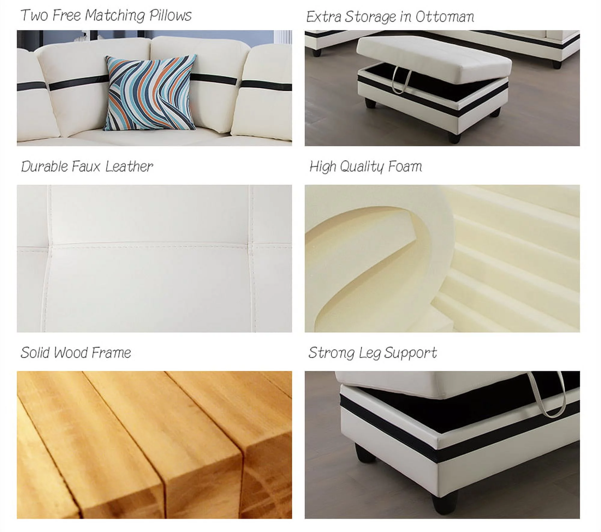 PonLiving 103.50" Wide White & Black Faux Leather Sectional with Ottoman Left Hand Facing