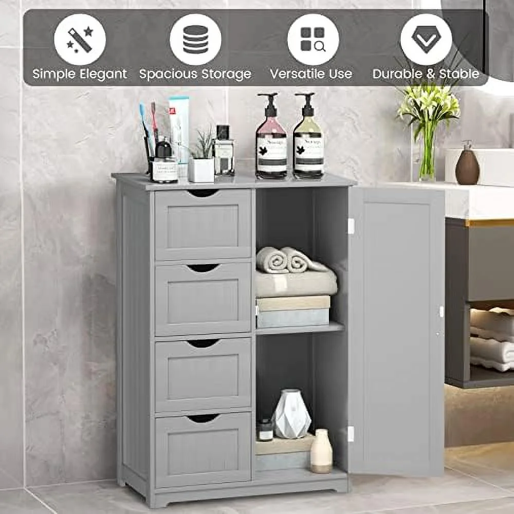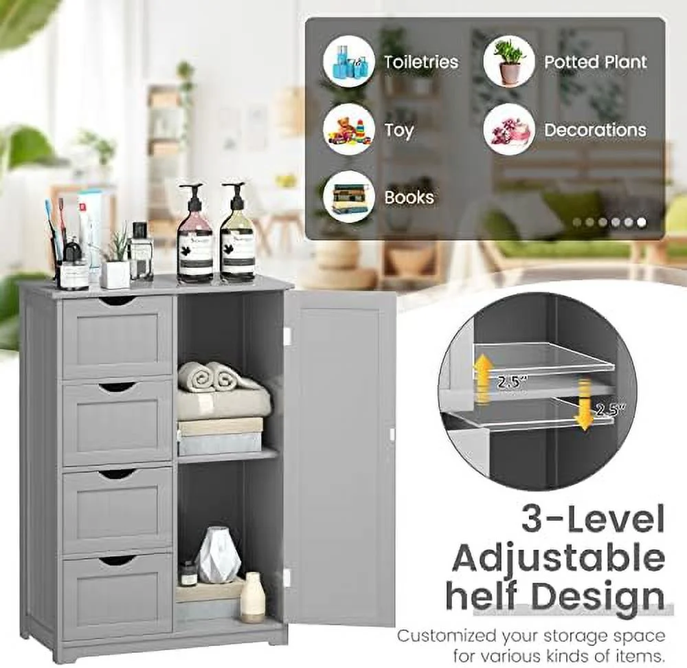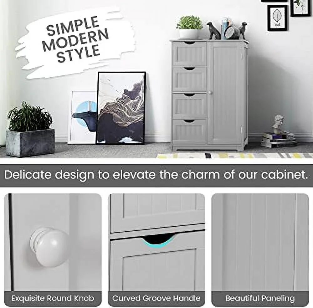 KHBIULIFE Bathroom Floor Cabinet Side Organizer Cabinet w/ 1 Cupboard and 4 Drawers Wooden Free Standing Cabinet w/Adjustable in 3 Positions for Living Room Bathroom Grey