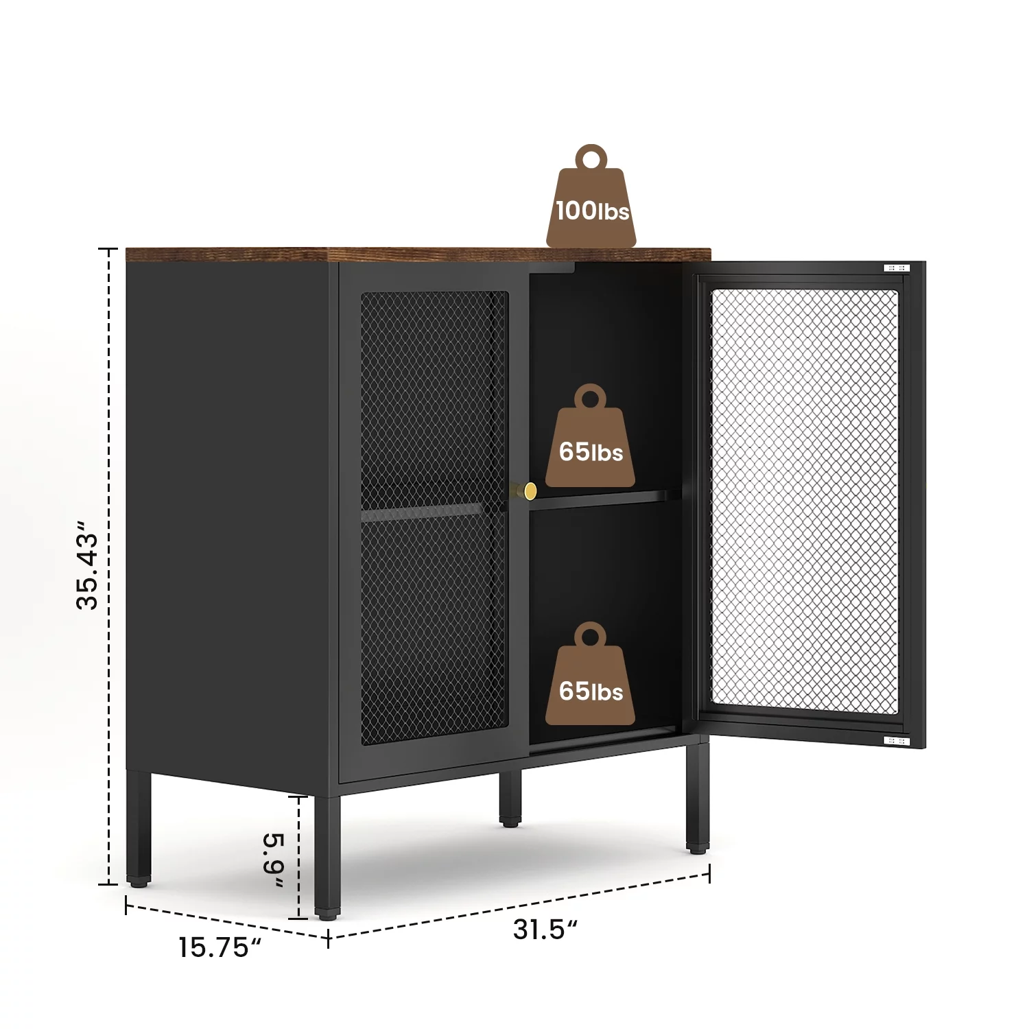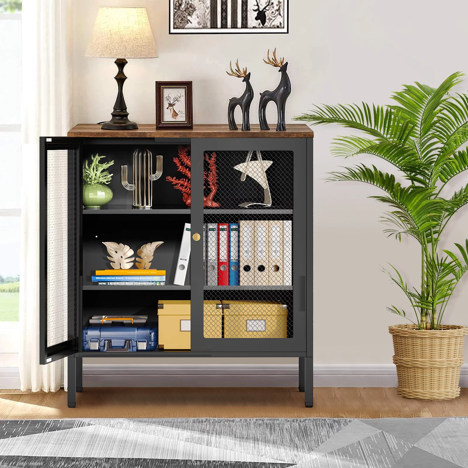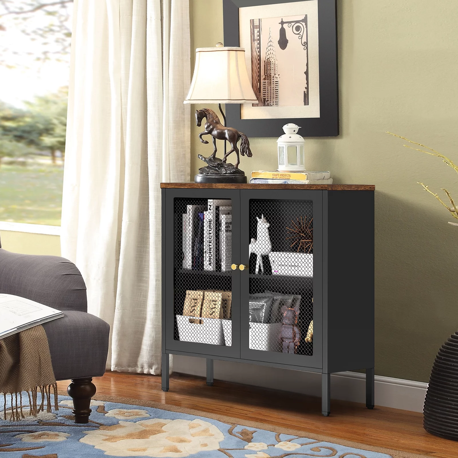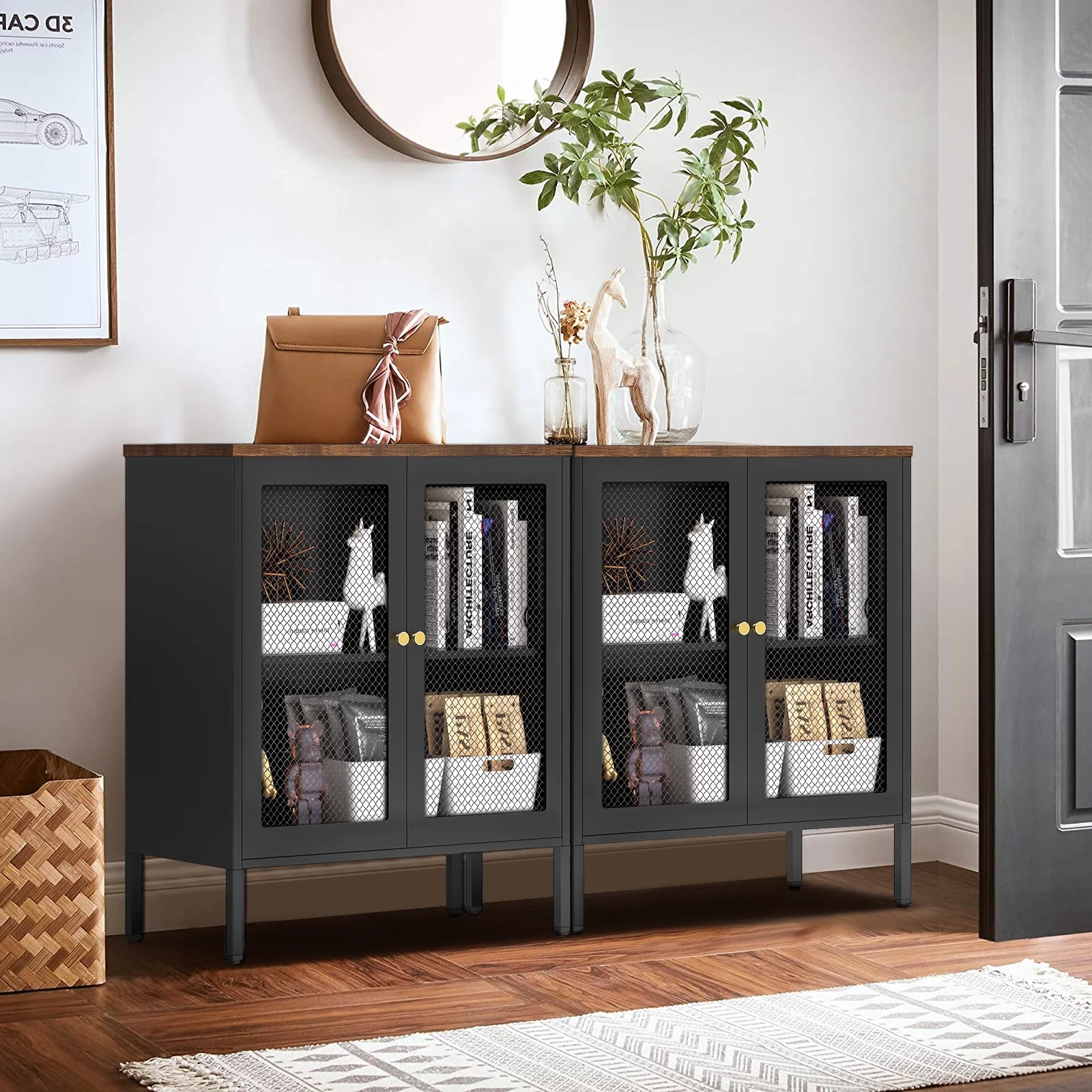 Kavey Metal Storage Cabinet with 2 Mesh Doors, Rustic Steel Storage Sideboard Accent Cabinet, with Adjustable Shelf and 2 Magnetic Mesh Doors, for Hallway, Entryway, Bathroom, Living Room, Bedroom