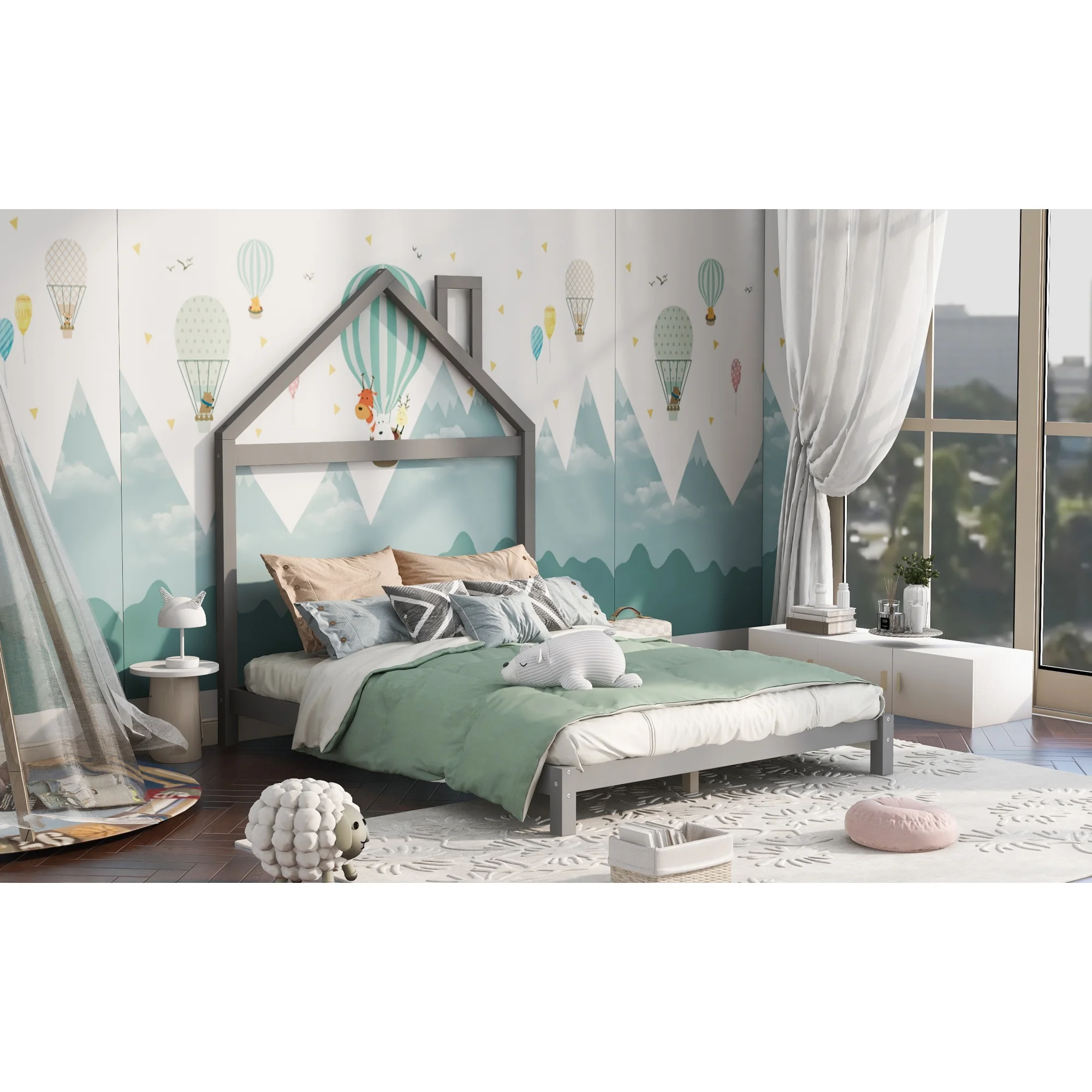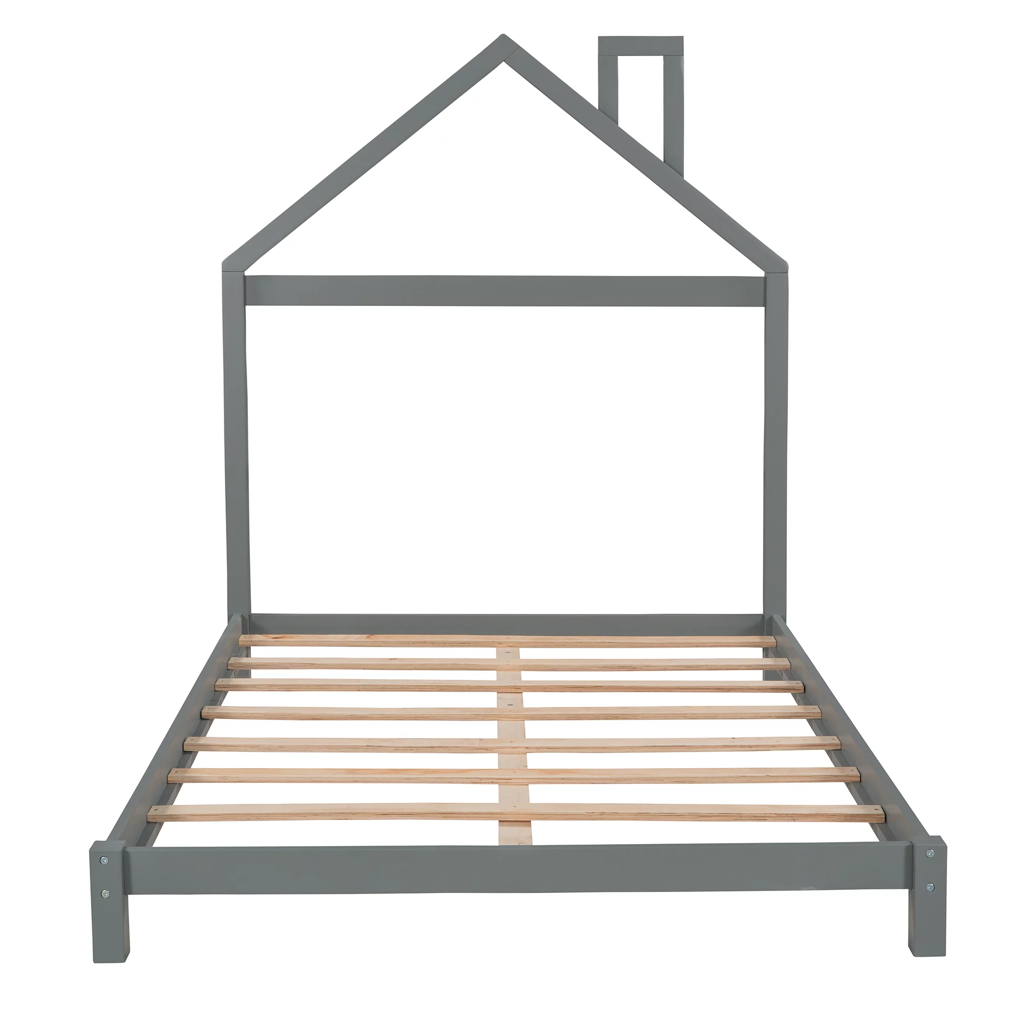 Full Size Wood Platform Bed with House-shaped Headboard, Gray