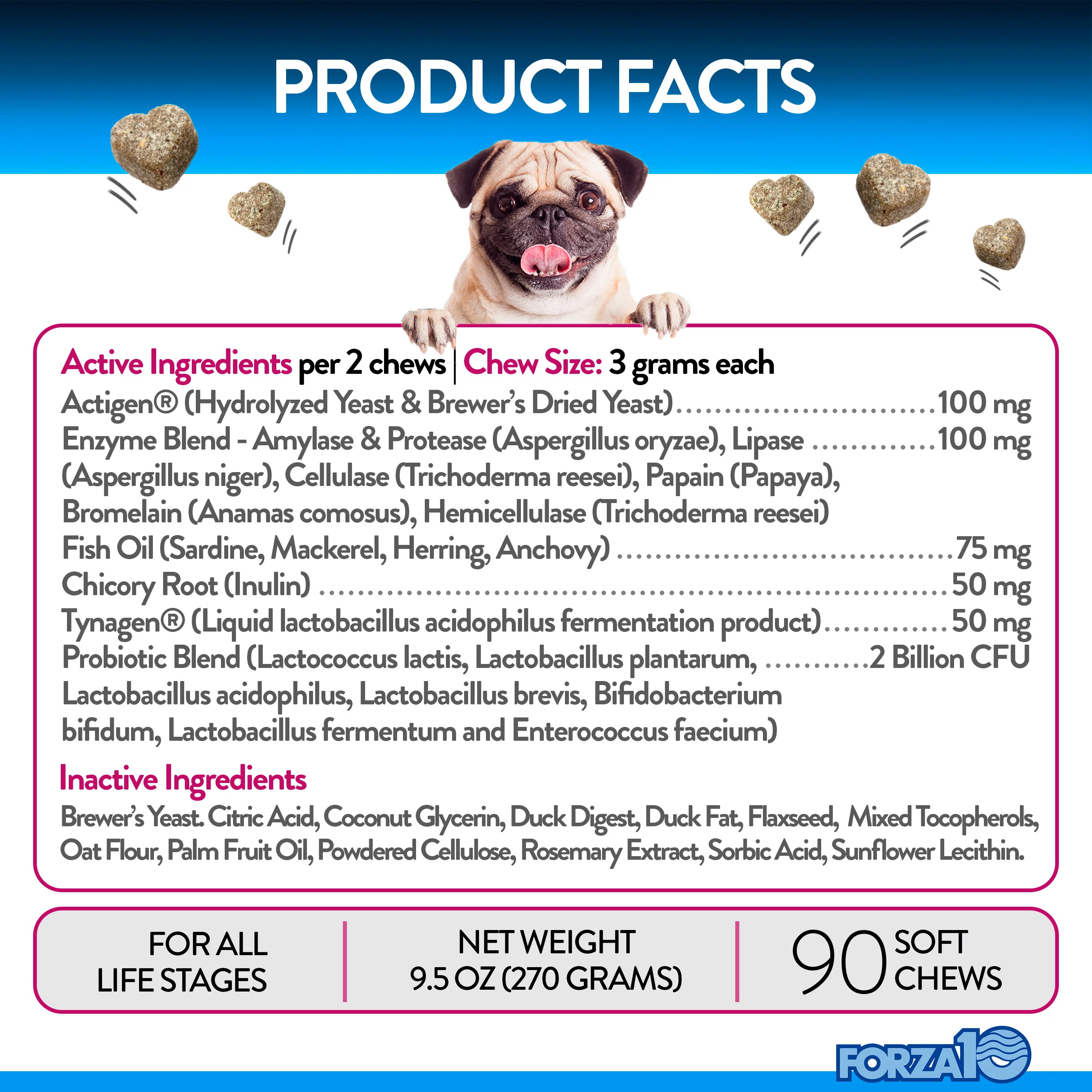 Forza10 Dog Probiotics and Digestive Enzymes Chews Supplements, Duck Flavor Probiotics for Dogs Digestive Health and Gut, Pet Probiotics for Dogs with Diarrhea, Dog Gas Relief, Upset Stomach, 90 Ct.