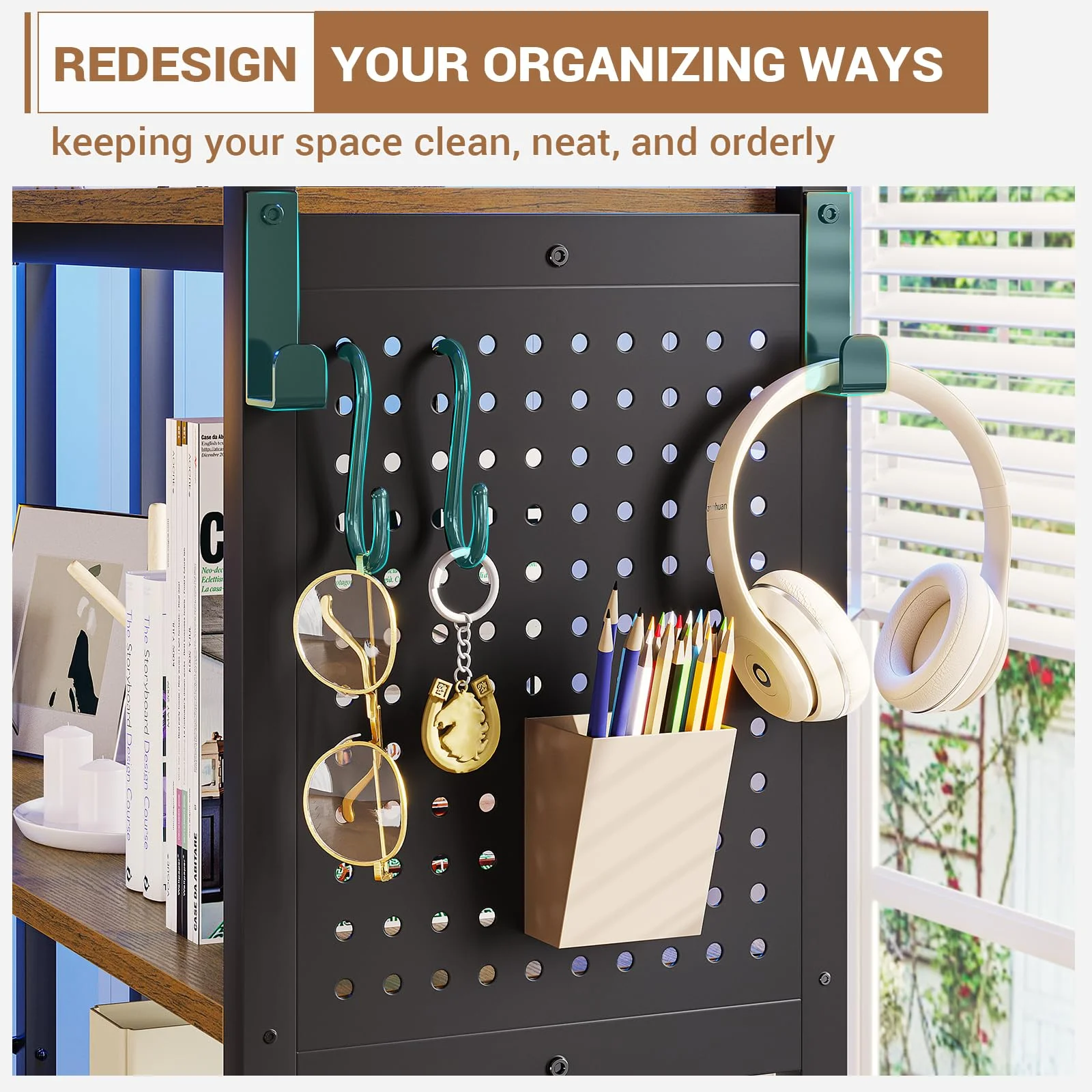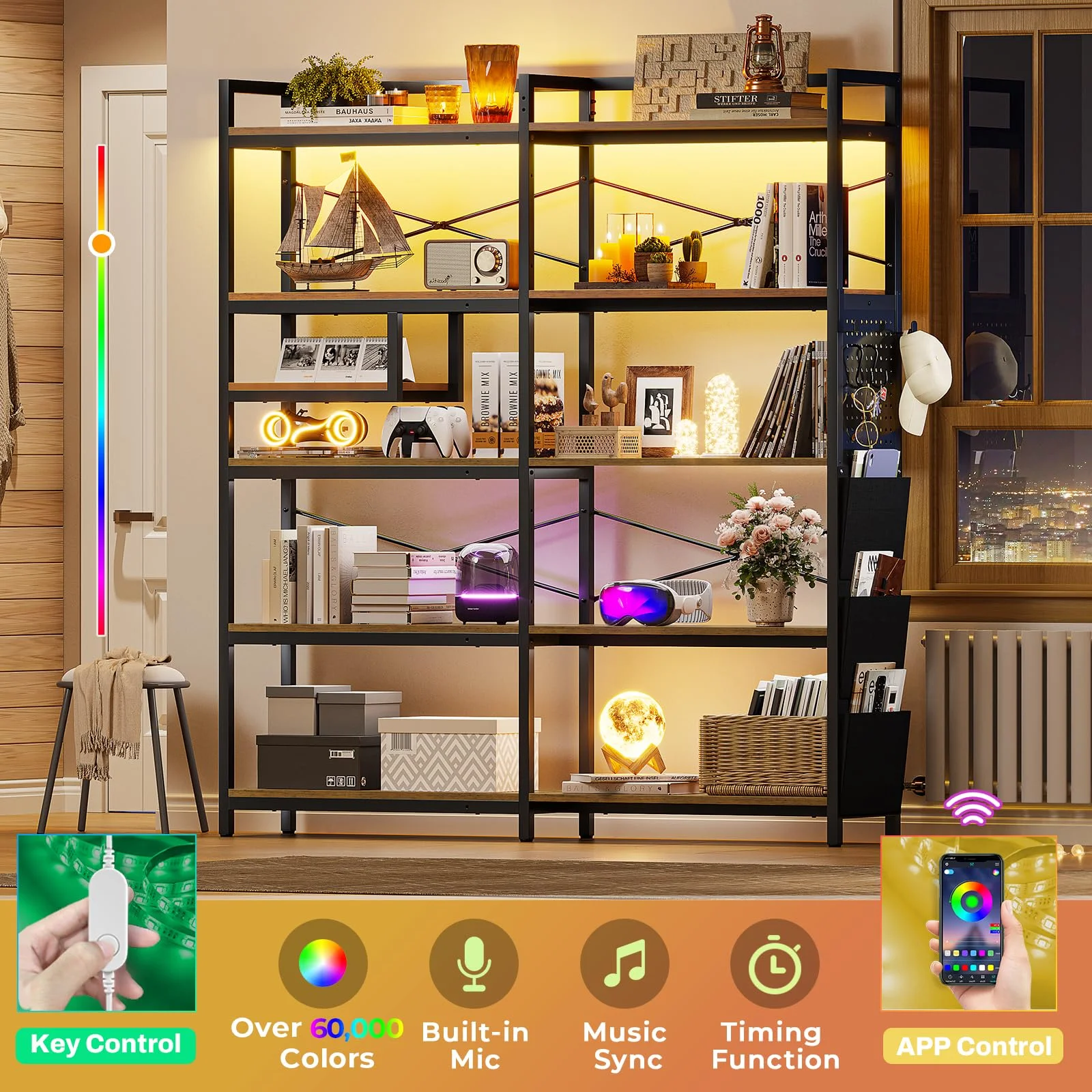Afuhokles 5-Tier Bookshelf, Convertible Corner Bookshelf with Storage, Tall Bookshelf with Pegboard, Storage Bag and LED Light, Rustic Brown