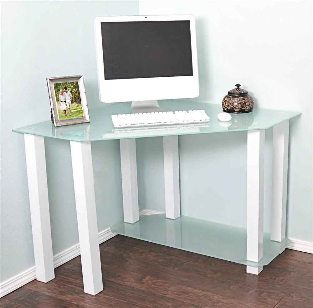 RTA Home & Office Frosted Tempered Glass Gloss White Corner Computer Desk