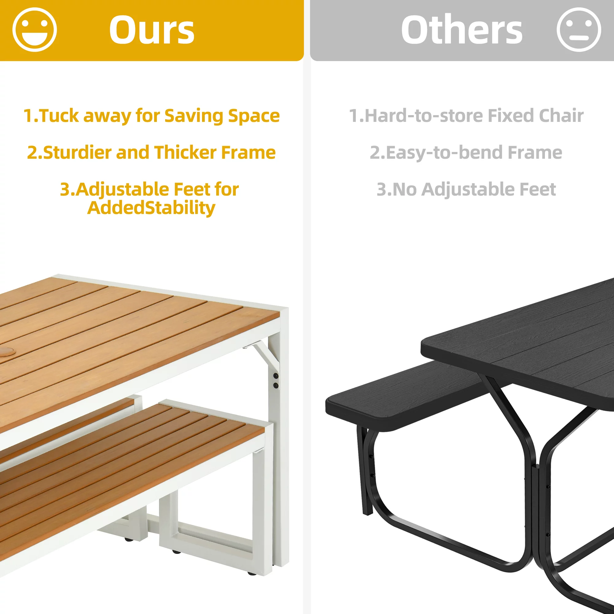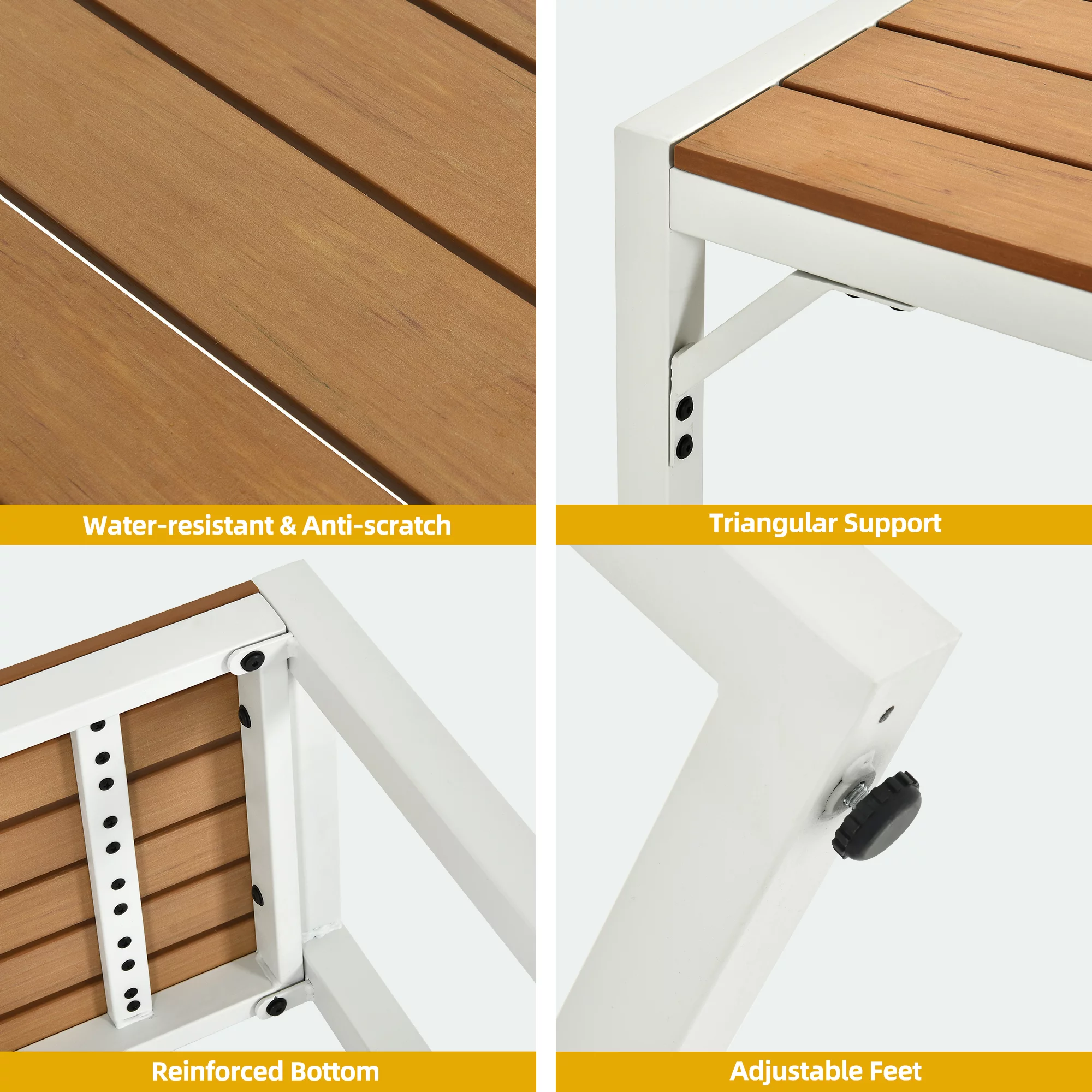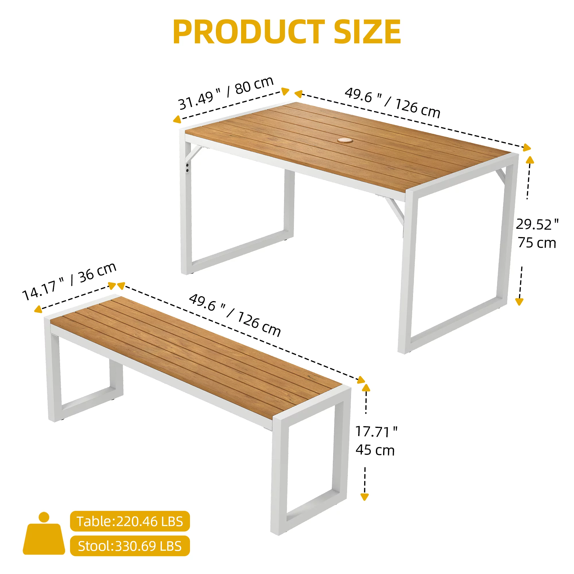 DWVO 3 Pieces Patio Dining Table Set, 2 Dining Bench and Wood Dining Table for 4-6 People - White & Wood
