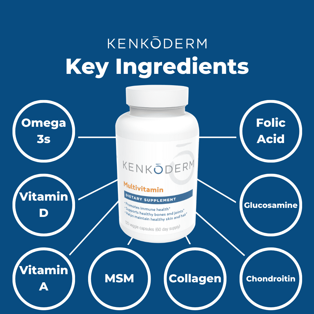 Kenkoderm Multivitamin for Psoriasis | Omega 3 | Vitamin D | Glucosamine Chondroitin | Collagen | Vitamin A | Folic Acid | MSM | 120 Veggie Capsules | 60 Day Supply