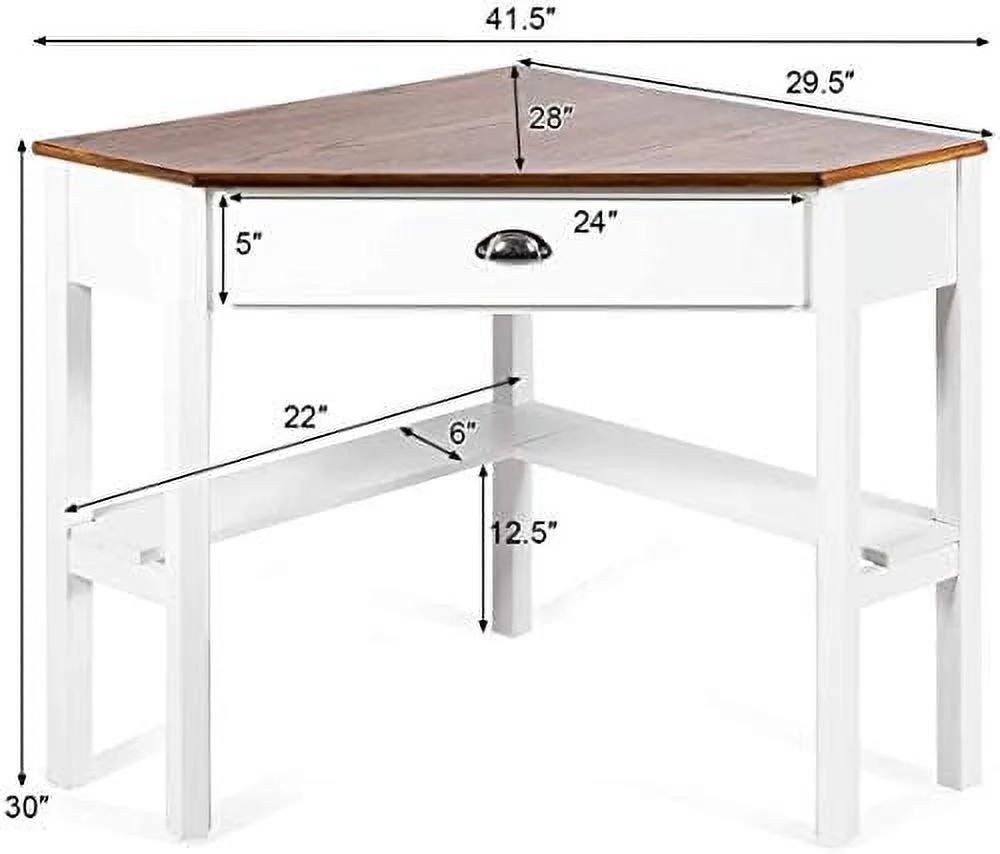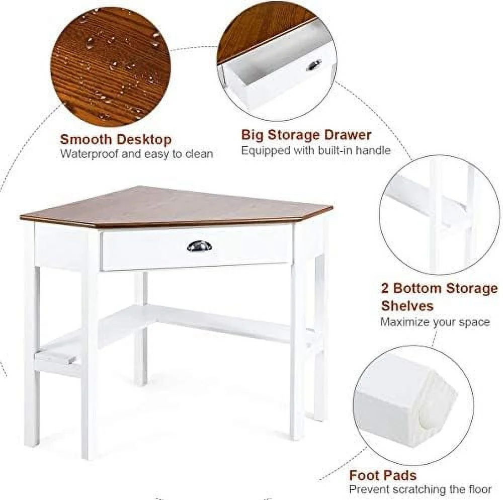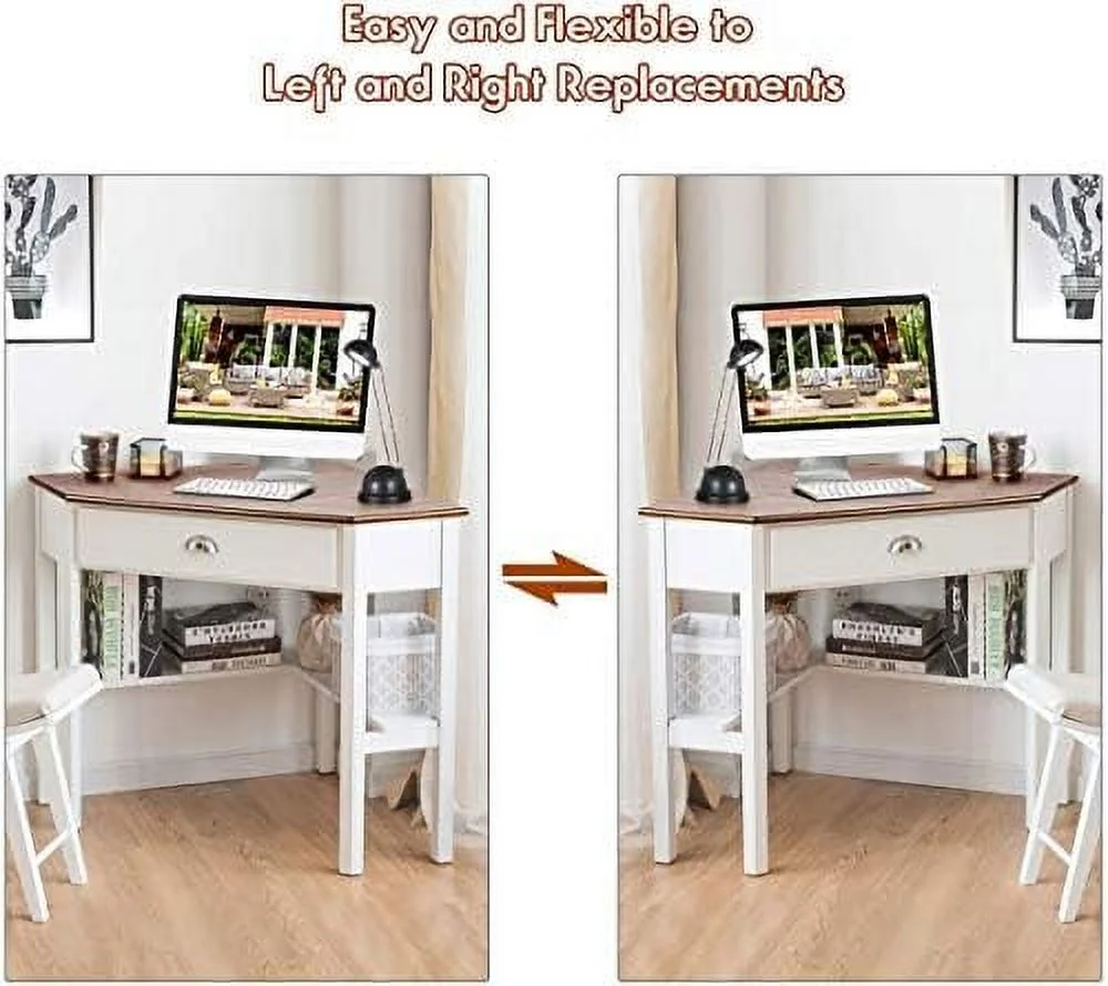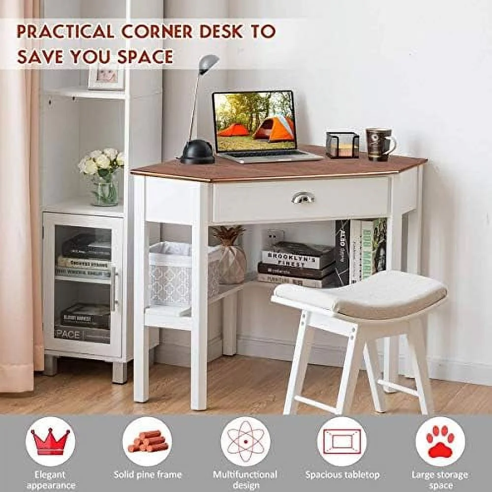 xrboomlife Corner Desk for Small Space Wood Corner Computer Desk Compact Writing Table w/Drawer & Shelves Space Saving Study Workstation Laptop PC Corner Table for Home Office