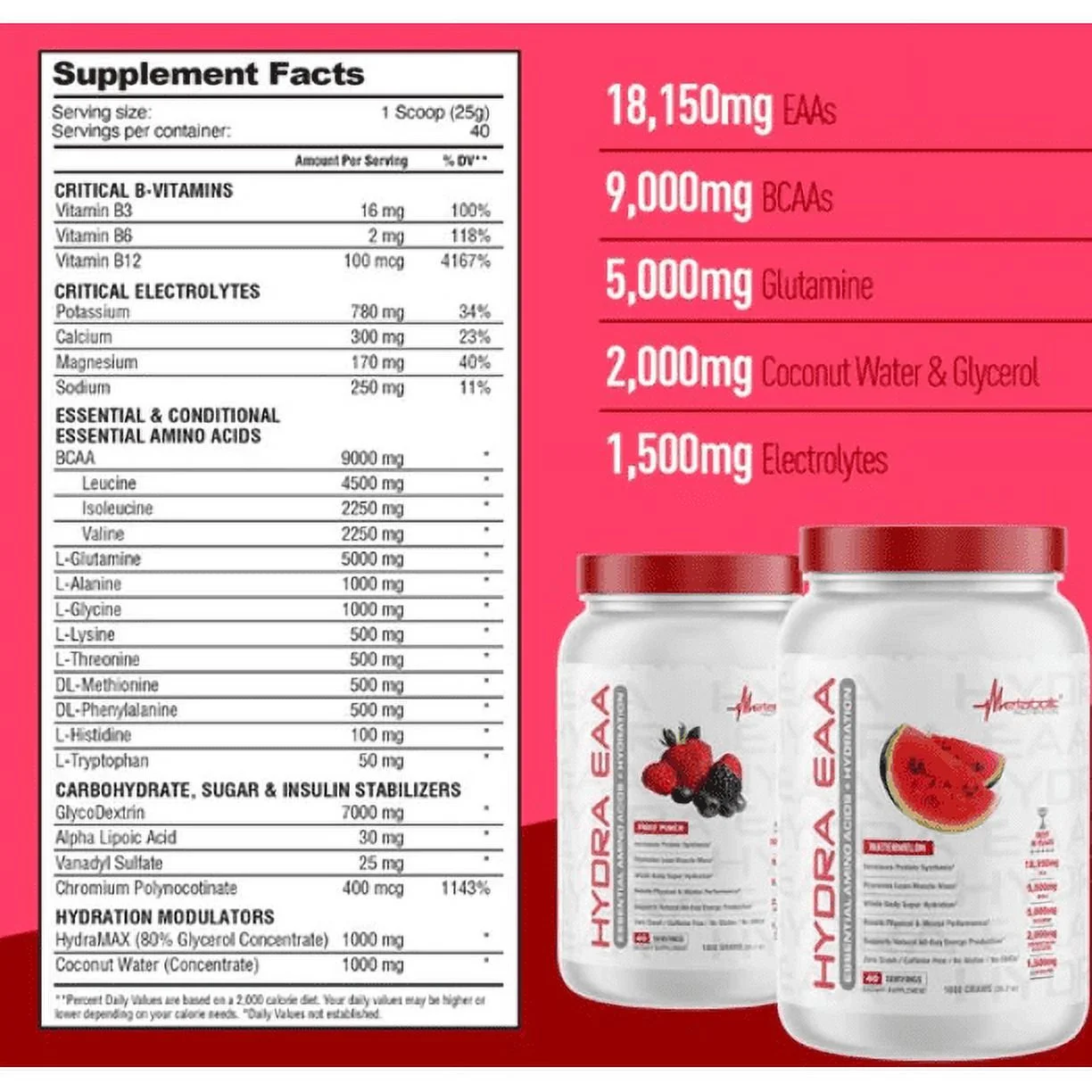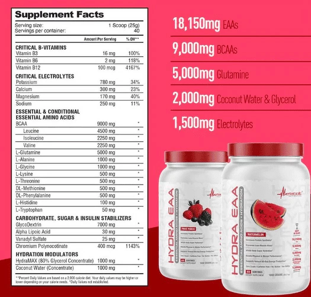 Metabolic Nutrition Hydra EAA Pre-Workout Essential Amino Acid Hydration Build Muscle Mass Caffeine Free Watermelon Flavor (40 Servings) 35.2oz *EN