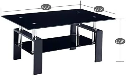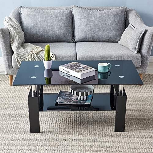 KHBIULIFE 43.3 Inch Rectangle Glass Black Coffee Table Clear Coffee Table,Modern Side Center Tables for Living Room with Solid Wooden feet (Black-Round)