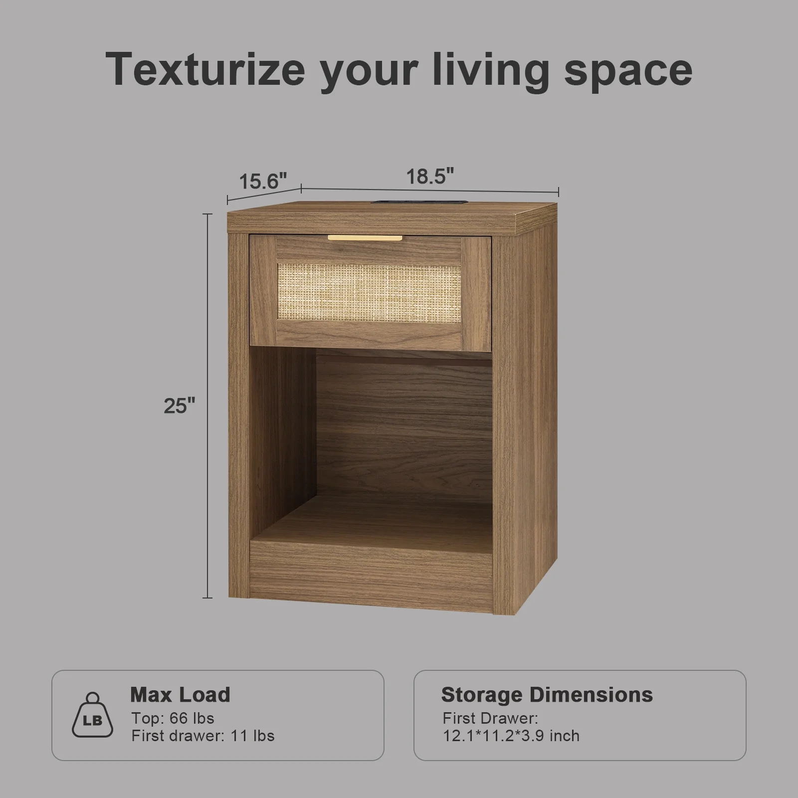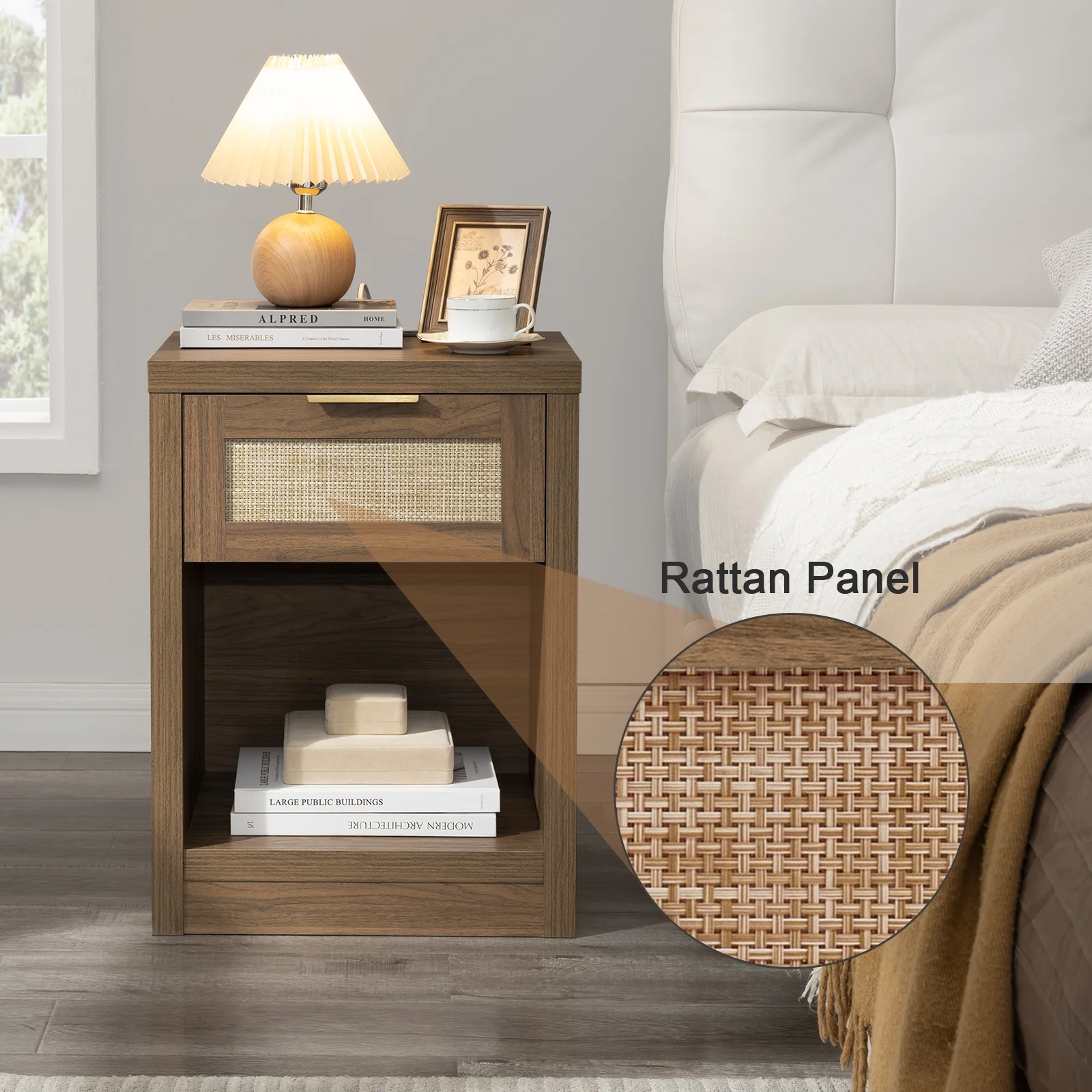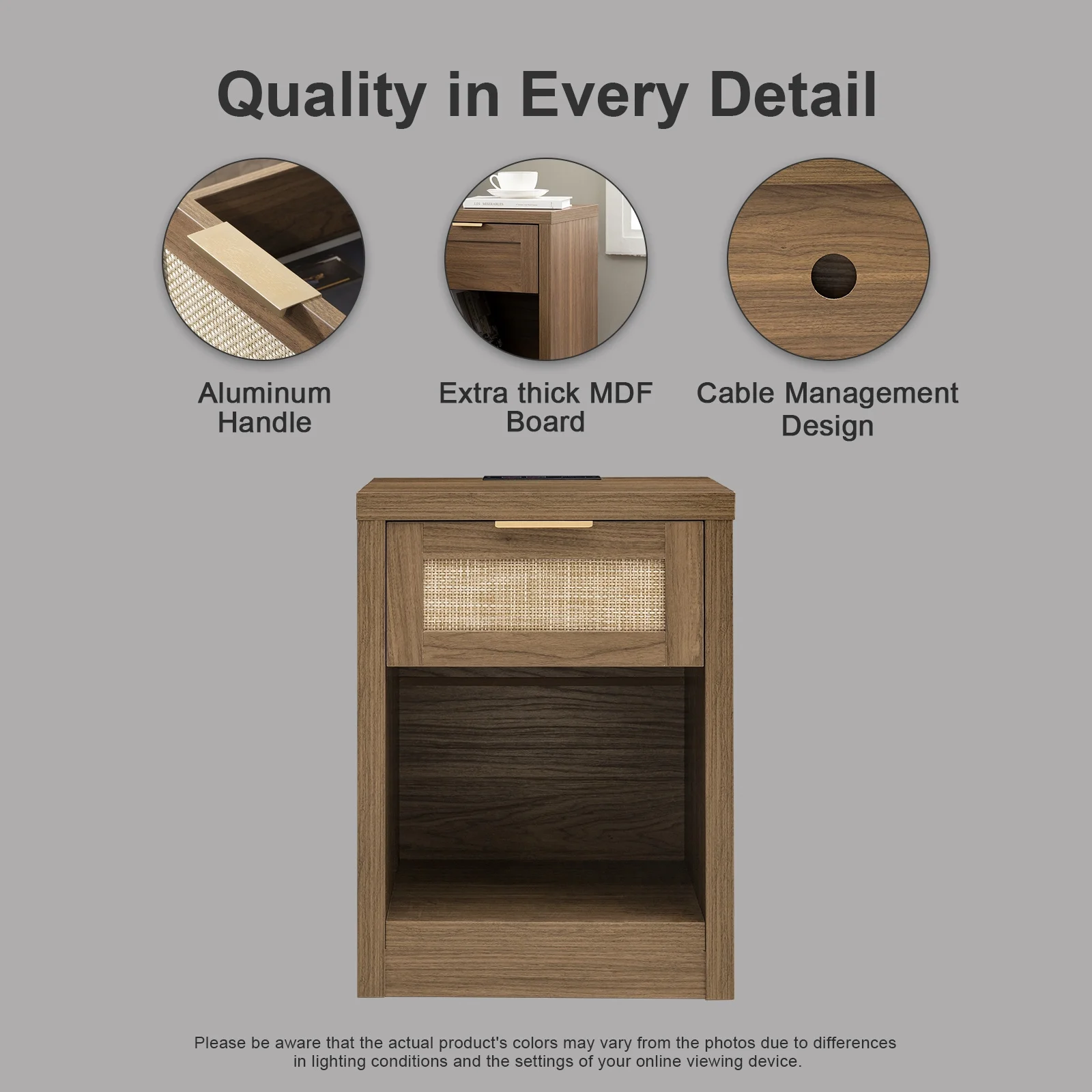 OAKHAM Rattan Nightstands Set of 2 with Charging Station, Boho Bedside Table with Drawers, End Table for Living Room, Bedroom, Special Walnut