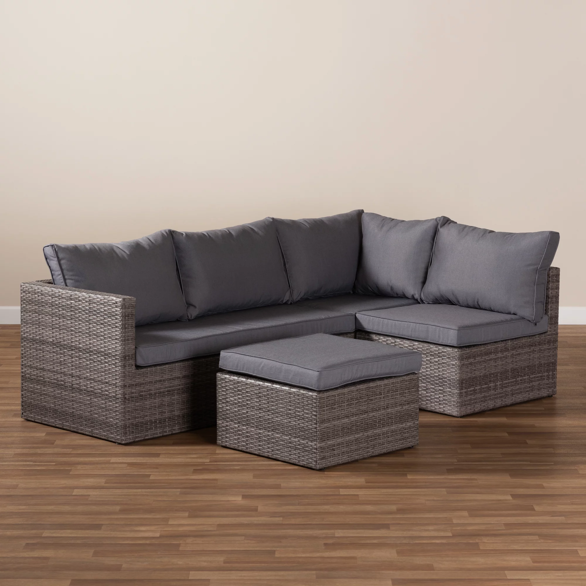 Baxton Studio Pamela Modern And Contemporary Grey Polyester Upholstered And Brown Finished 4-Piece Woven Rattan Outdoor Patio Set
