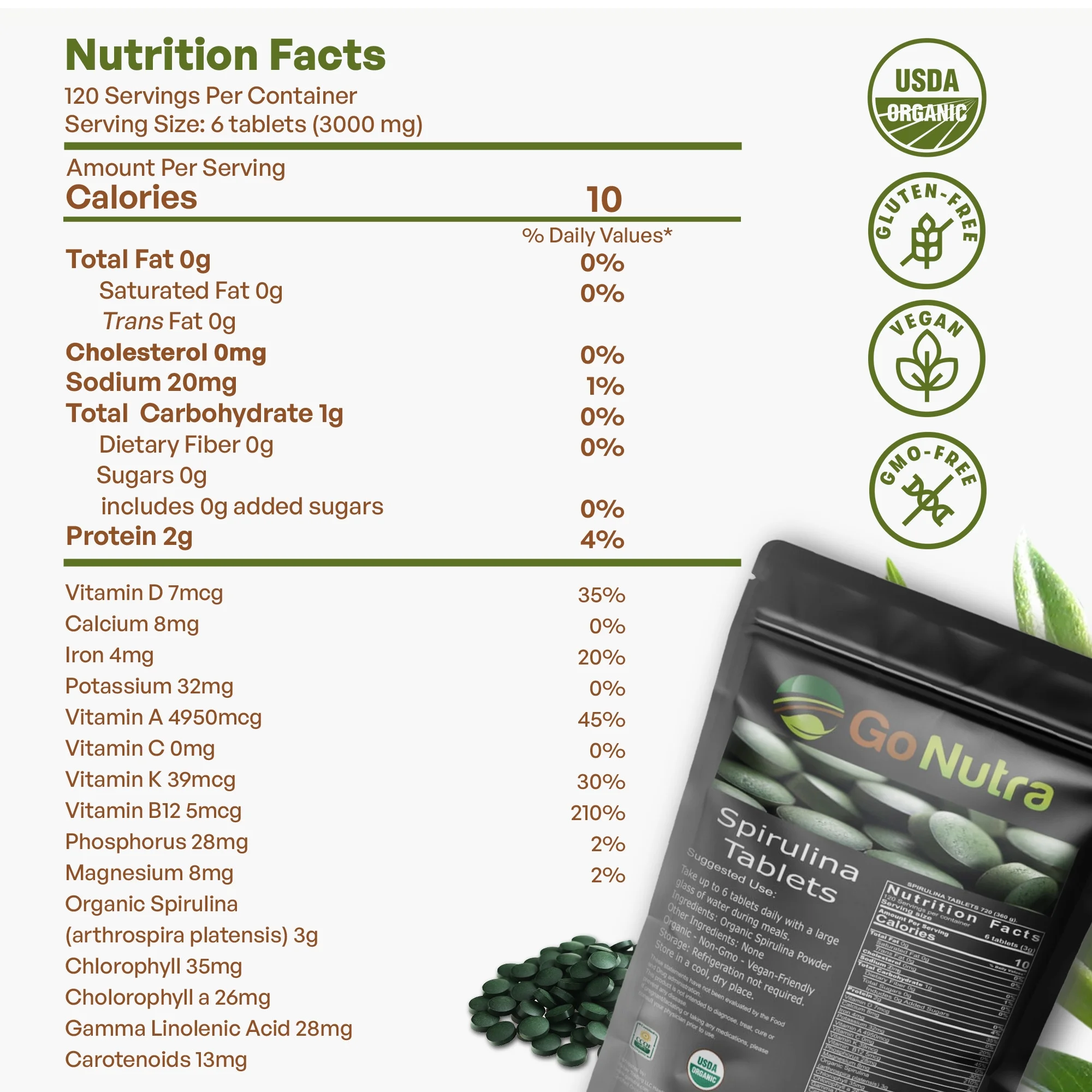 Spirulina Tablets Organic, 3000mg Per Serving | 720 Tablets | Superfoods | Go Nutra