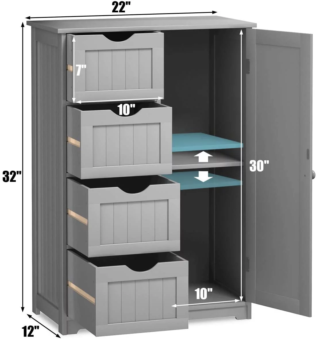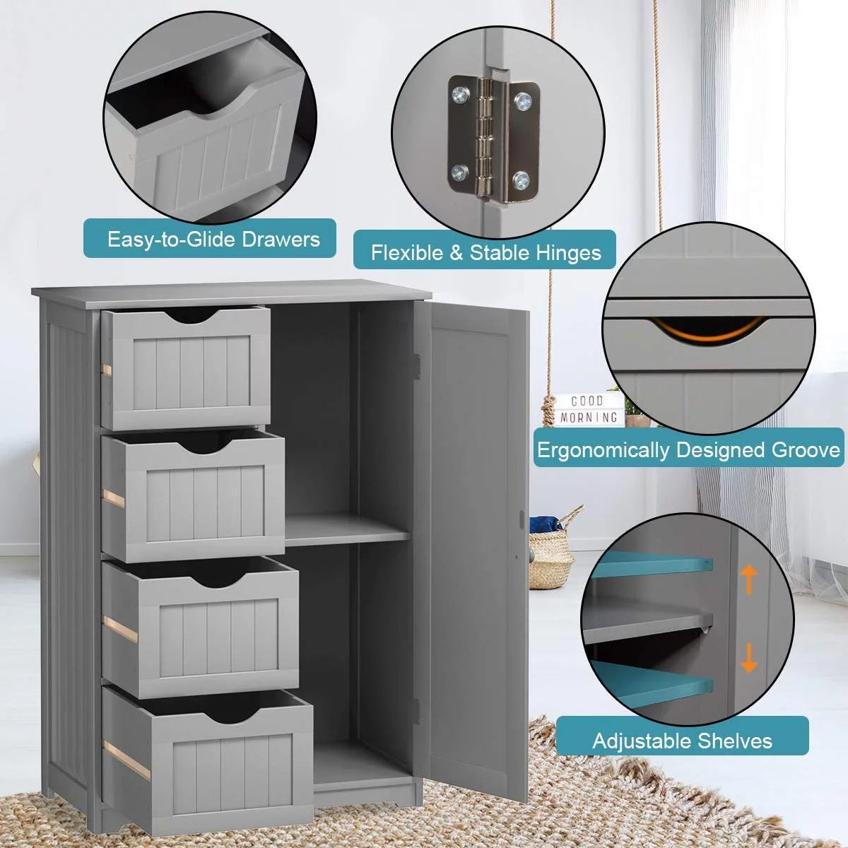 Bathroom Storage Cabinet Freestanding, Floor Cabinet with 4 Drawers & 1 Cupboard, 3-Level Adjustable Shelf & Anti-Toppling Device, Entryway Storage Unit Console Table, Storage Organizer(Gray)