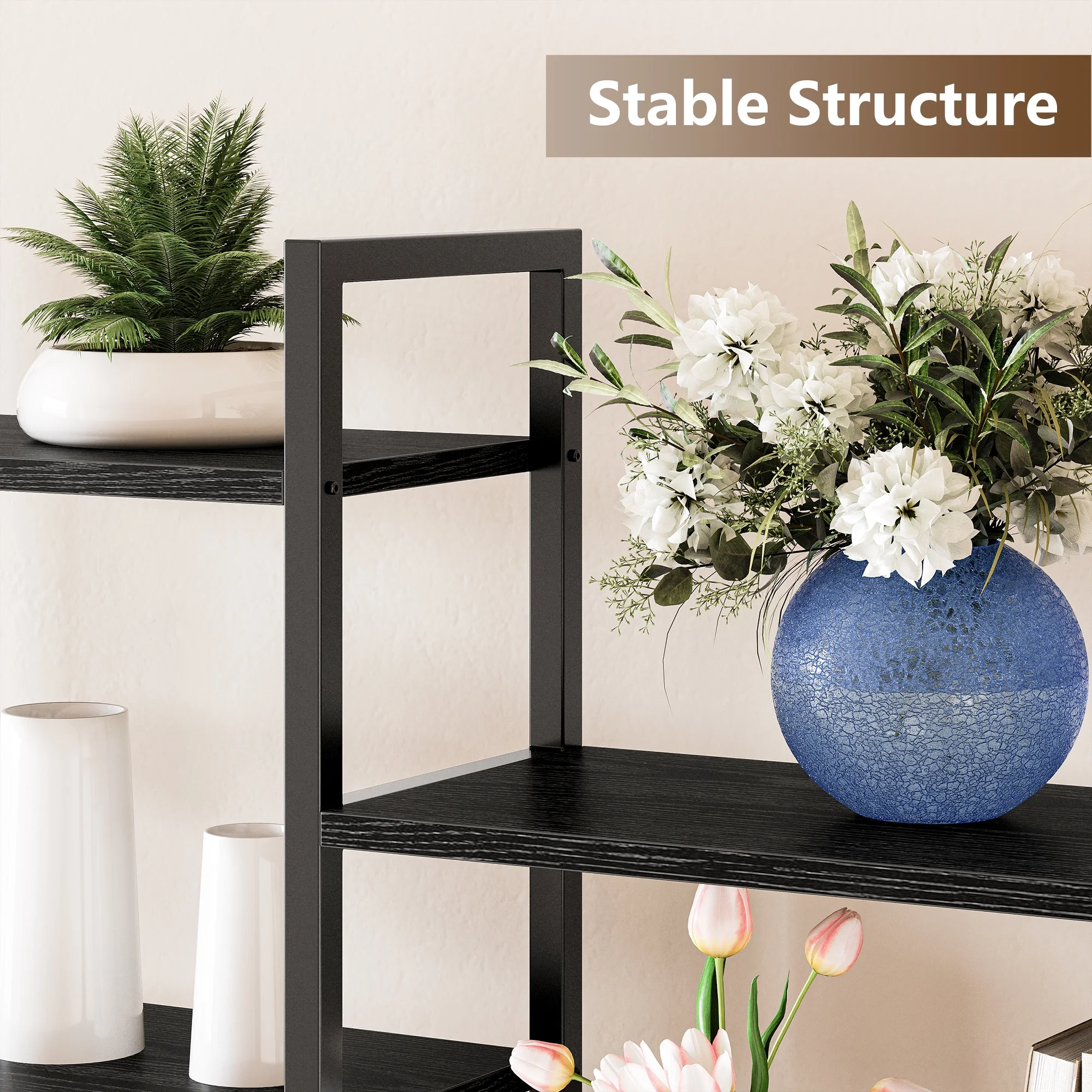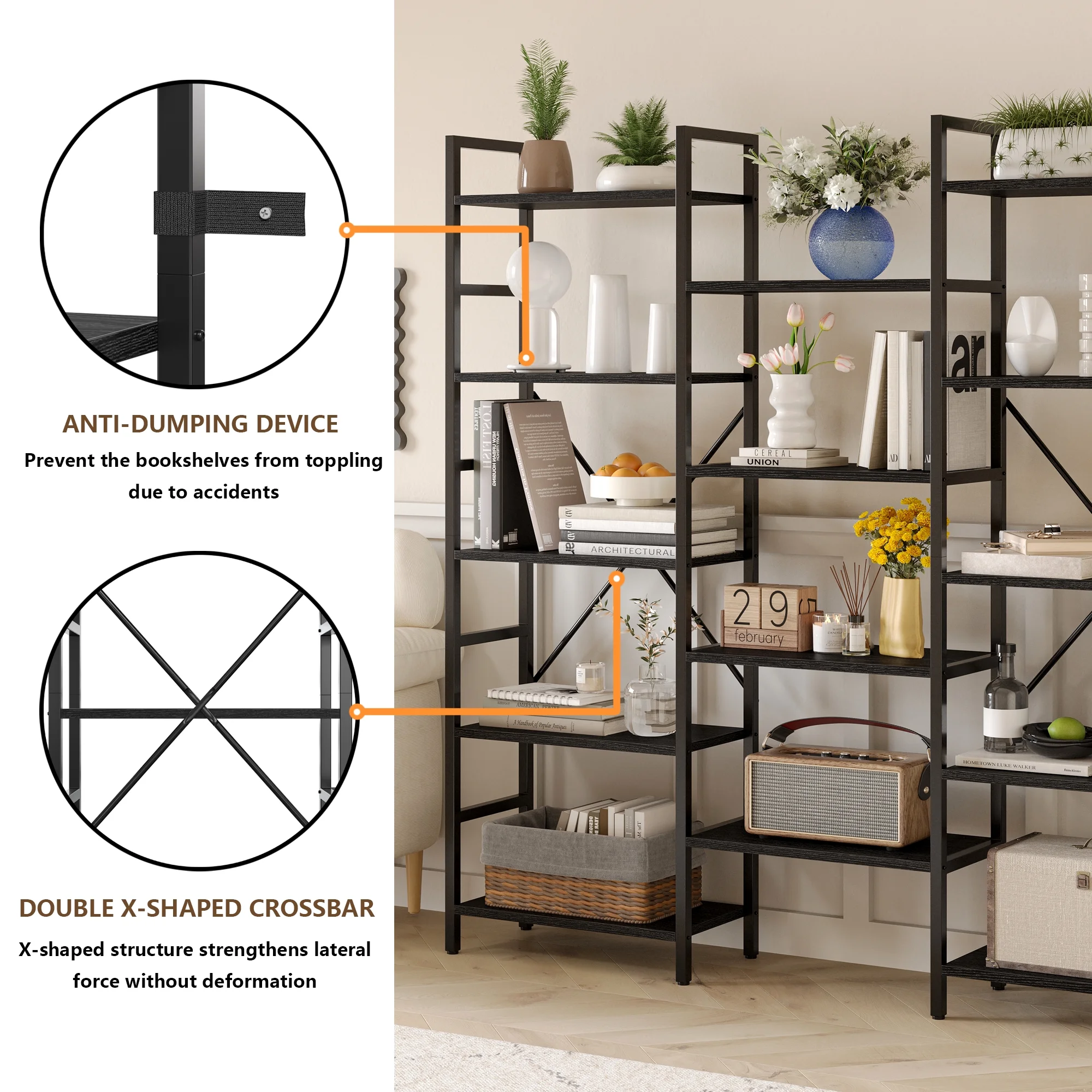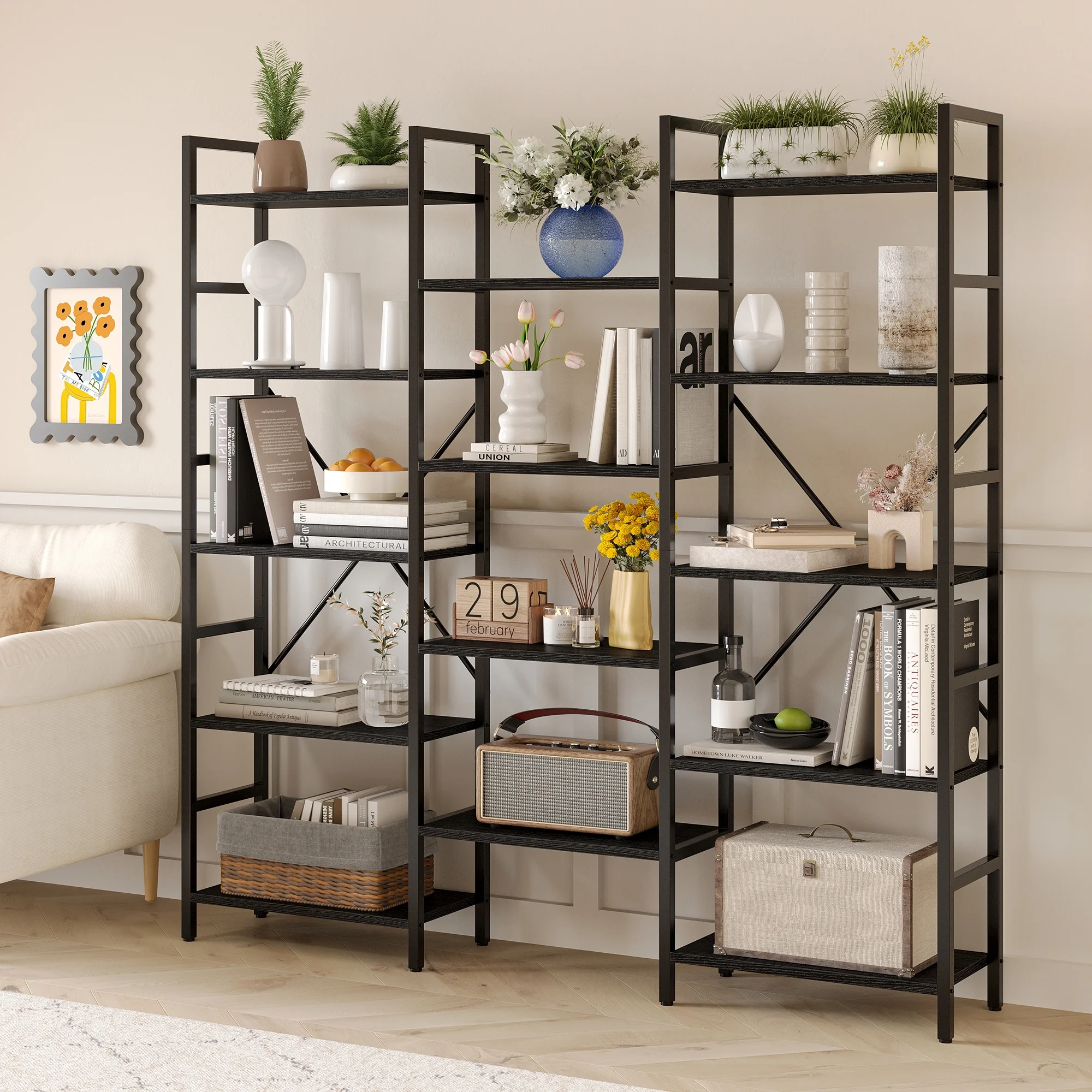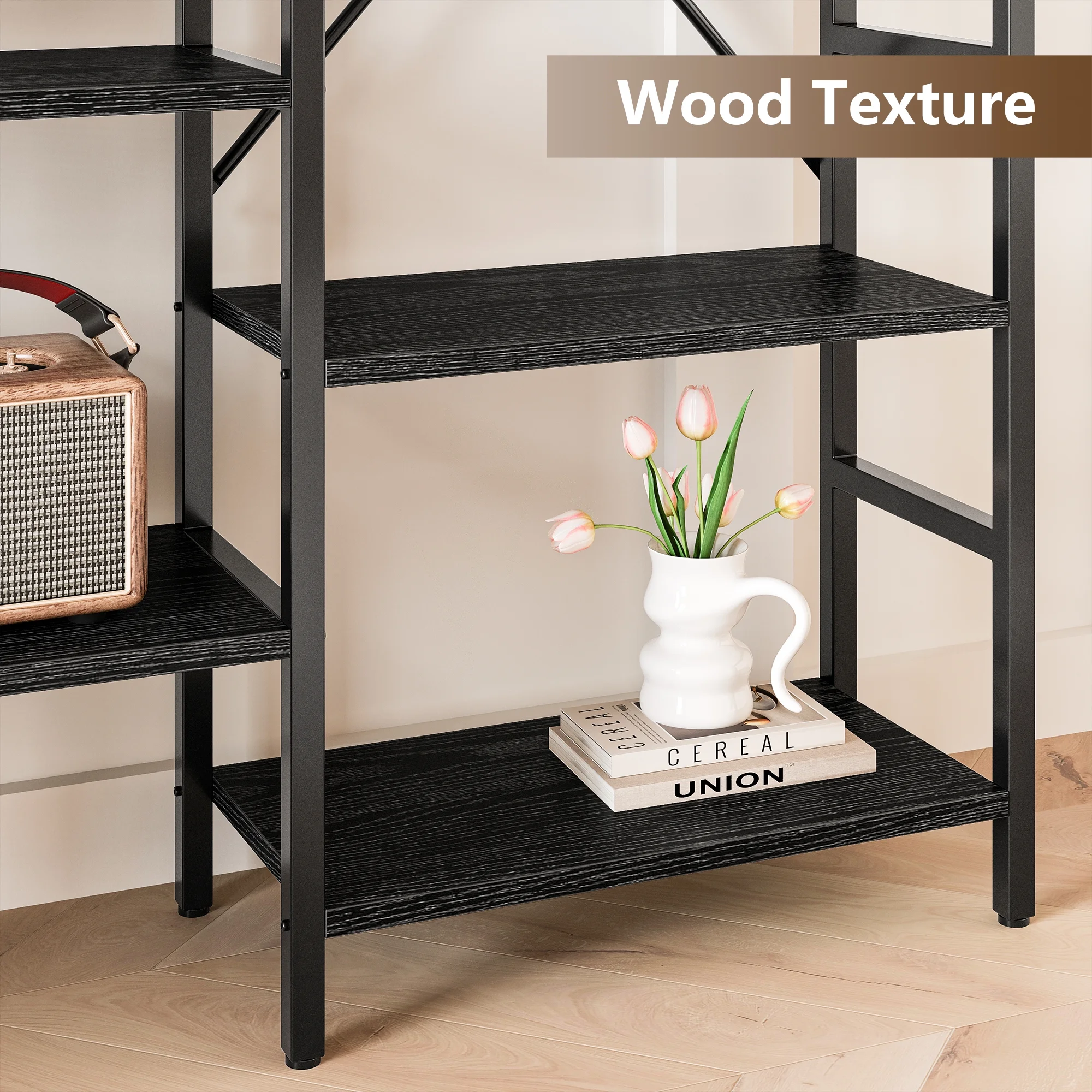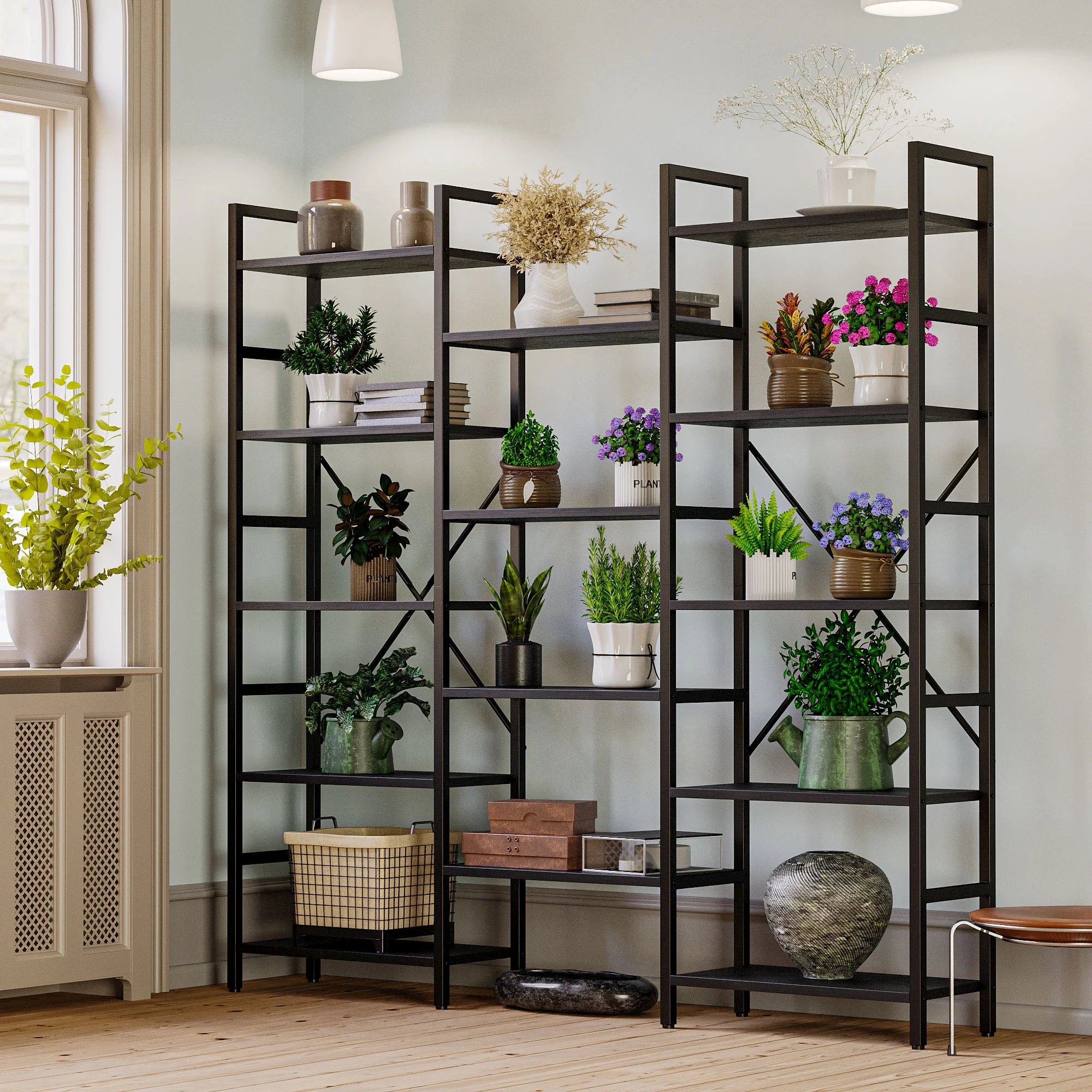IRONCK Triple Wide 5 Tiers Industrial Bookcases and Bookshelves, Large Open Display Shelf with Wood and Metal Frame, Vintage Black