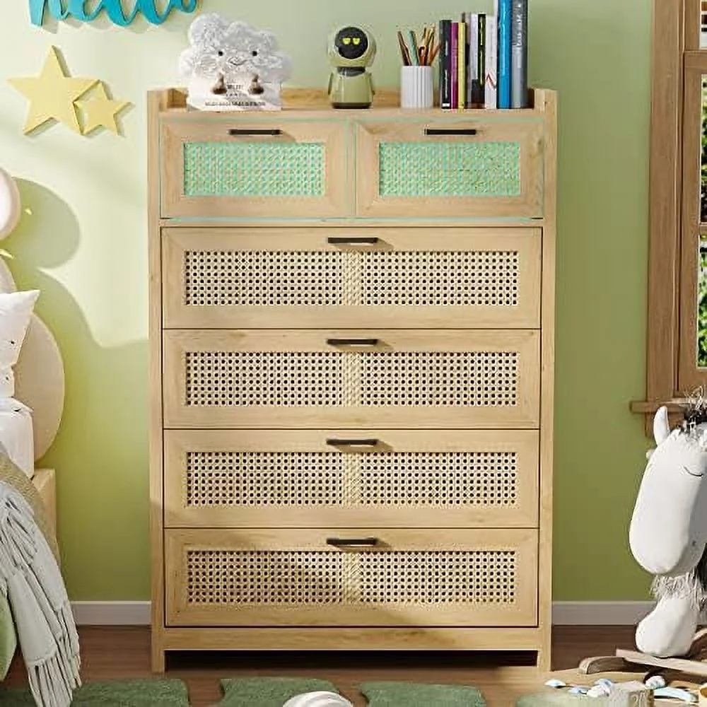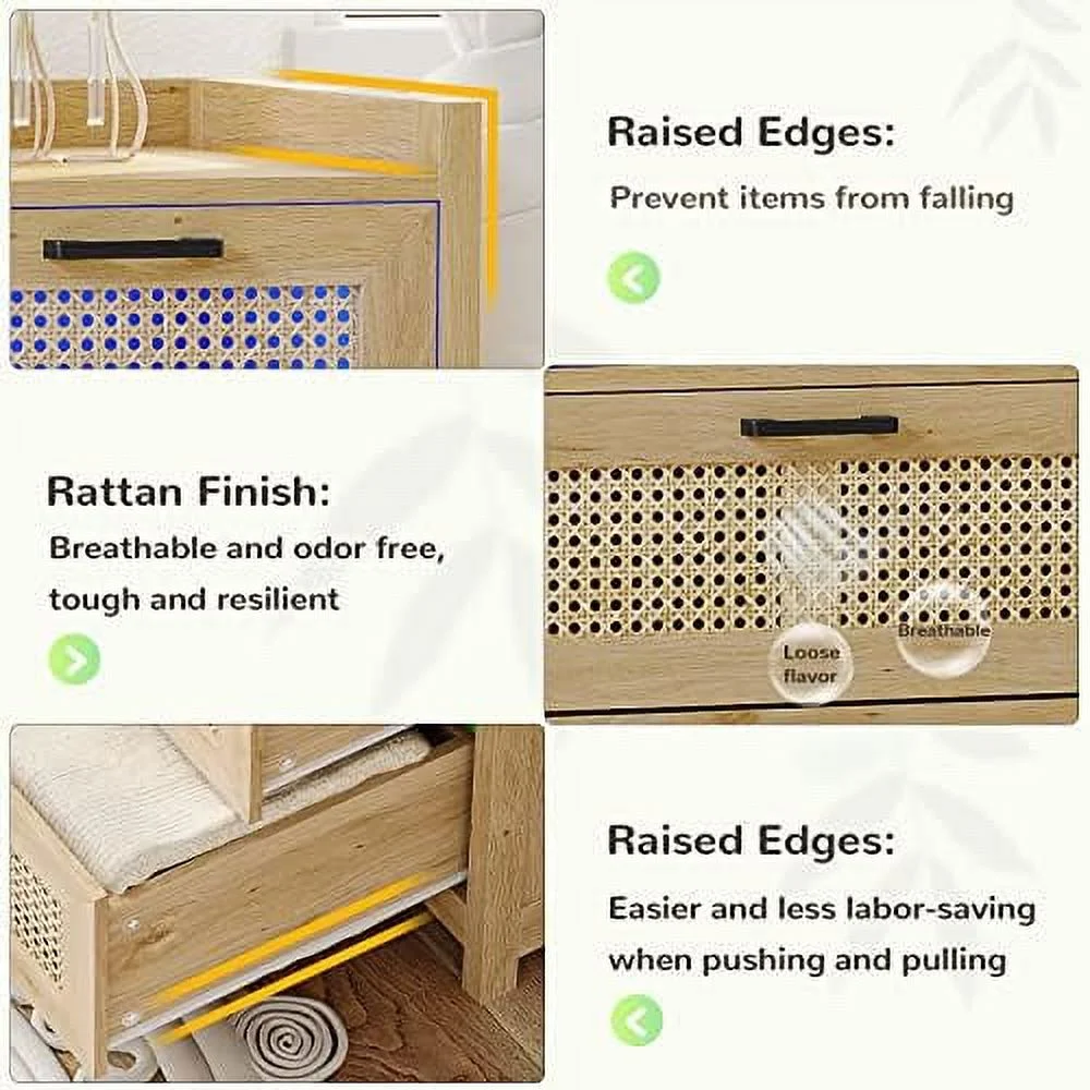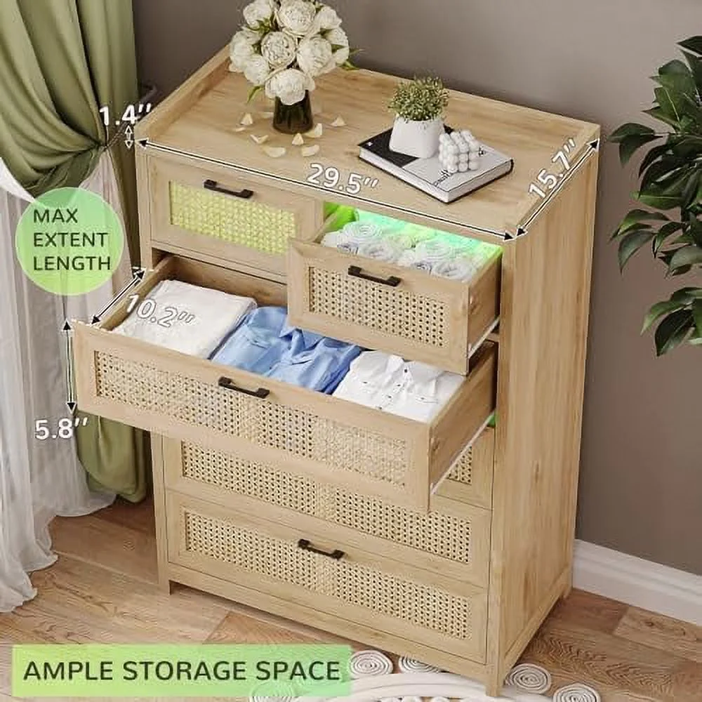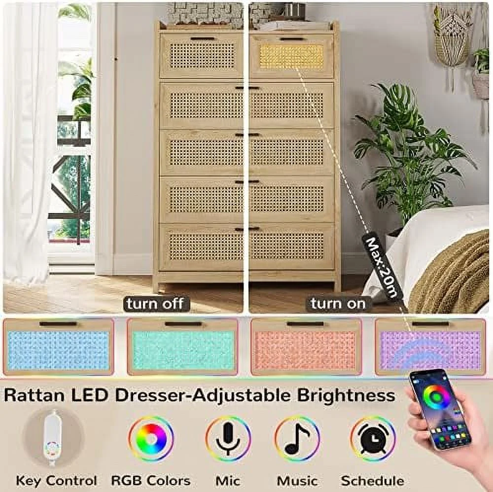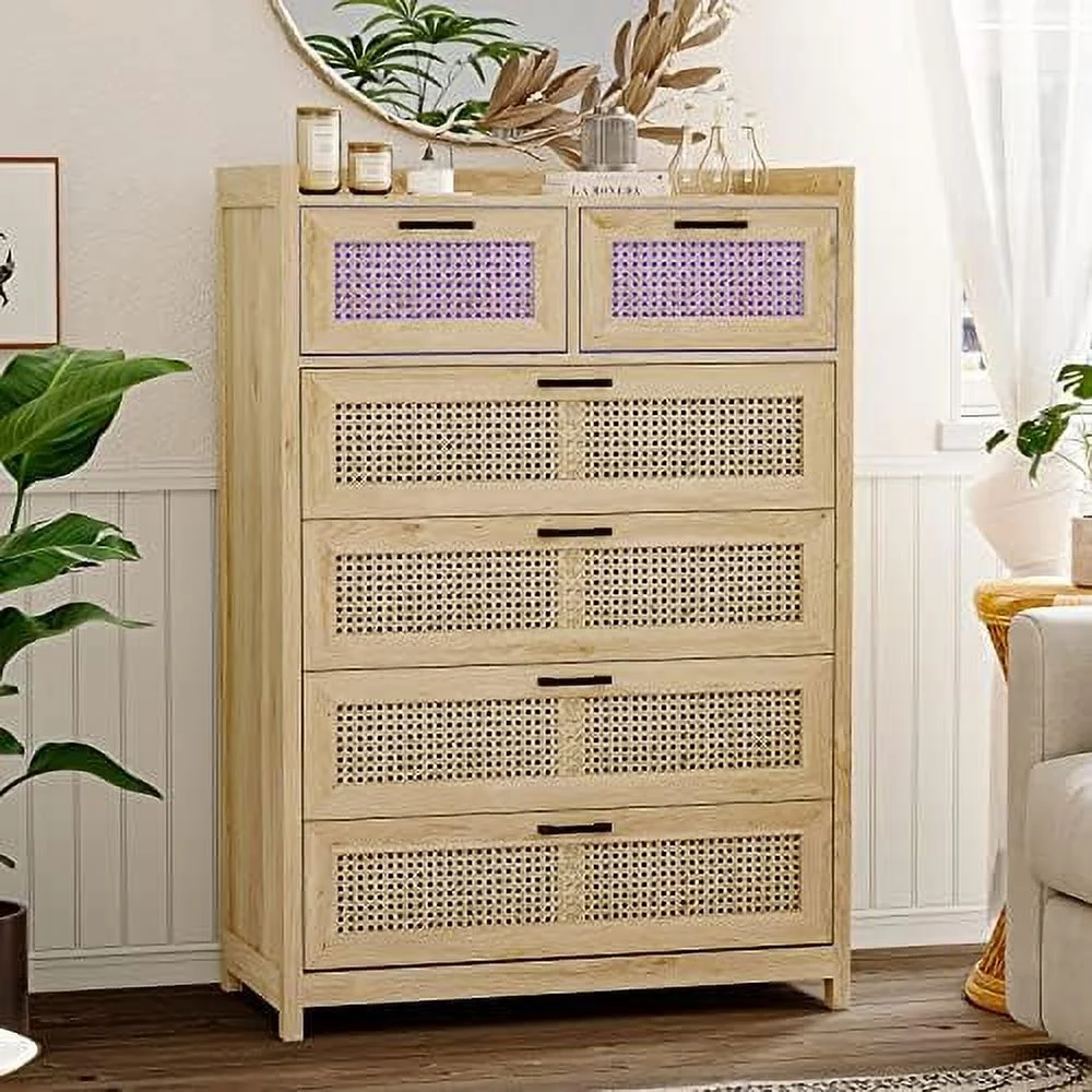 YZboomLife 7 Drawer Dresser for Bedroom Rattan Chest of Drawers with LED Lights Wood Dresser Chest with Metal Handle Modern Dresser for Closet Bedroom Living Room Hallway