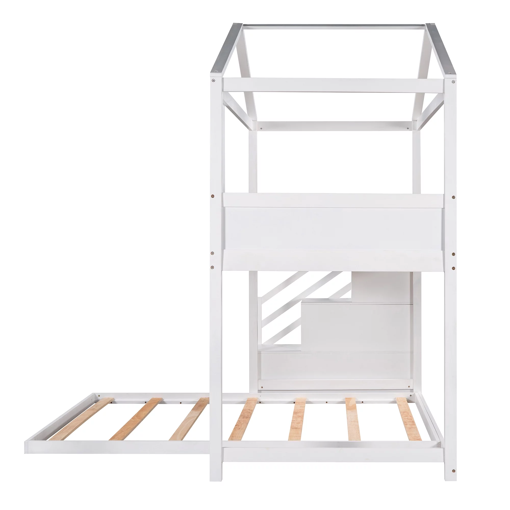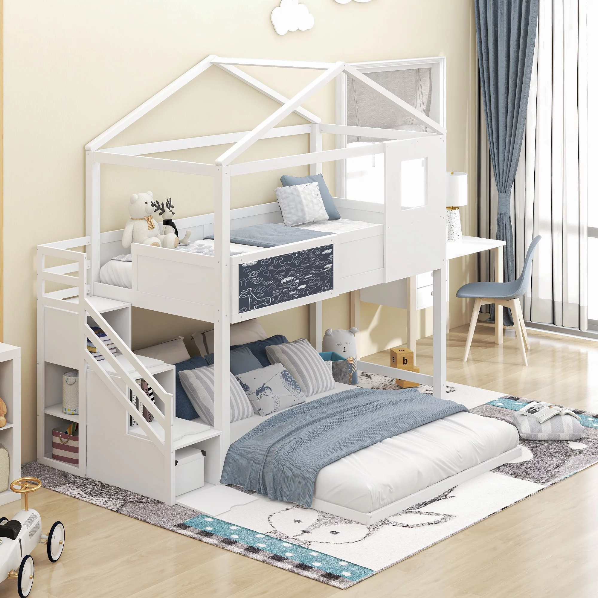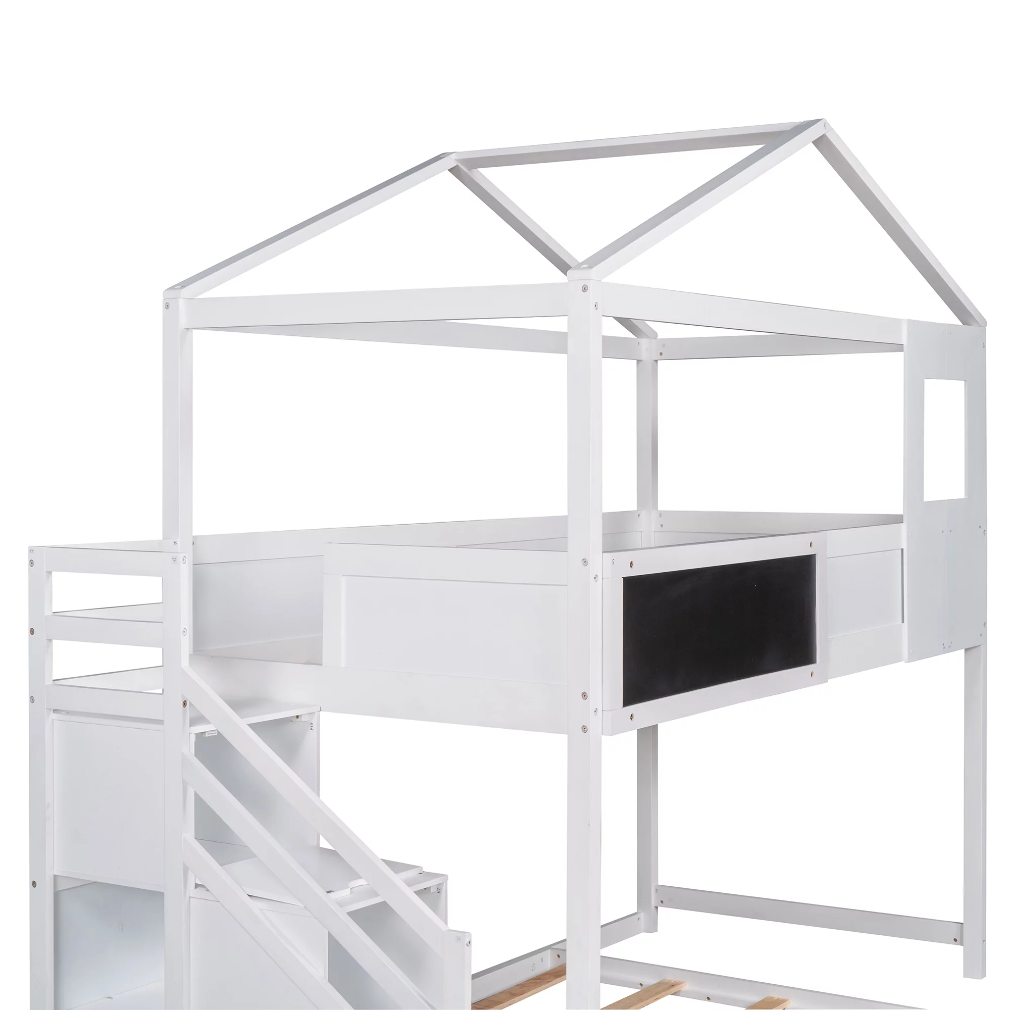 SYNGAR House Bunk Beds for Kids, Solid Wood Twin over Full Bunk Bed with Storage Staircase and Blackboard, Space Saving Low Bunk Bed Frame for Bedroom, No Box Spring Needed, White, D8718