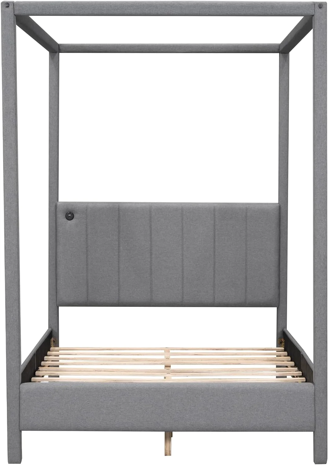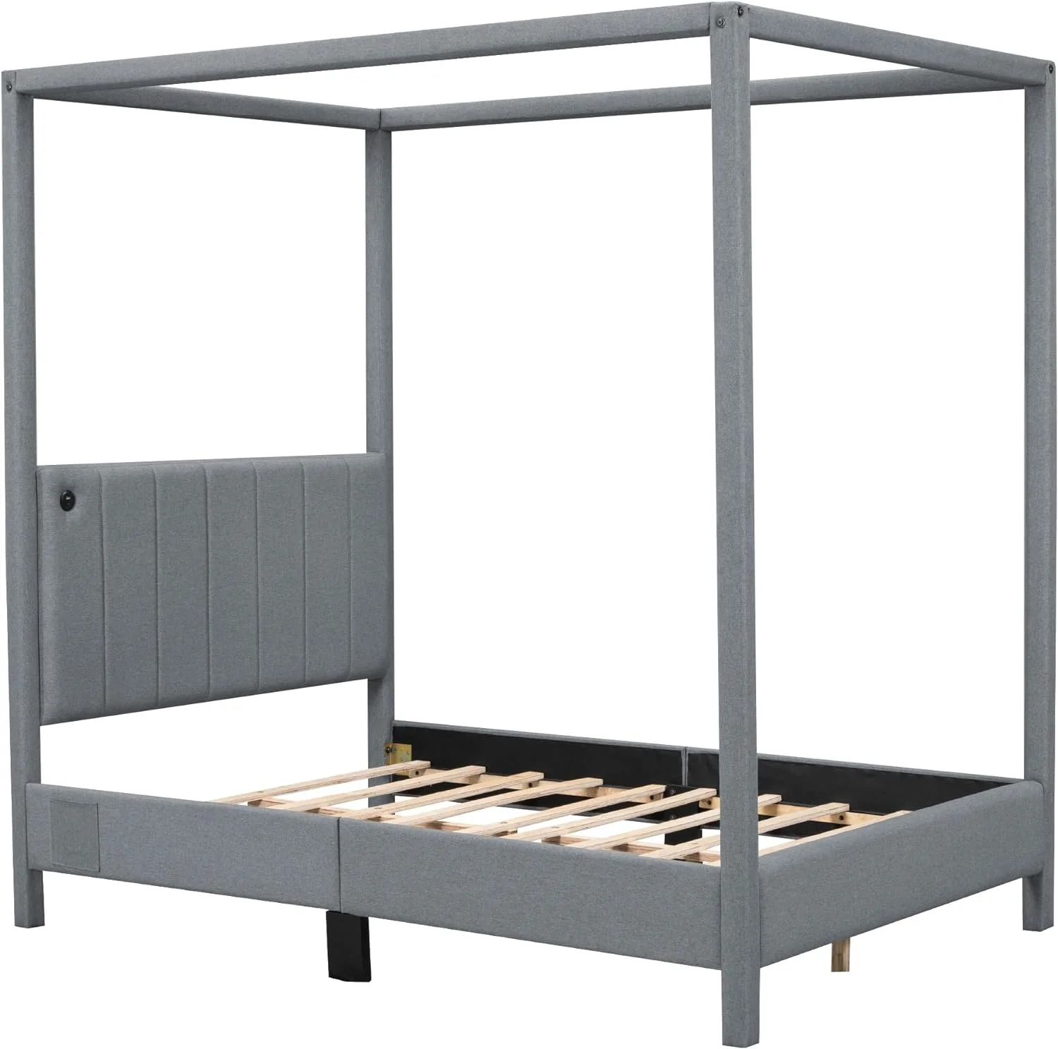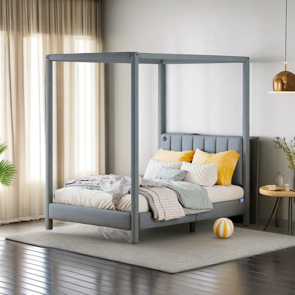Upholstery Full Size Canopy Platform Bed with Headboard, Full Platform Bed Frame with USB and Type-C Ports,Modern 4 Poster Bed for Teens Adults, No Box Spring Needed