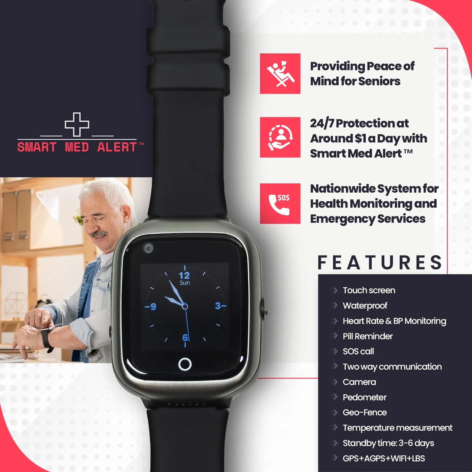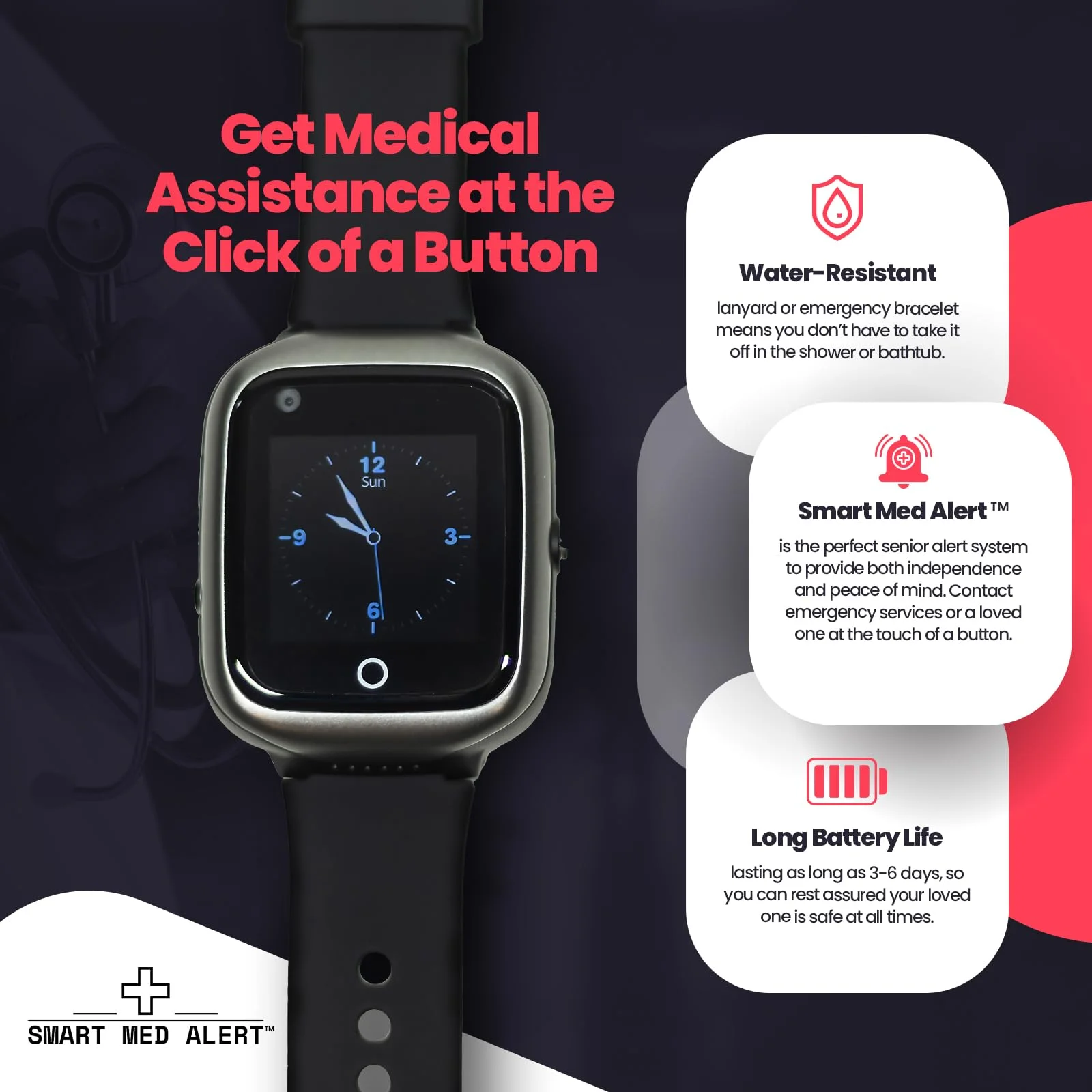 Smart Med Alert - Elderly Medical Alert Smartwatch | 24/7 Monitoring | Fall Detection | Black