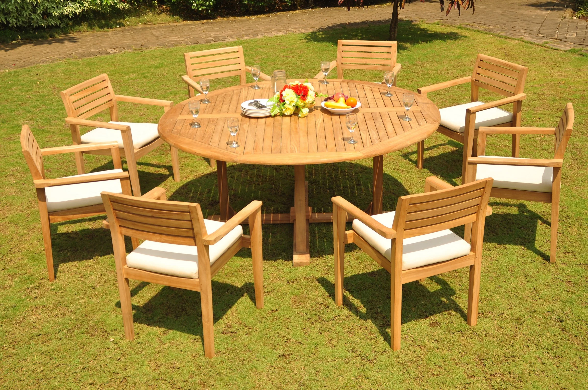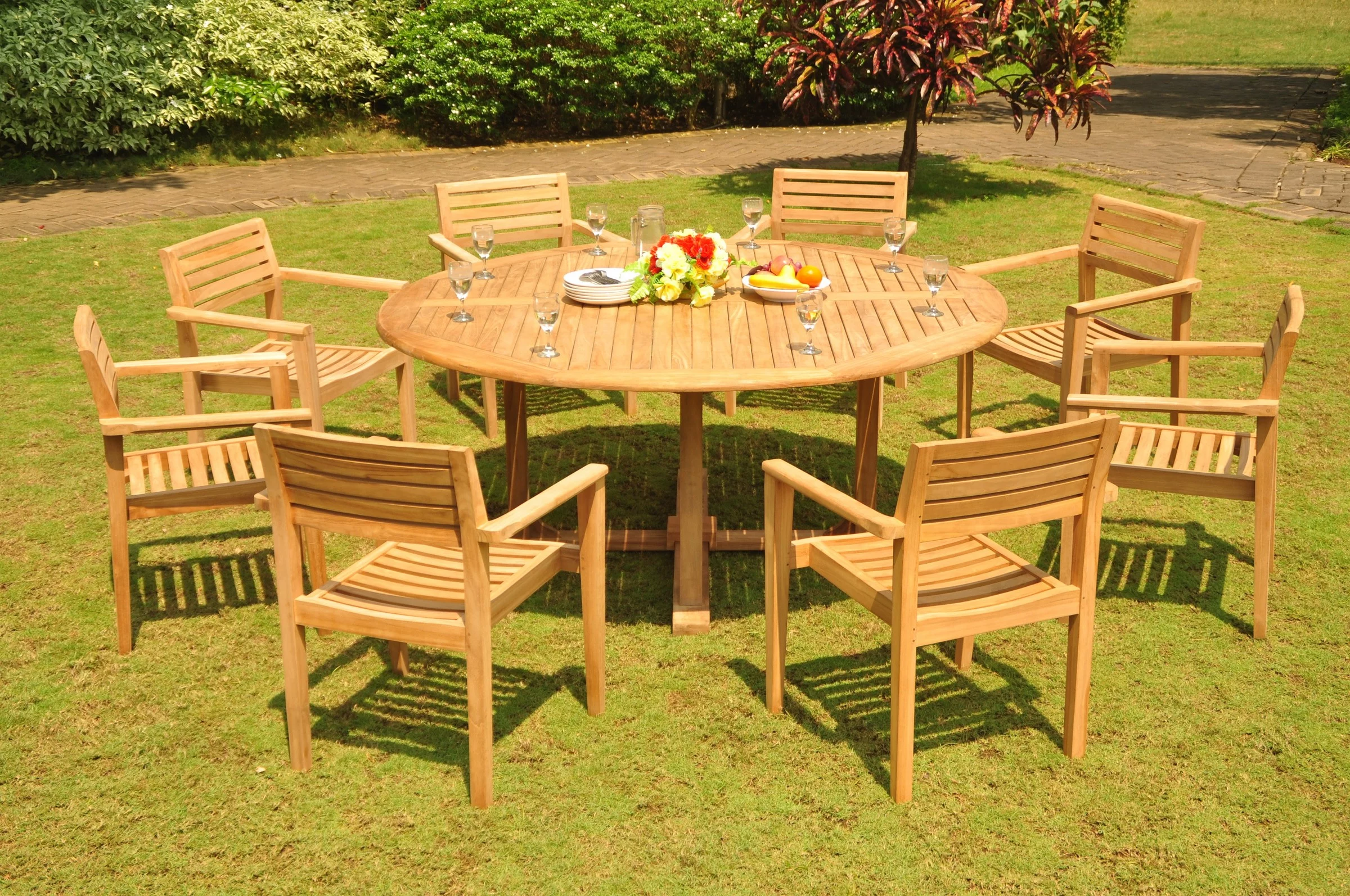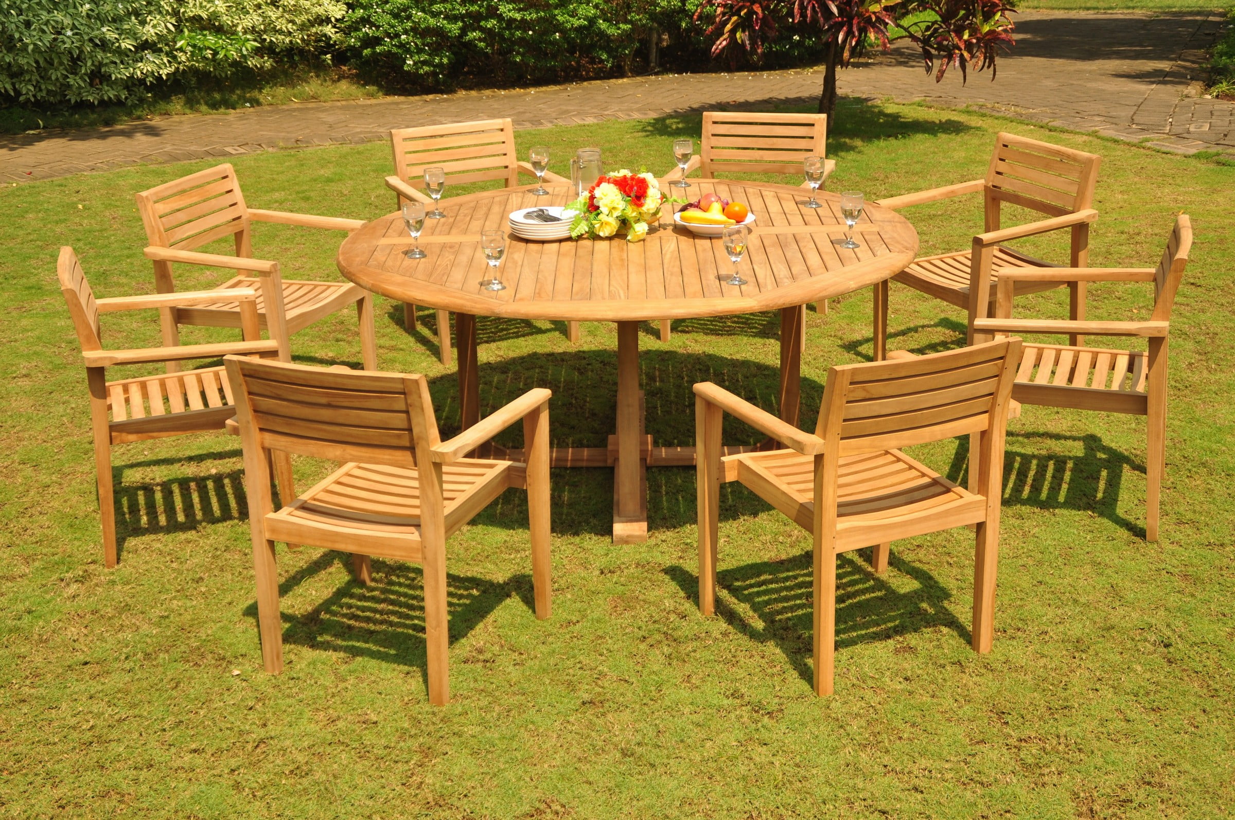 Teak Dining Set: 8 Seater 9 Pc: 72" Round Dining Table And 8 Montana Stacking Arm/Captain Chairs Outdoor Patio Grade-A Teak Wood WholesaleTeak #WMDSMTj