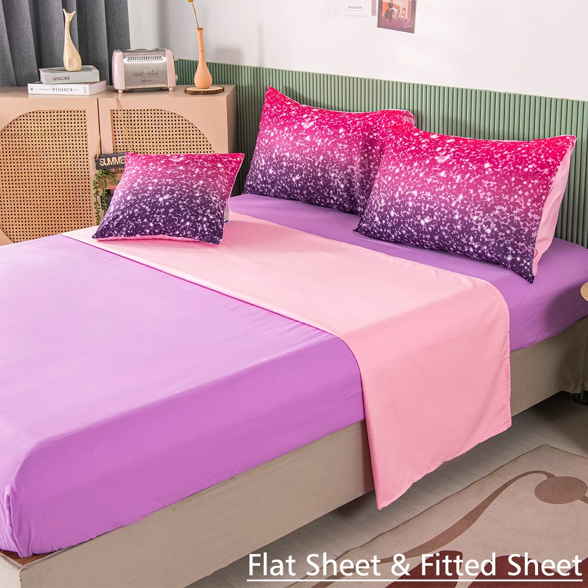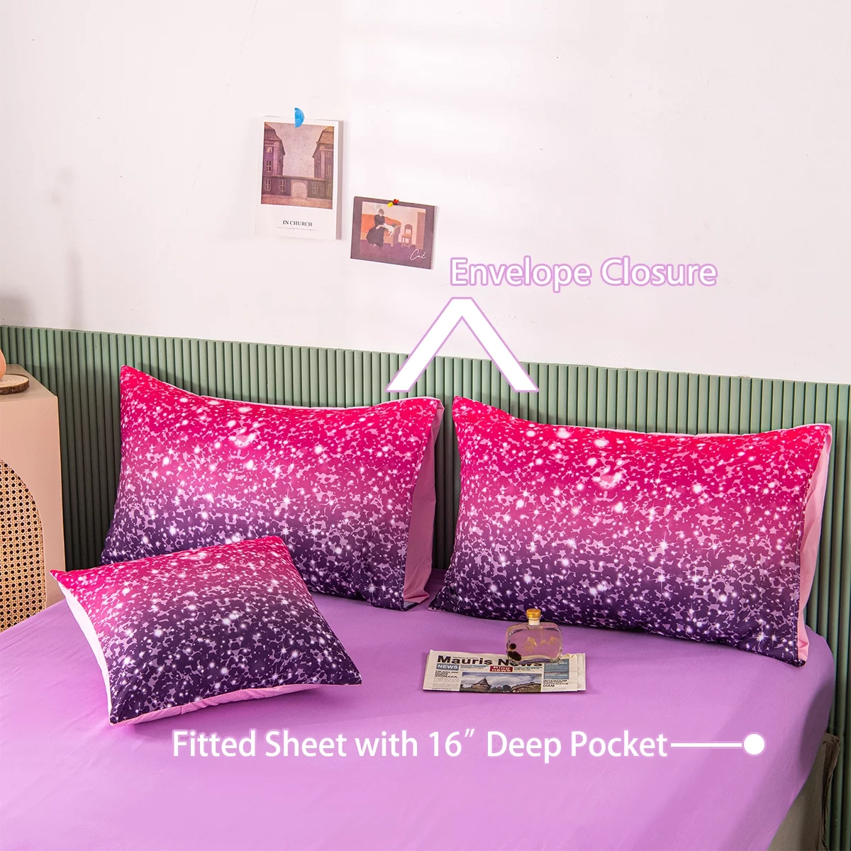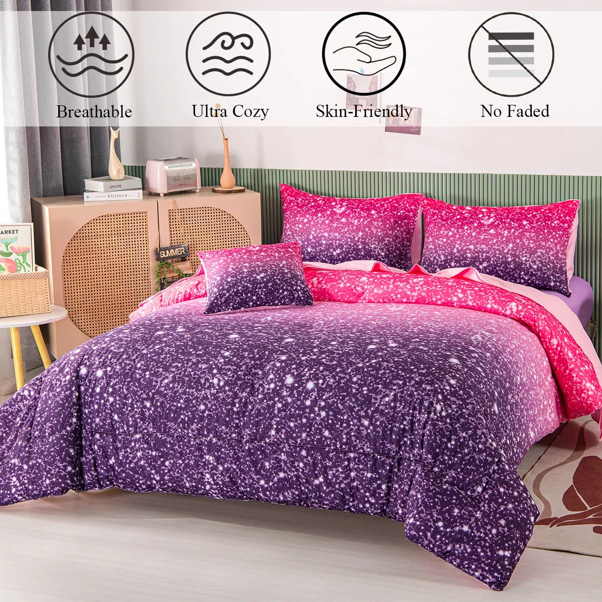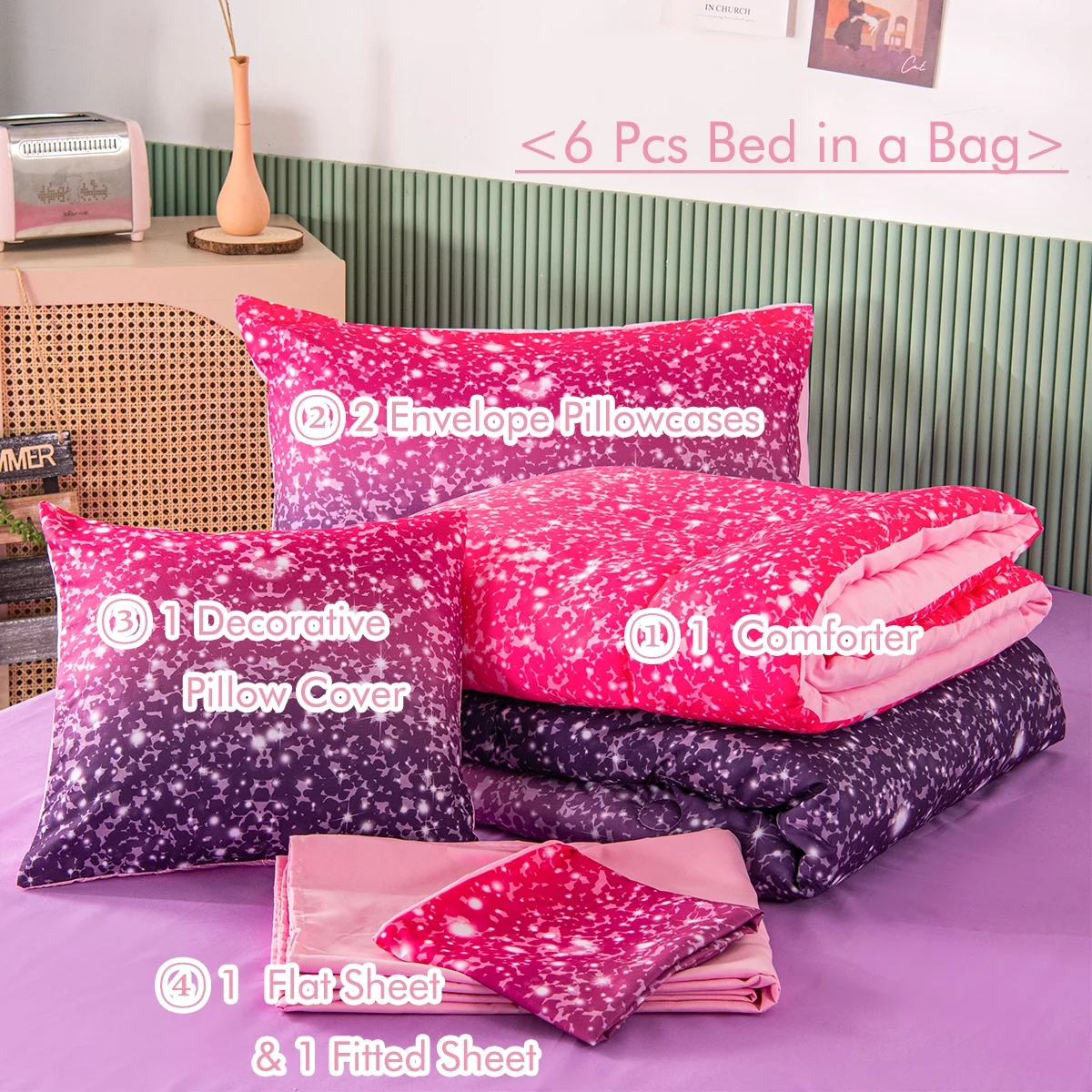 PERFEMET 6Pcs Twin Gradient Pink Purple Glitter Comforter Sets for Teens Girls Kids, Colorful Rainbow Glitter Themed Bedding Set