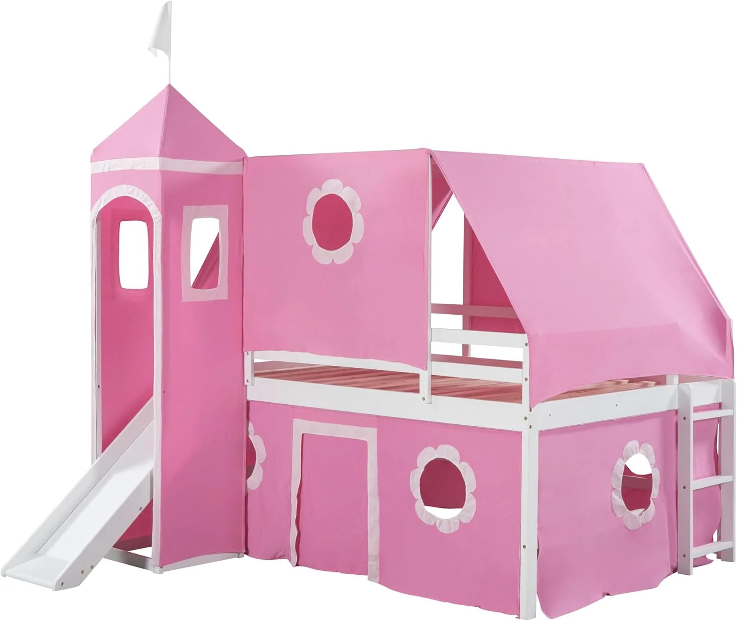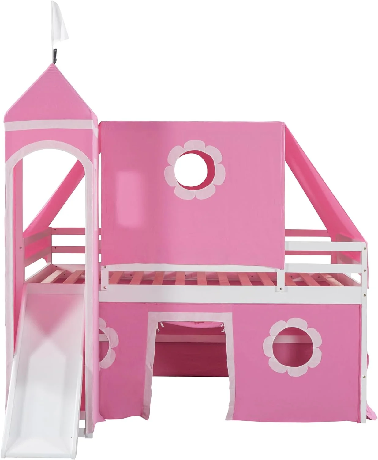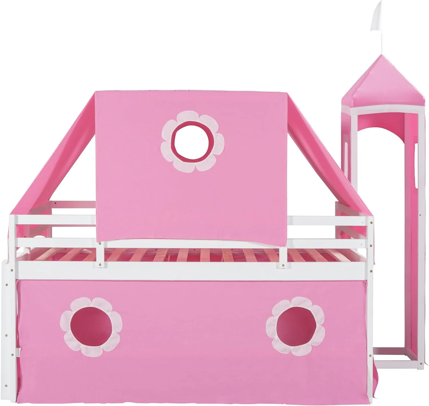 Full Size Low Lof Bed Wih Slide & Curais Ad ower, Solid Wood Lof Bed Frame Wih e, Full Floor Buk Bed For Kids Girls Boys (), HJH-L772AAH