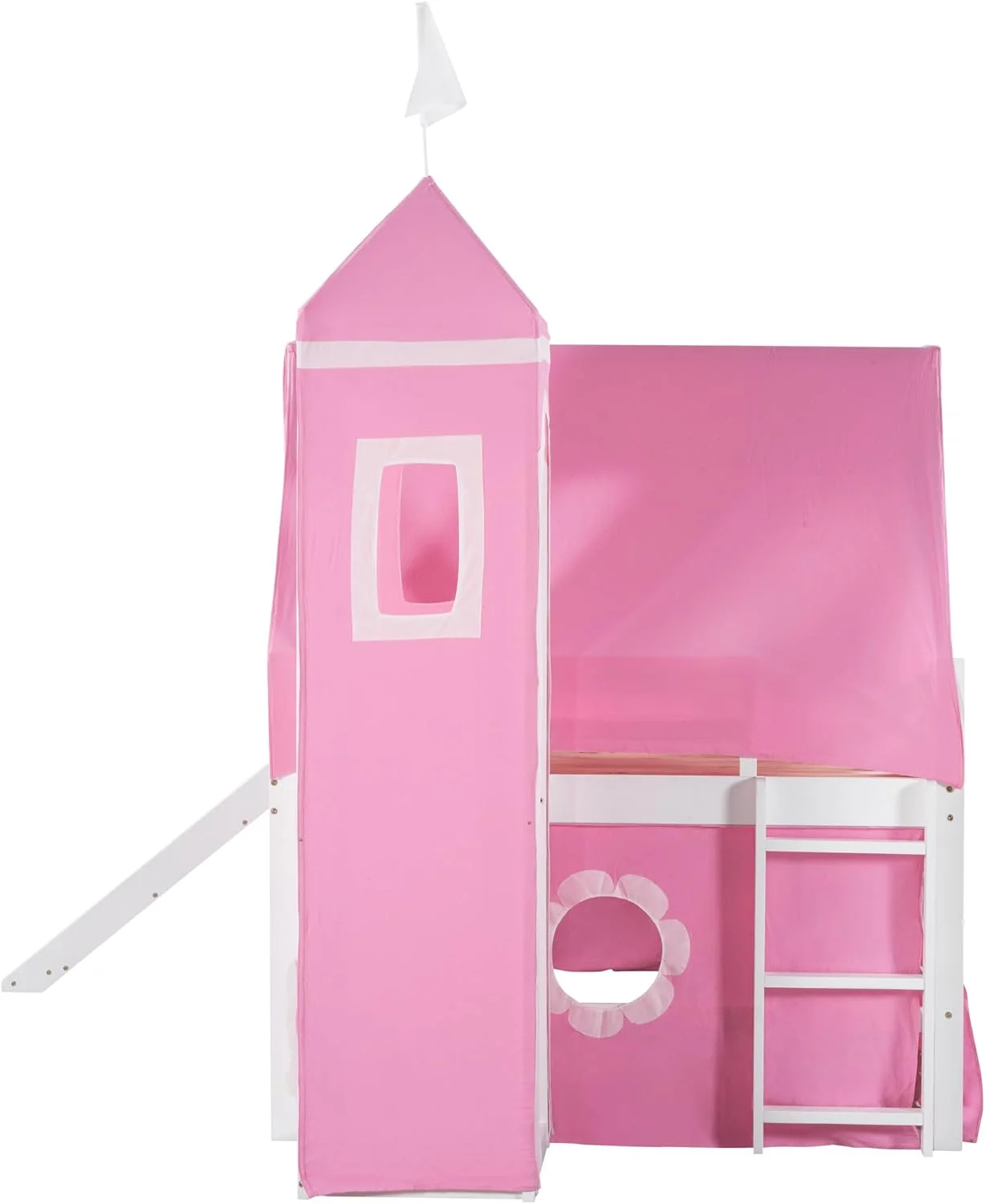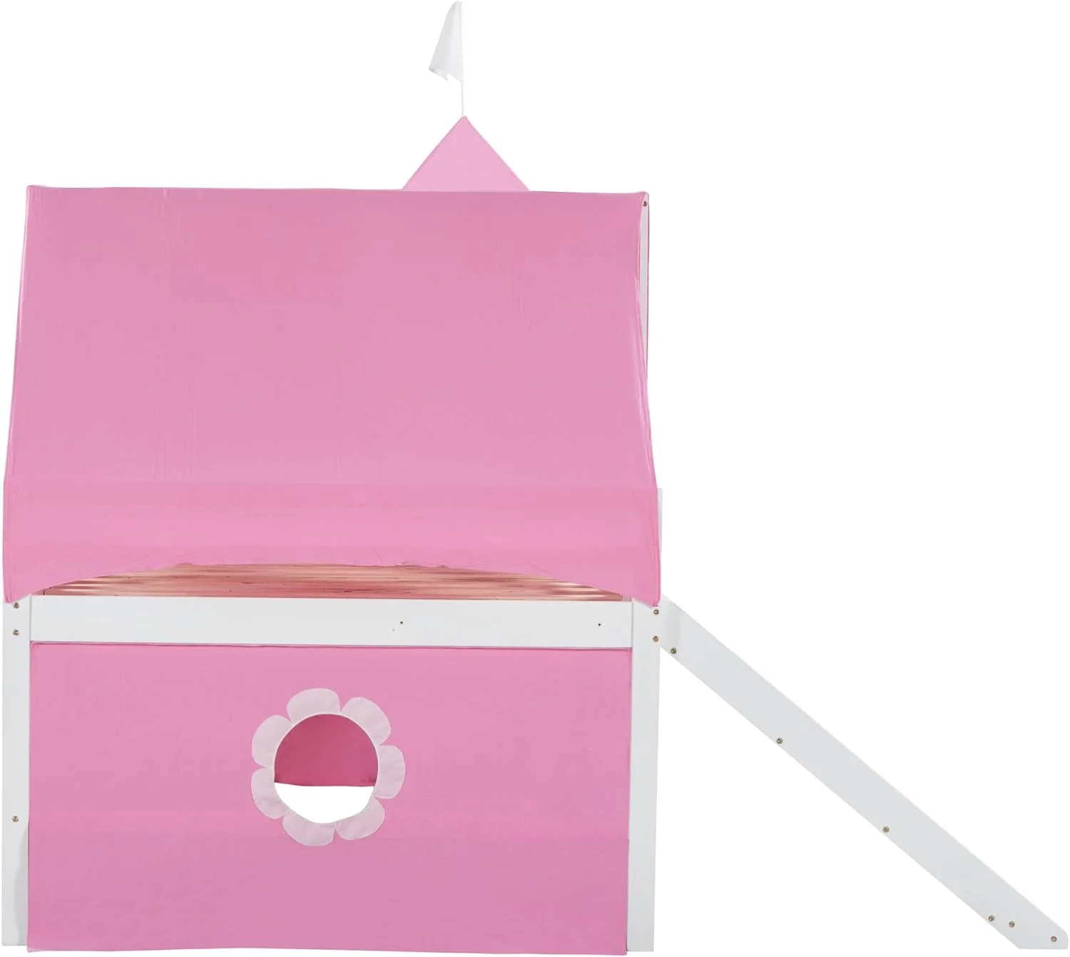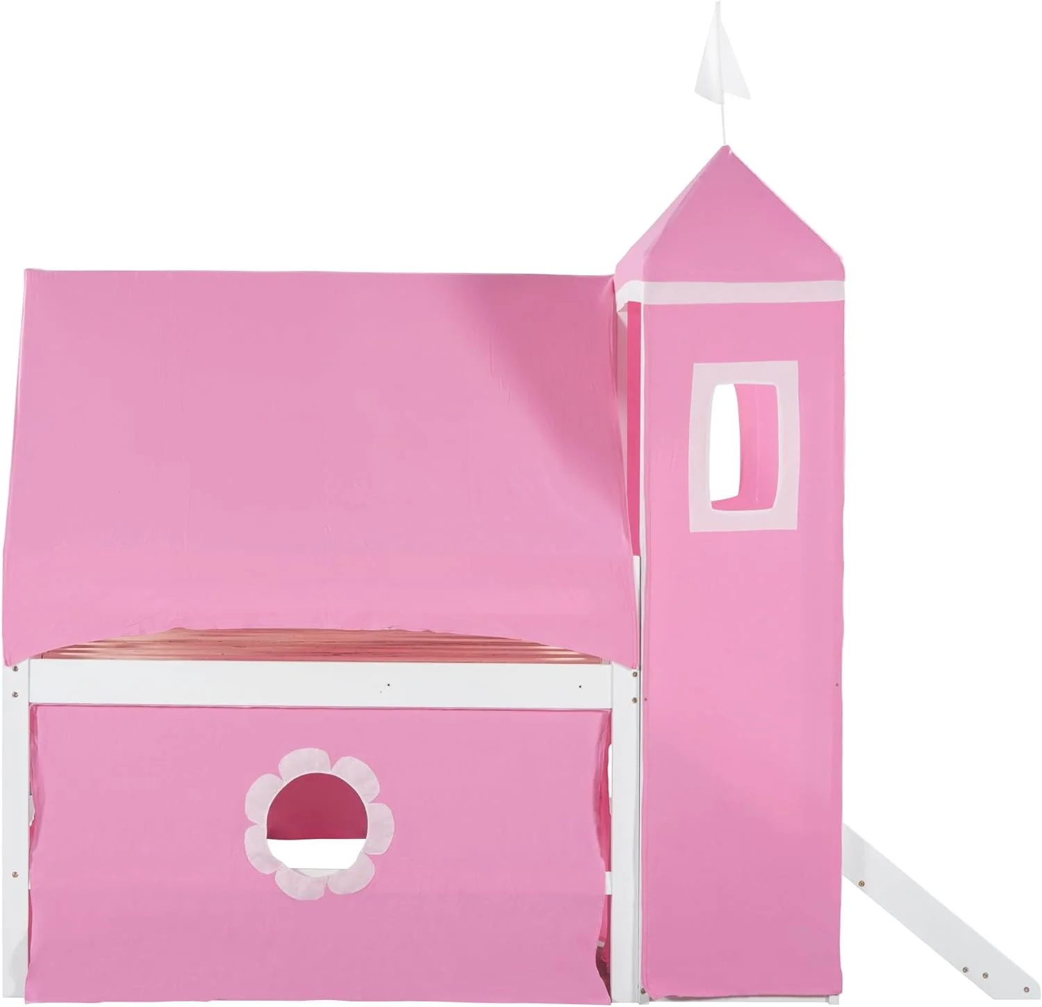 Full Size Low Lof Bed Wih Slide & Curais Ad ower, Solid Wood Lof Bed Frame Wih e, Full Floor Buk Bed For Kids Girls Boys (), HJH-L772AAH