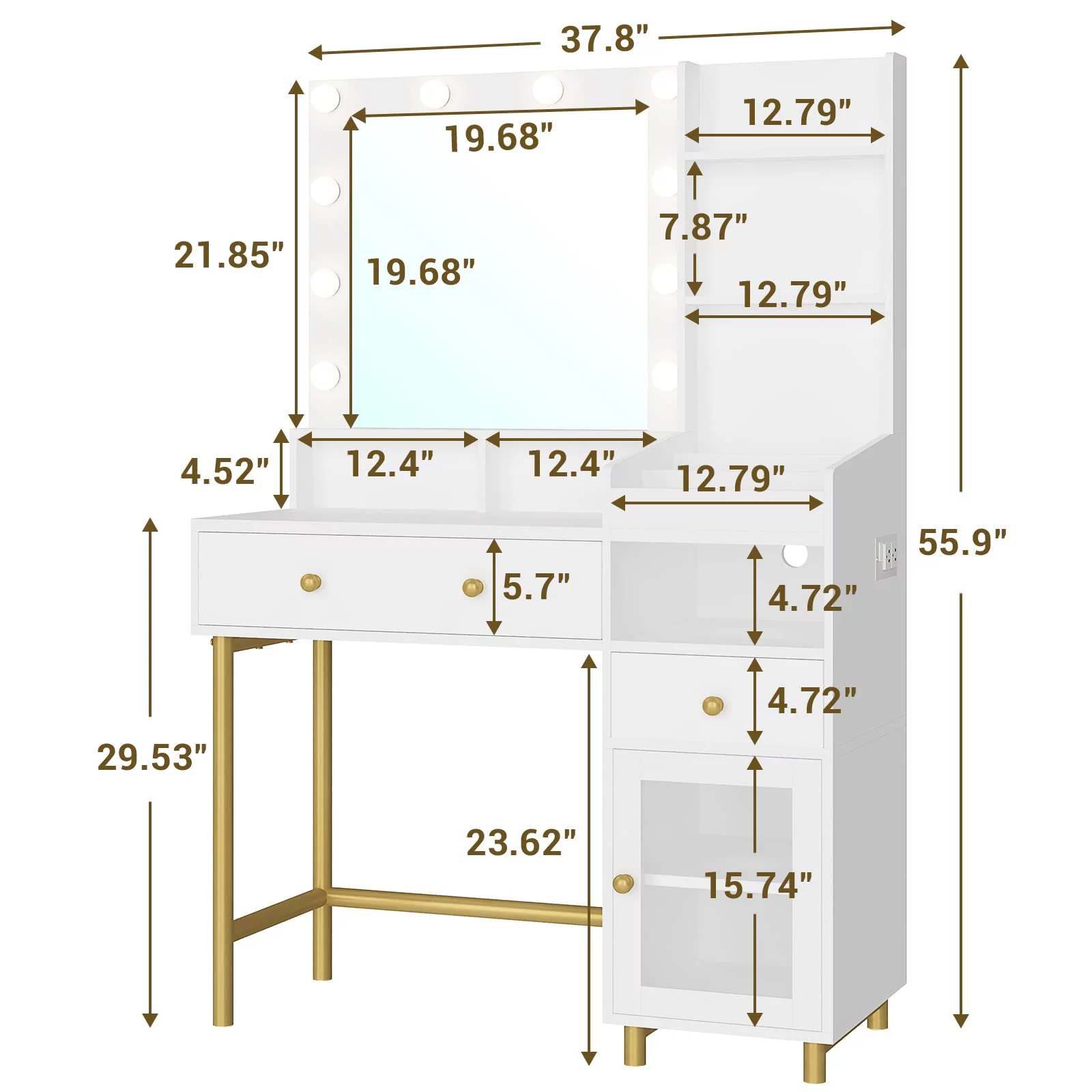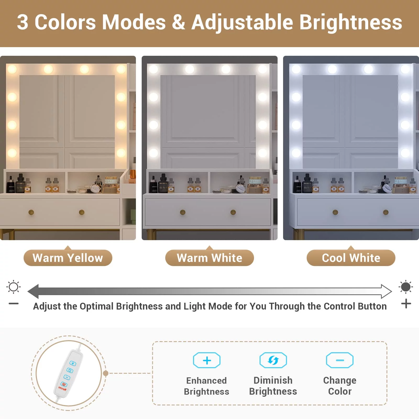 Vanity Desk with Lights in 3 Colors, Makeup Vanity with Charging Station, Unique Separation Design, White