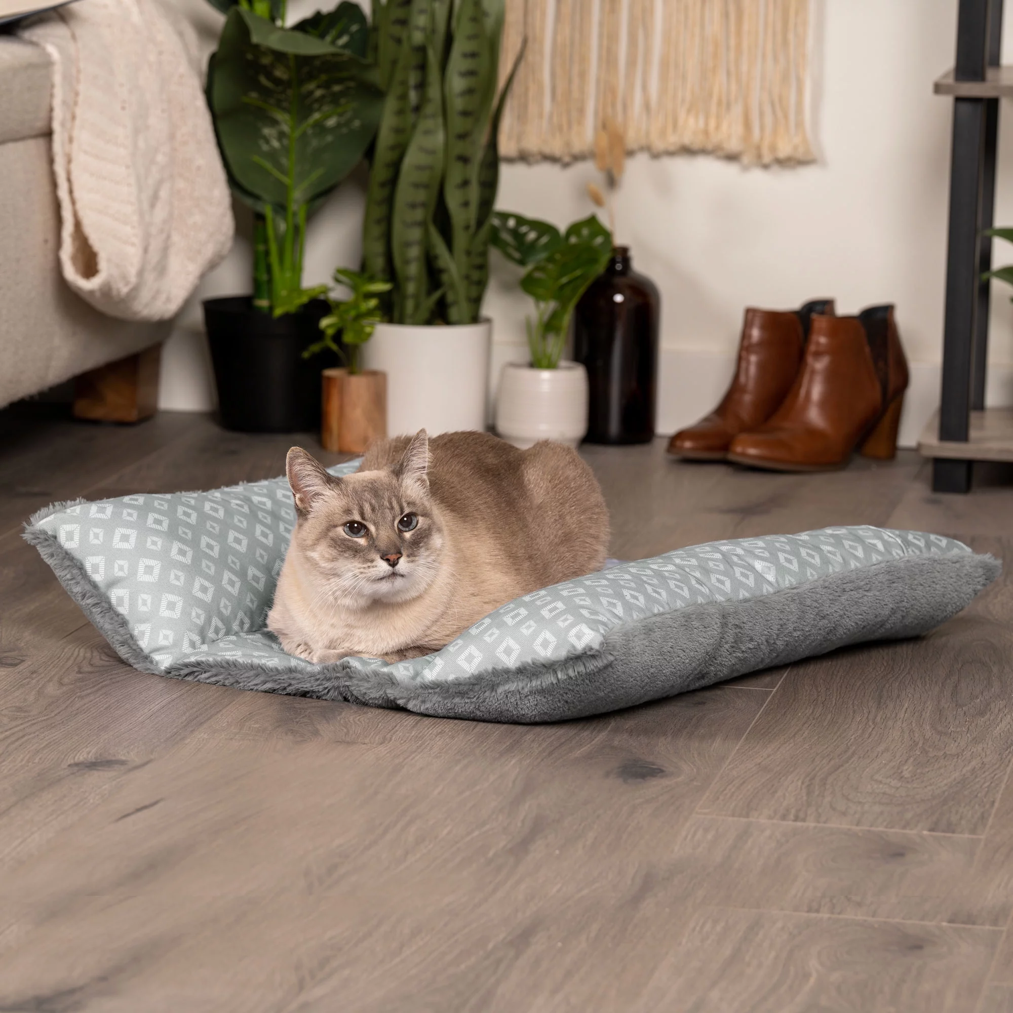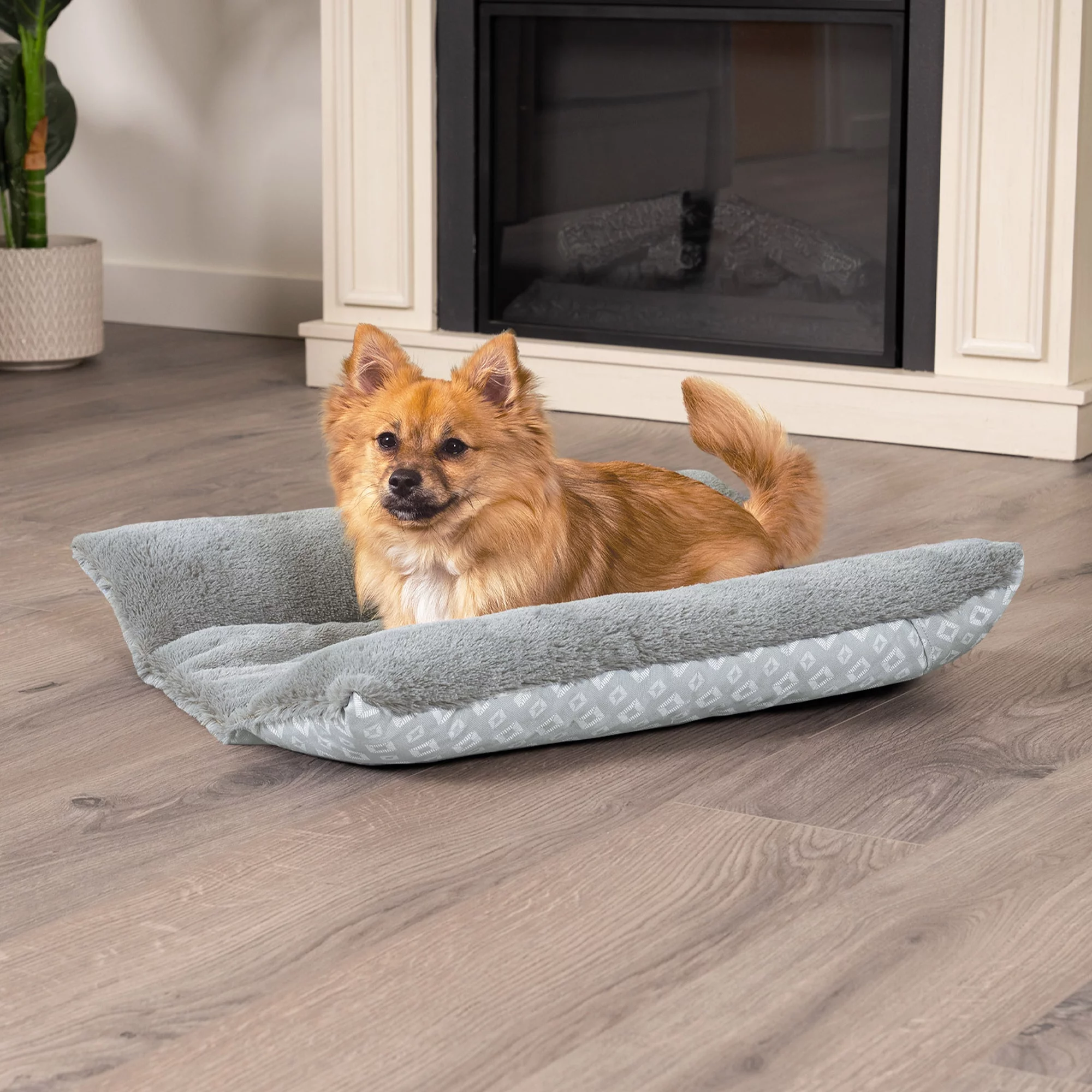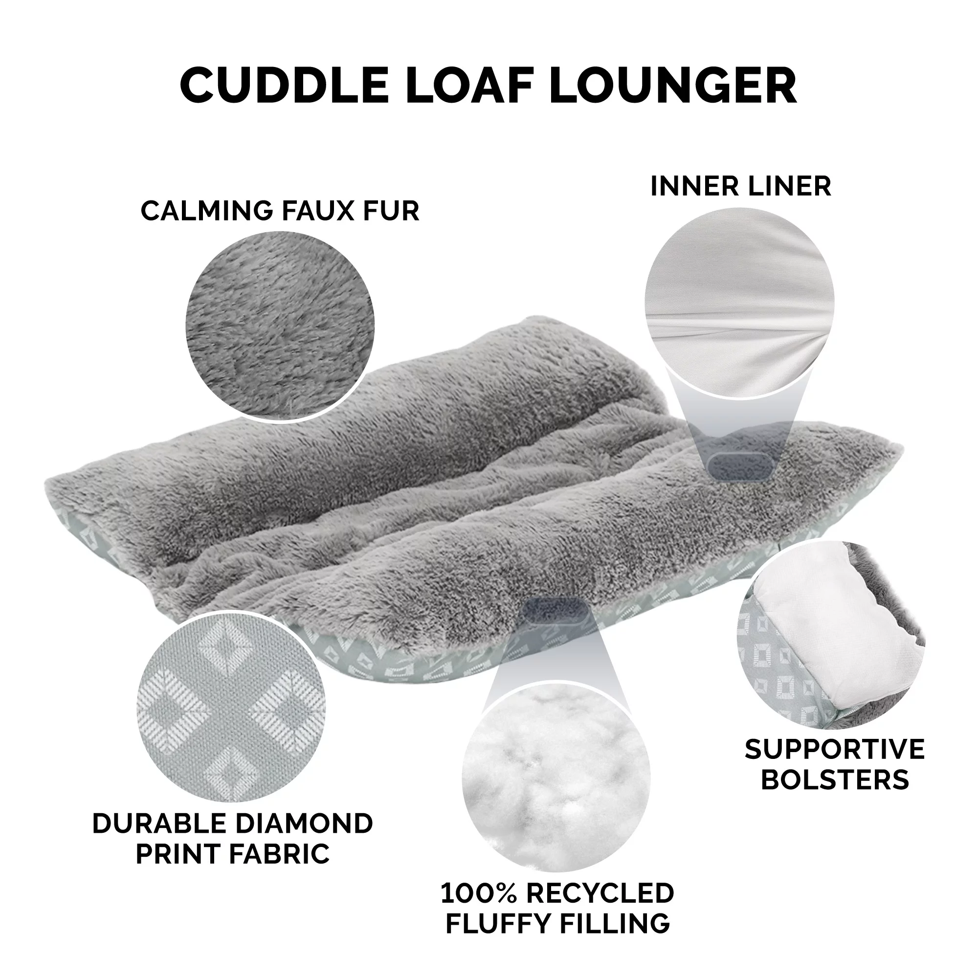 FurHaven Pet Products Cuddle Loaf Bed Plush Faux Fur and Diamond Print Pet Bed for Rabbits & Small Pets - Large, Gray