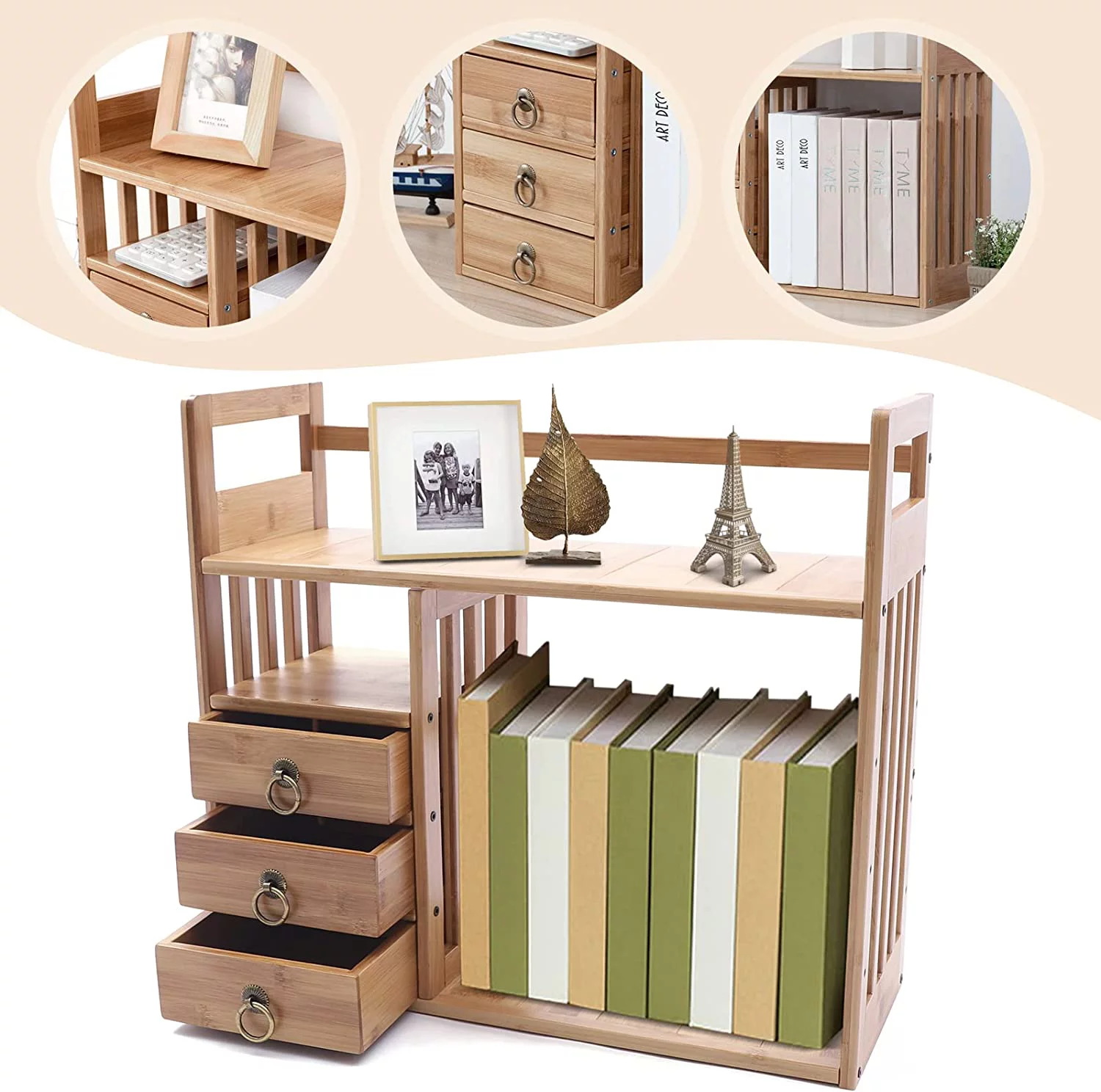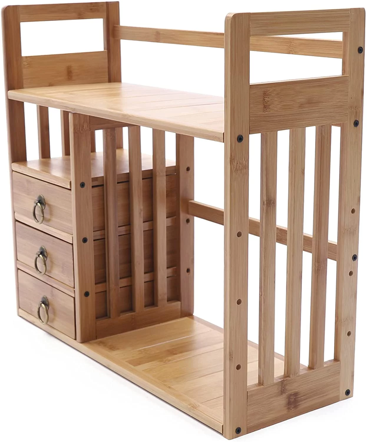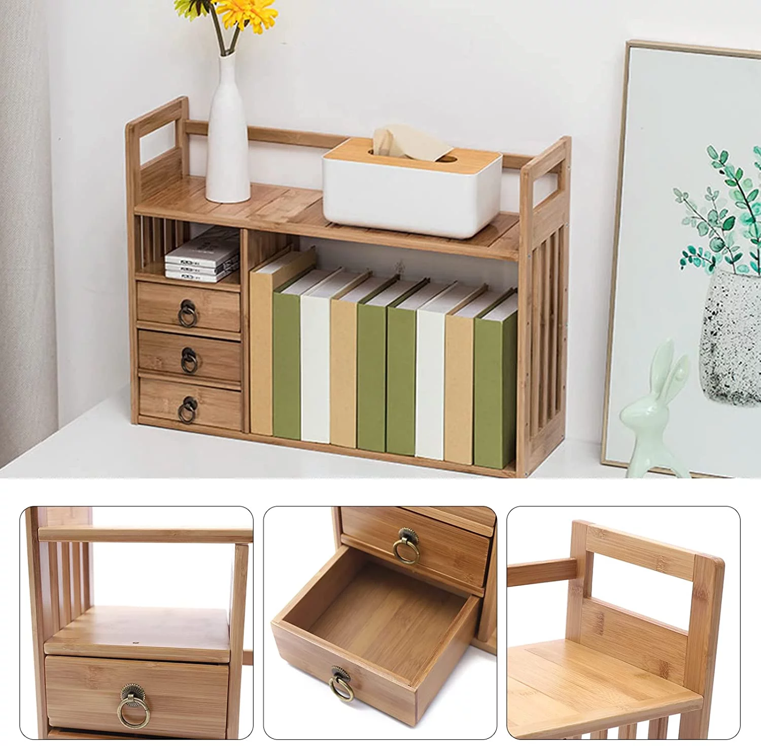 Miumaeov Bamboo Desktop Bookshelf Desk Organizer Shelf Storage Rack Counter Top Bookcase, Office Desk Storage display Shelf Rack with 3 Drawers for Office Supplies, Kitchen,Bathroom, Makeup