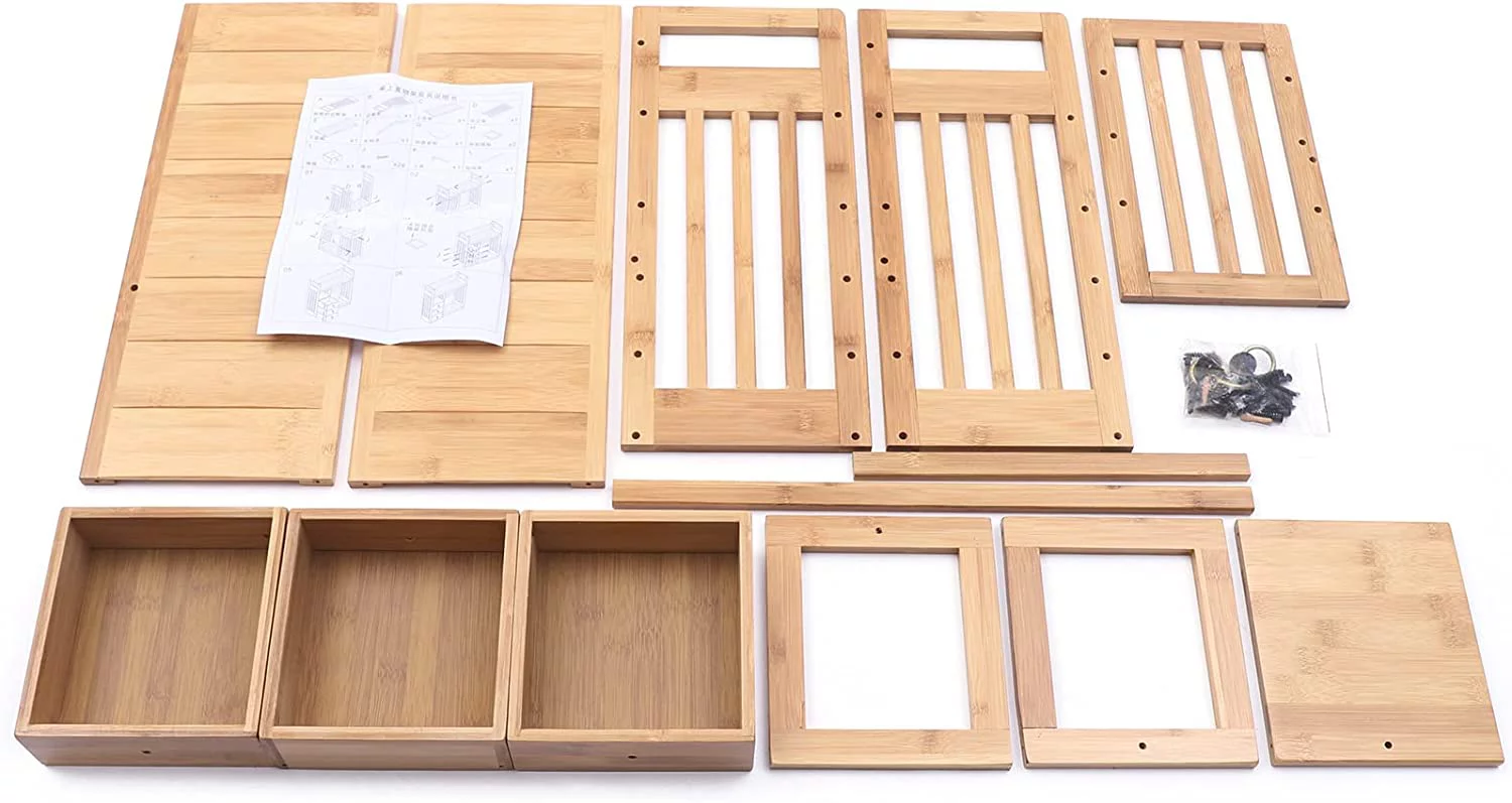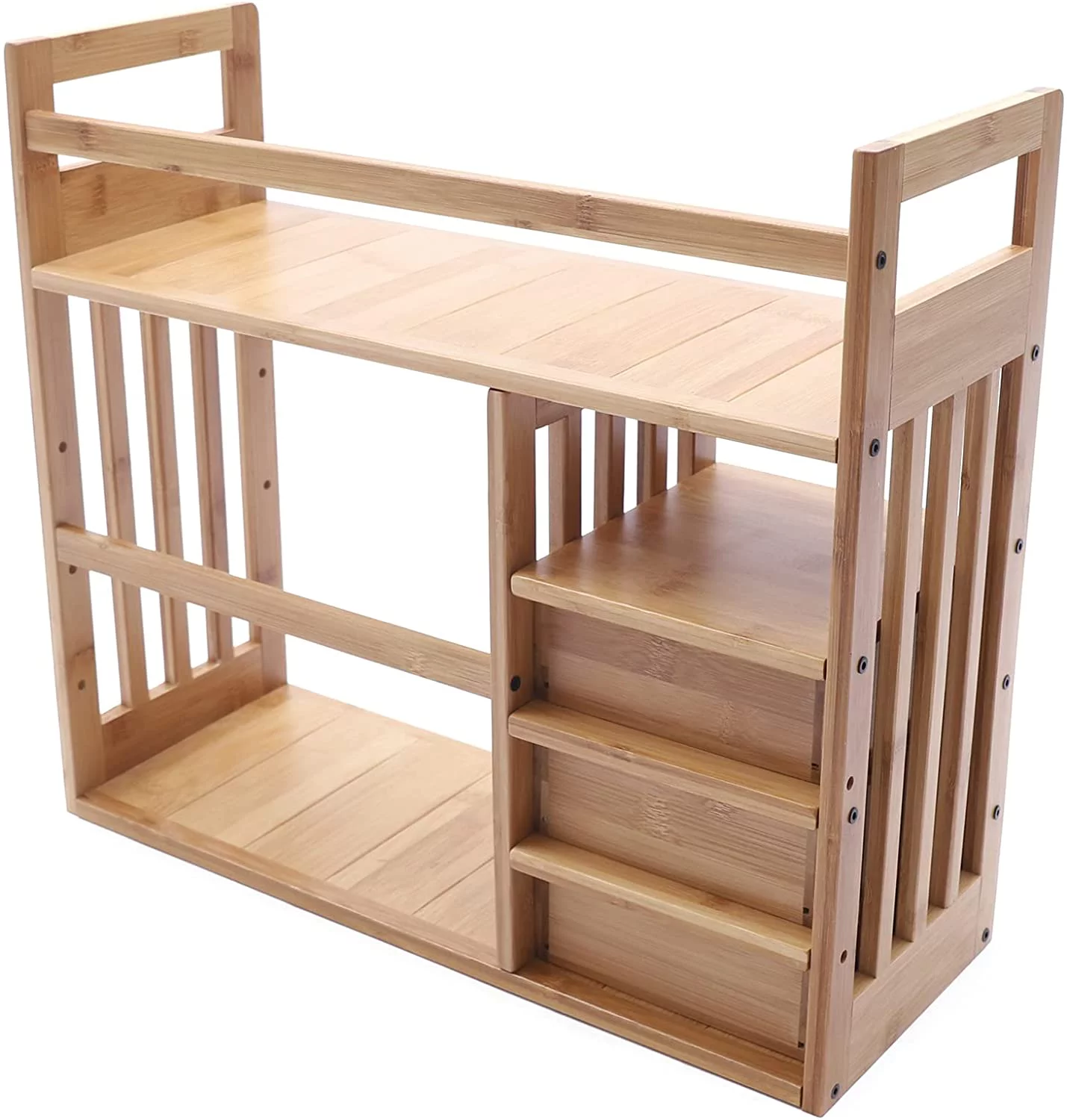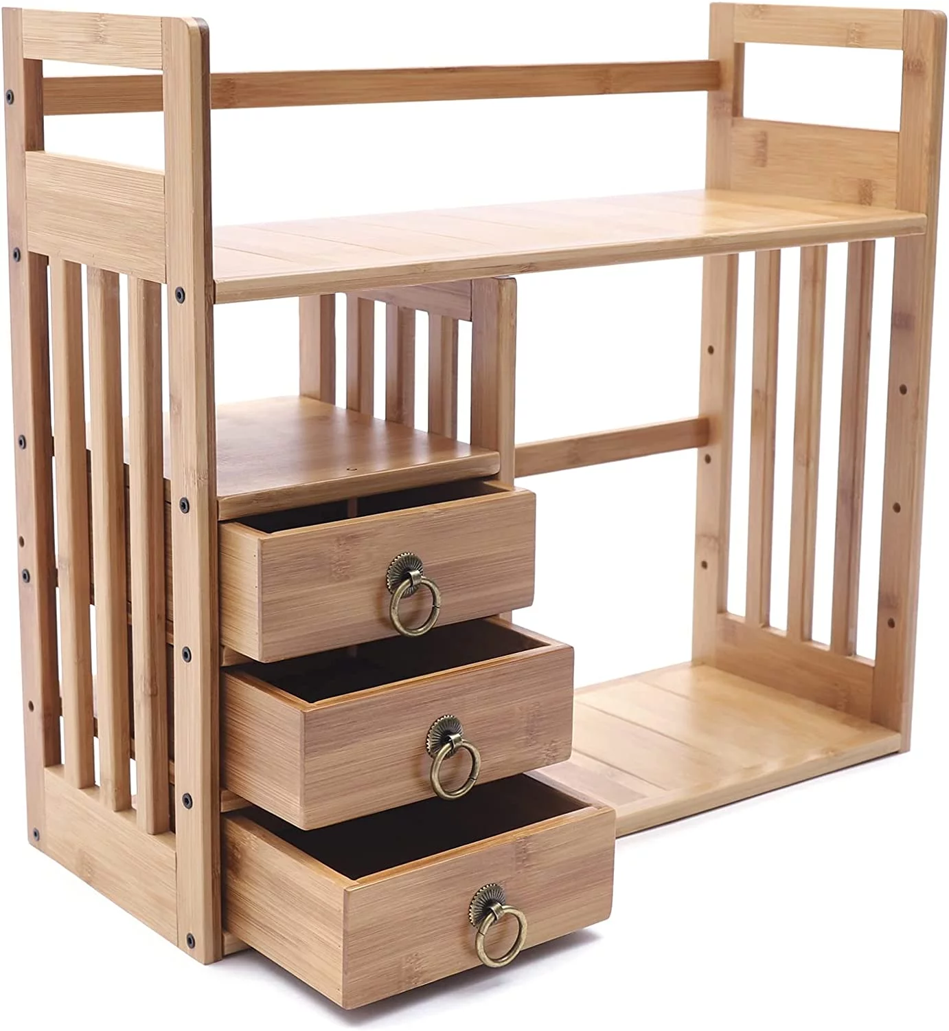 Miumaeov Bamboo Desktop Bookshelf Desk Organizer Shelf Storage Rack Counter Top Bookcase, Office Desk Storage display Shelf Rack with 3 Drawers for Office Supplies, Kitchen,Bathroom, Makeup