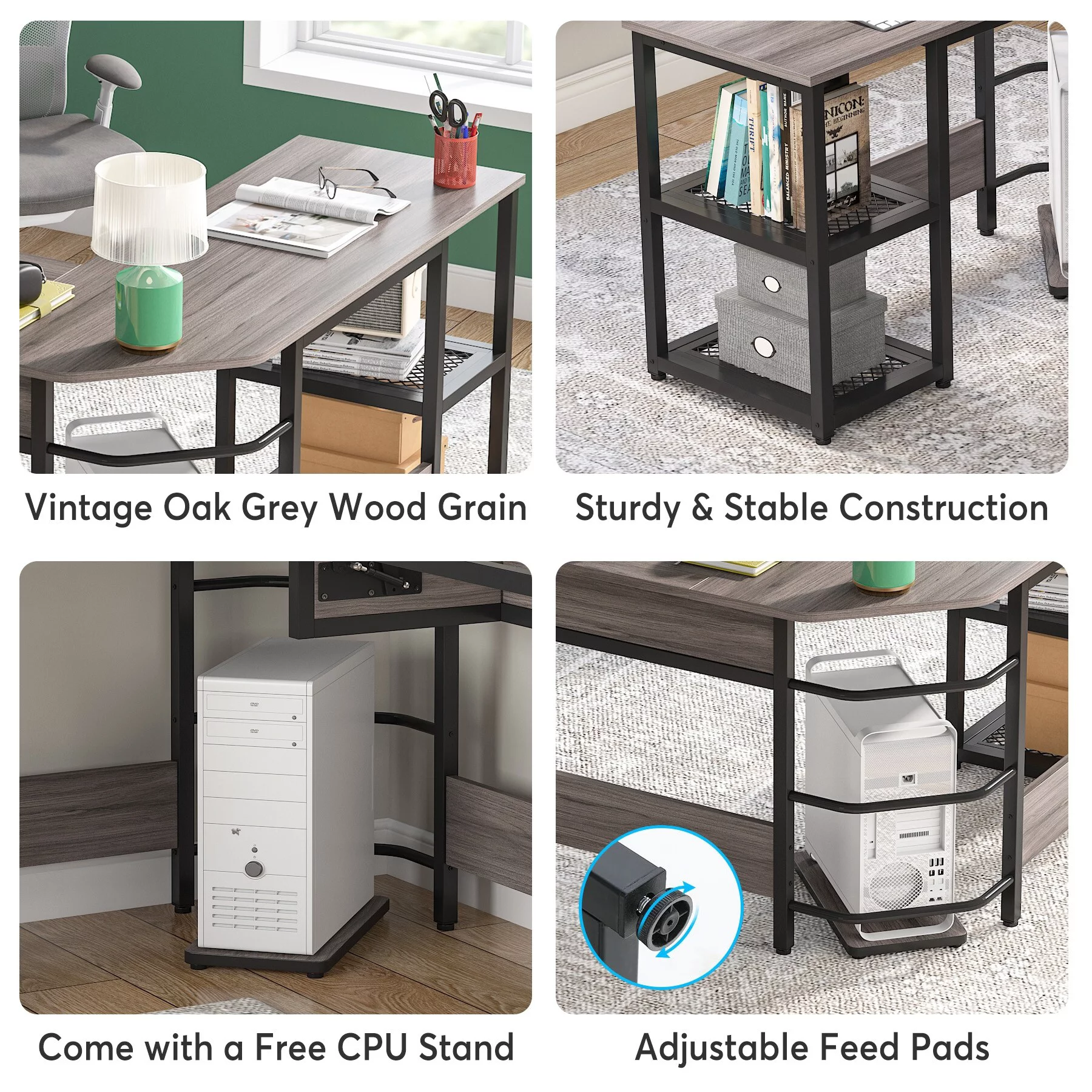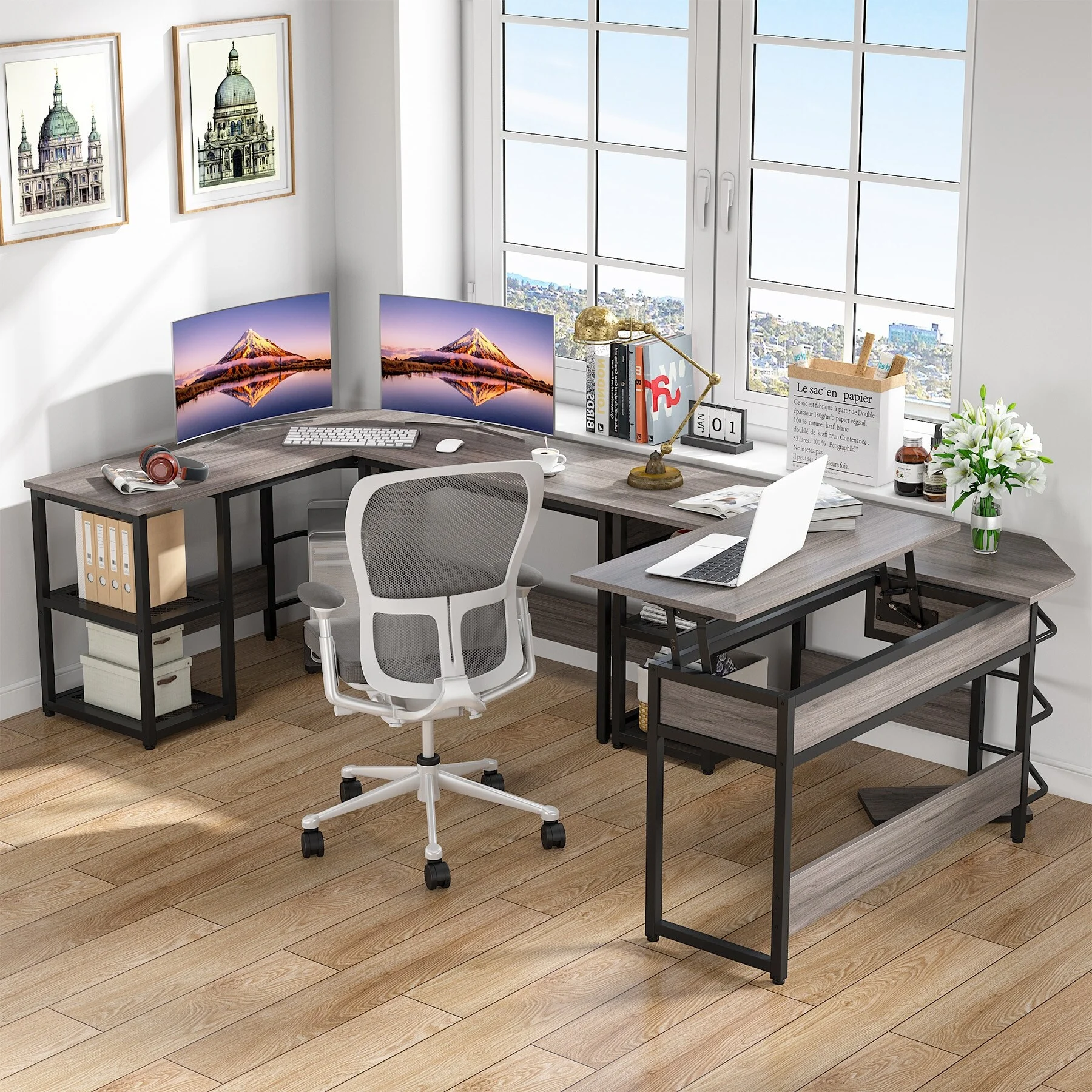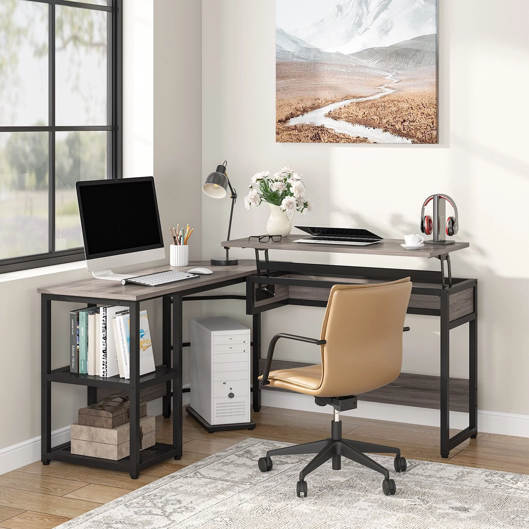 L-Shaped Computer Desk with Lift Top, 59 inch Height Adjustable Office Corner Desk with Shelves Vintage Brown