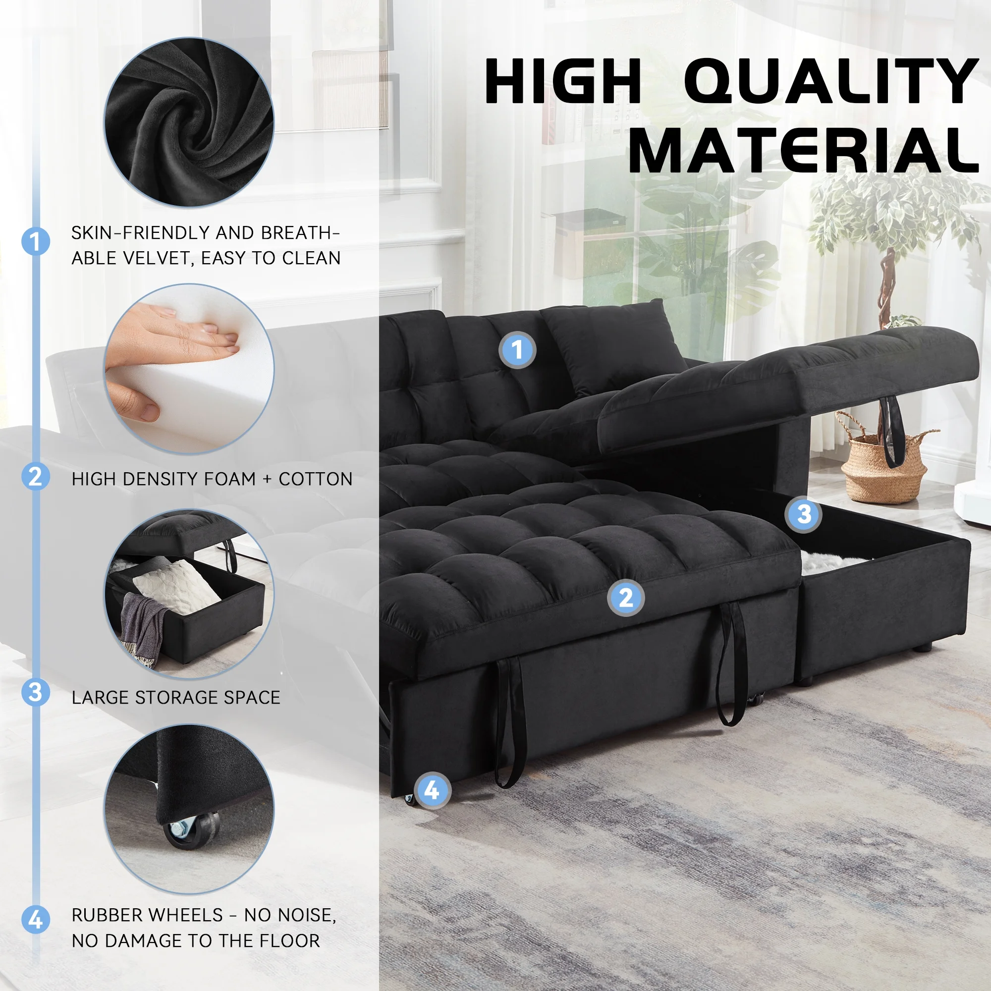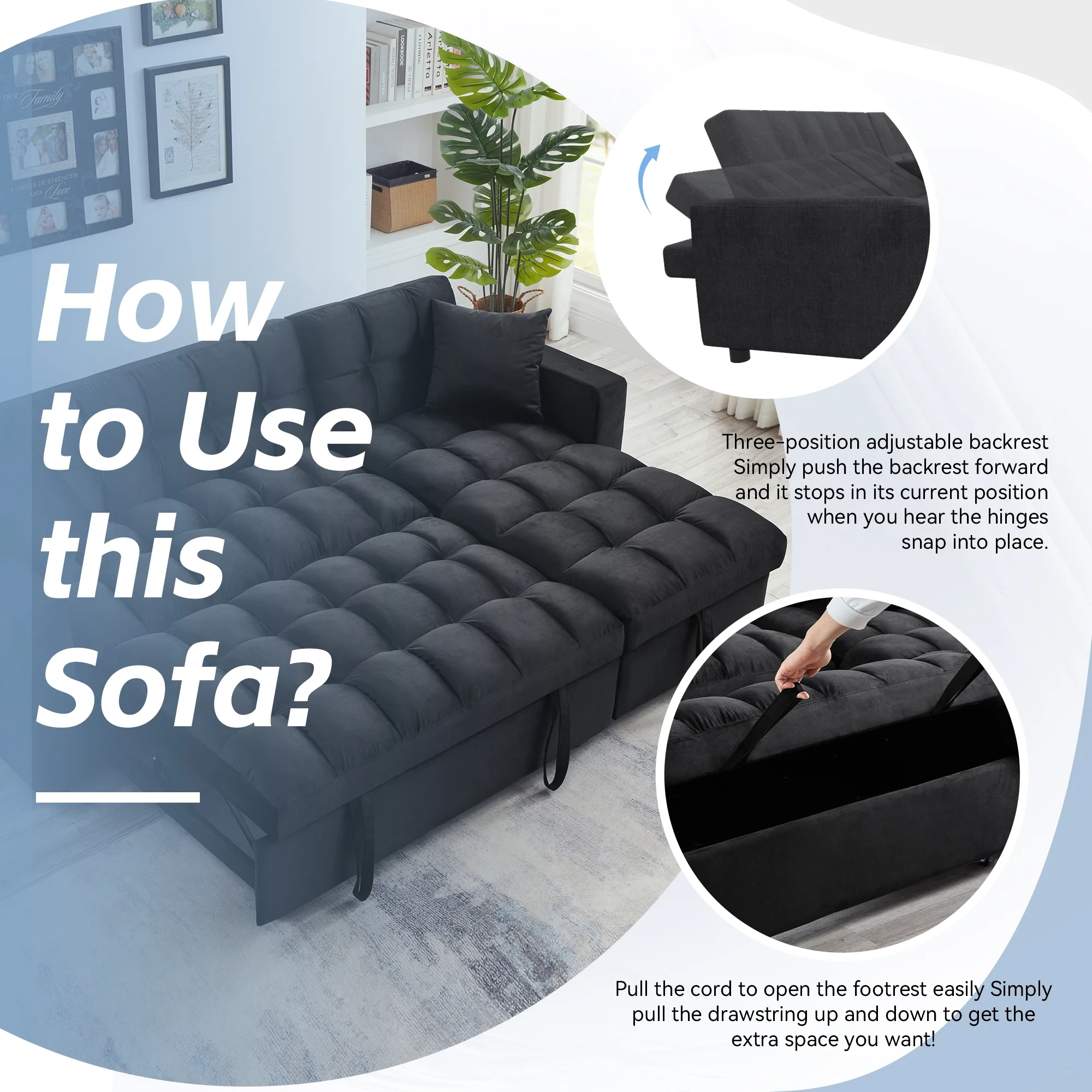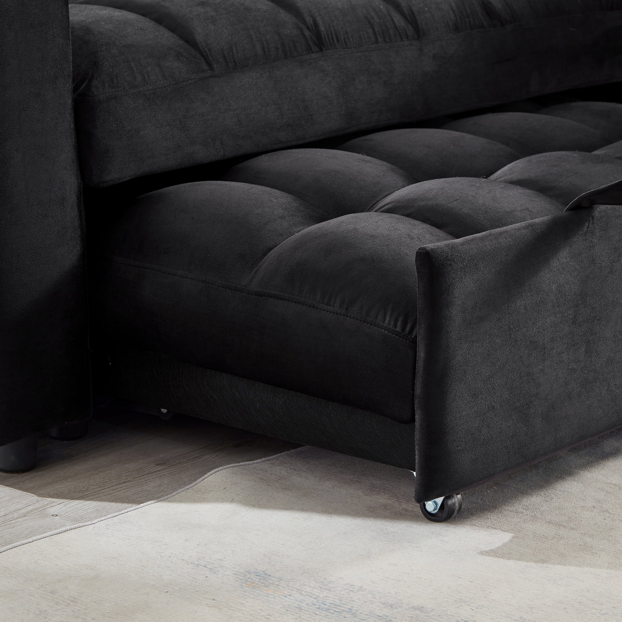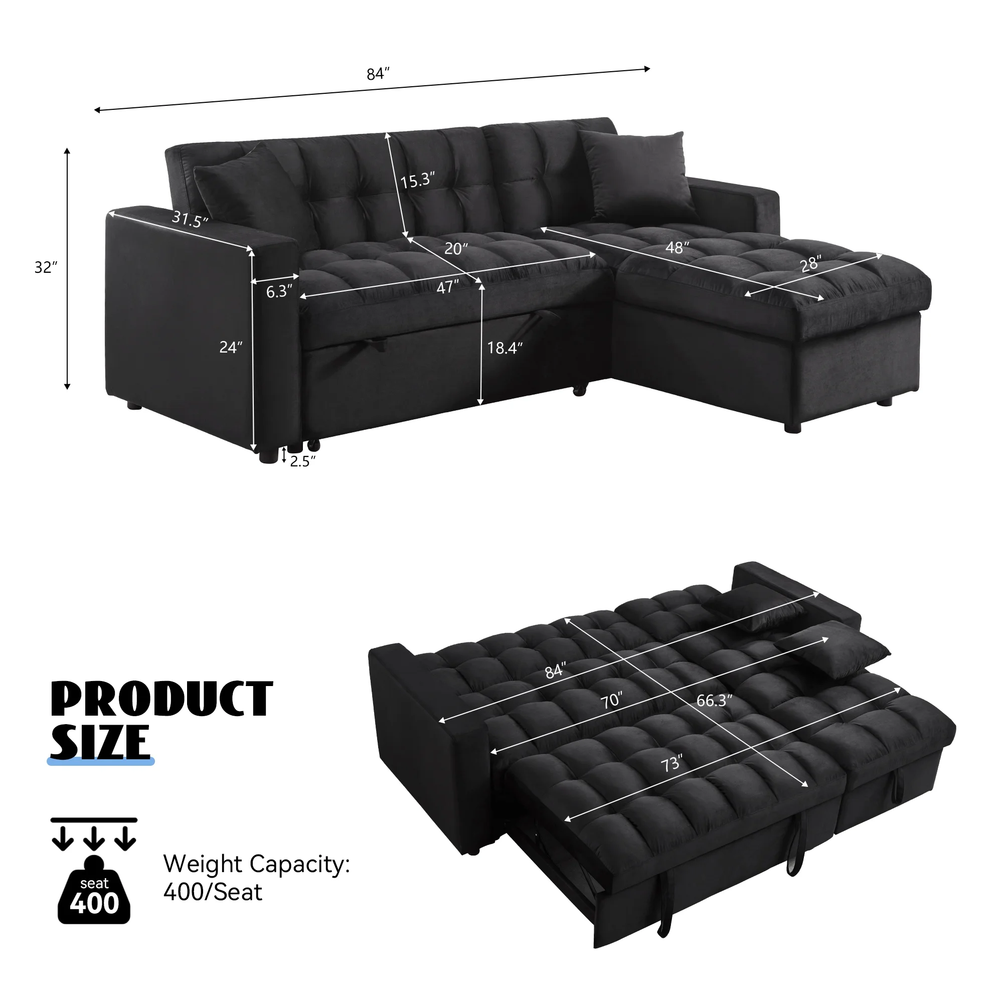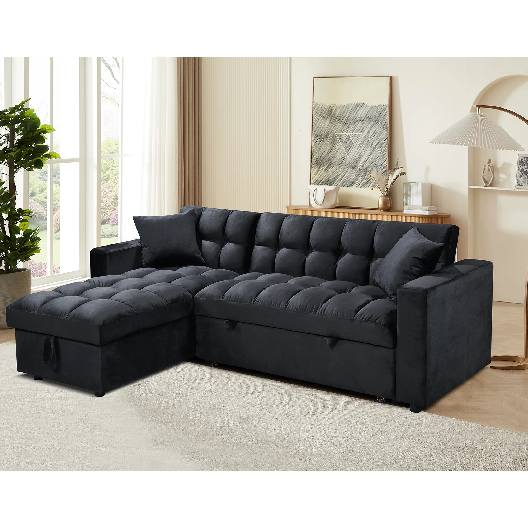 Muumblus 84" Convertible Sofa Bed, Pull Out Sofa Bed, Modern Tufted Sectional Sleeper Sofa with Storage Chaise, L Shaped Sofa Couch for Living Room, Black Velvet
