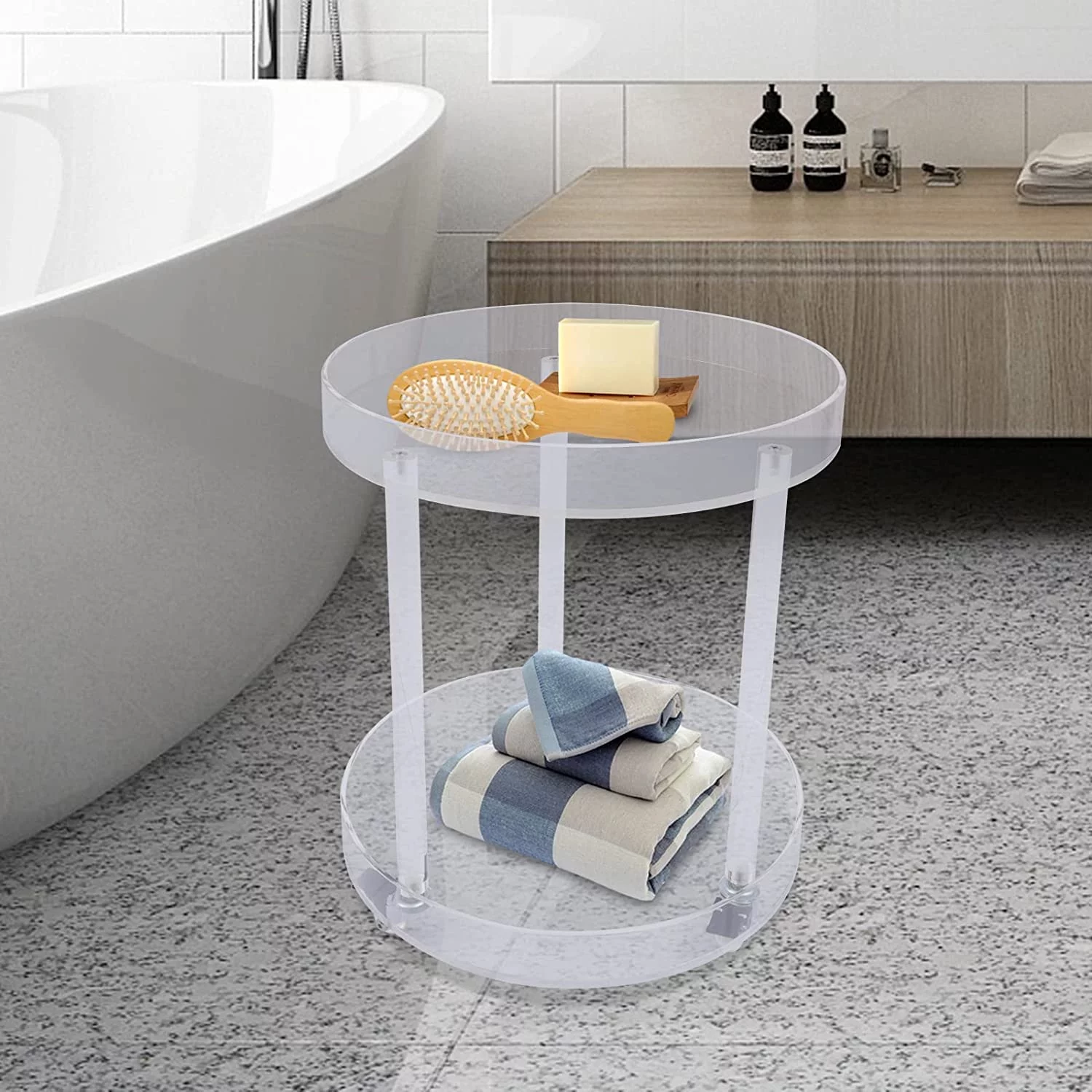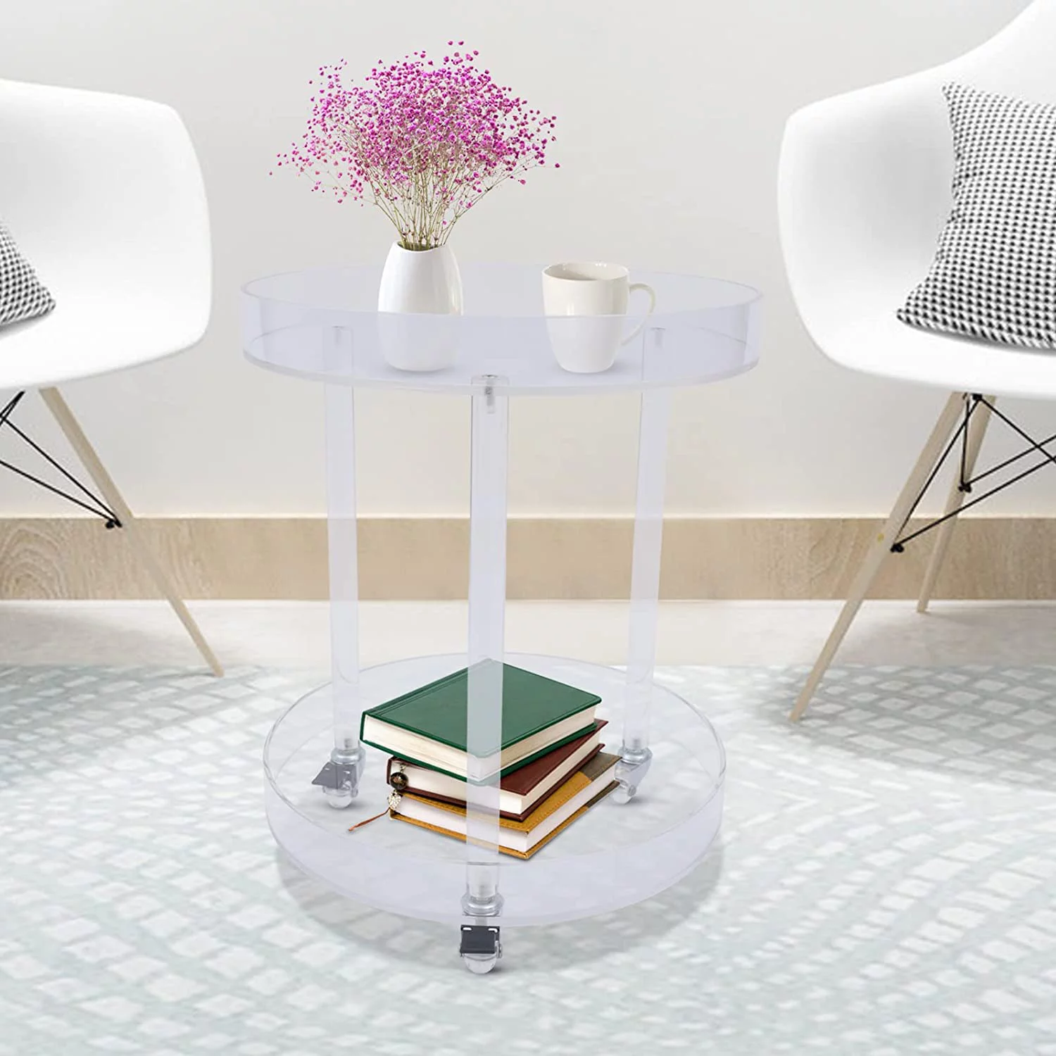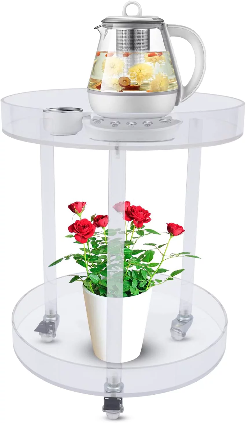 Small Acrylic Round Side Table with Wheels, 2 Tier Clear Acrylic Side End Table, Modern Clear Acrylic Side Table for Balcony Living Room Party Display