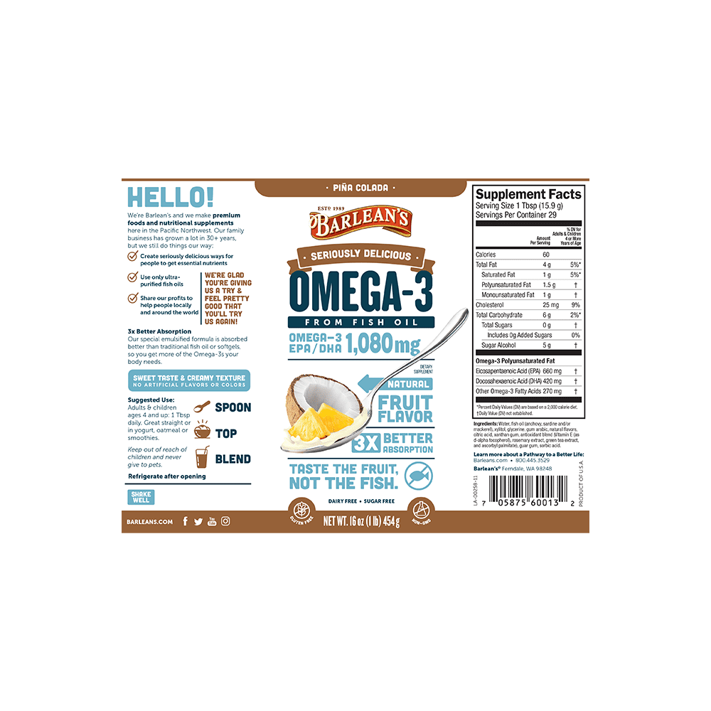 Barlean's Pina Colada High Potency Omega 3 Fish Oil Supplements - 1500mg of Omega 3 EPA/DHA for Brain, Heart, Joint, & Immune Health - All-Natural Fruit Flavor, Non GMO, Gluten Free - 16 oz