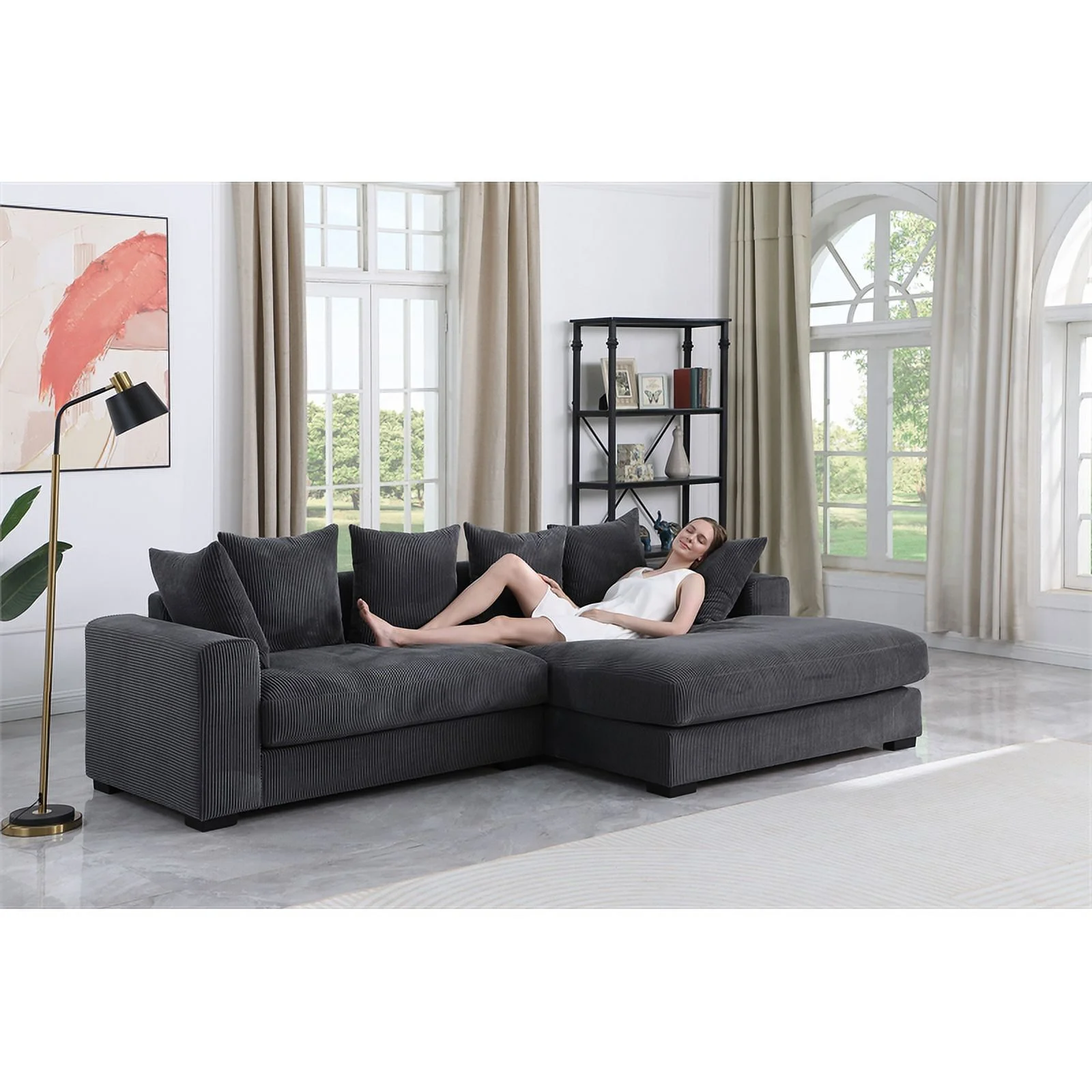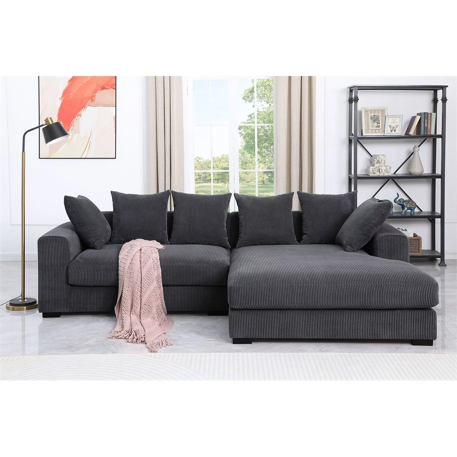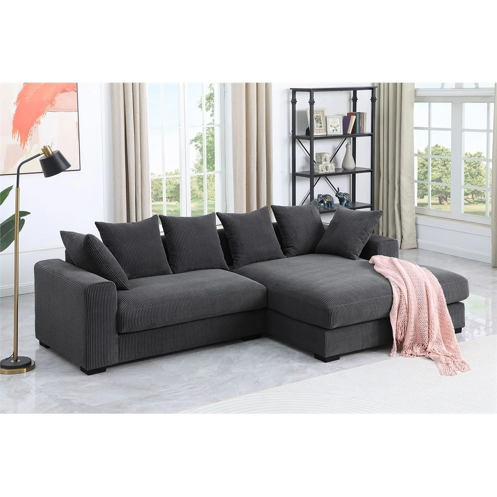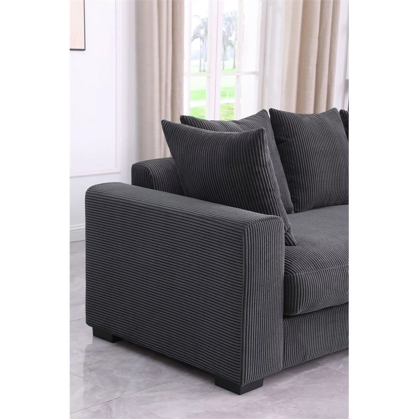 3 - Piece Upholstered Corduroy Sectional Sofa With Chaise- Dark Gray