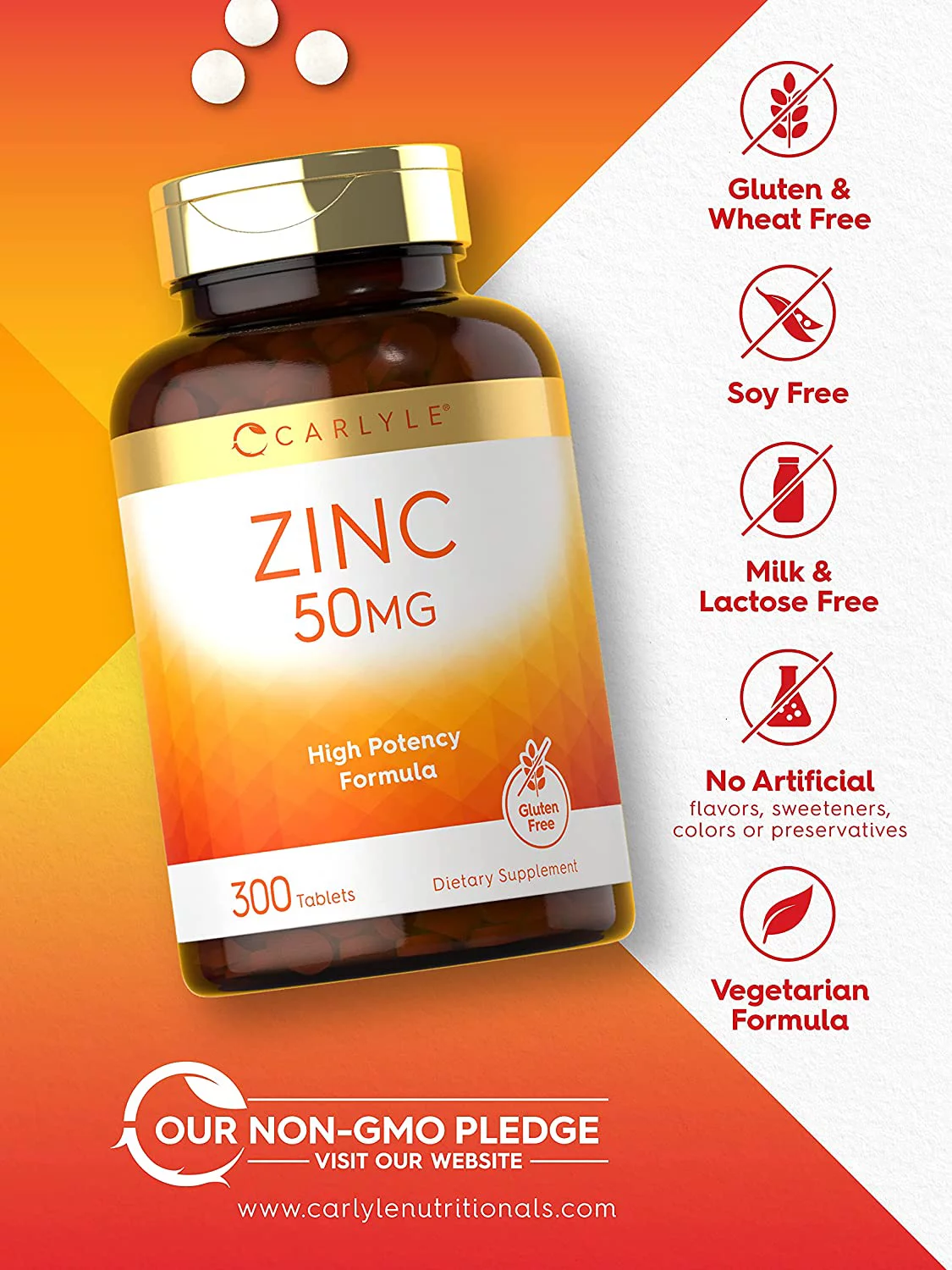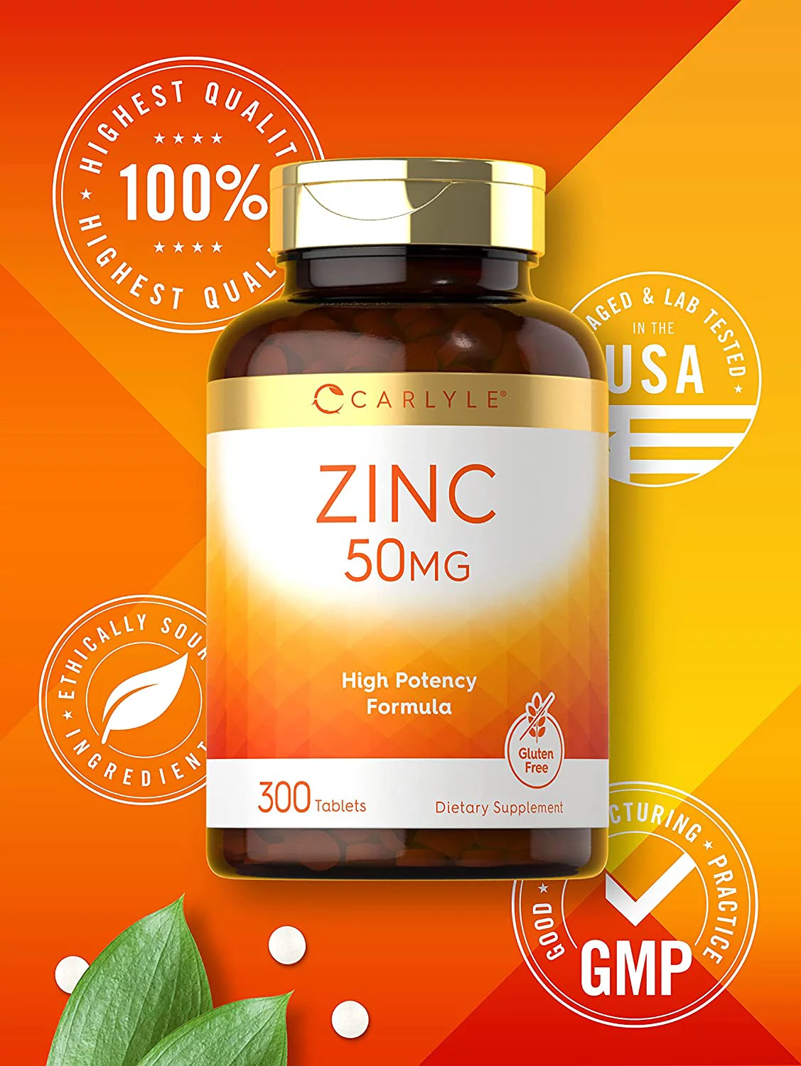 Zinc Gluconate 50mg | 300 Tablets | Vegetarian Formula | by Carlyle
