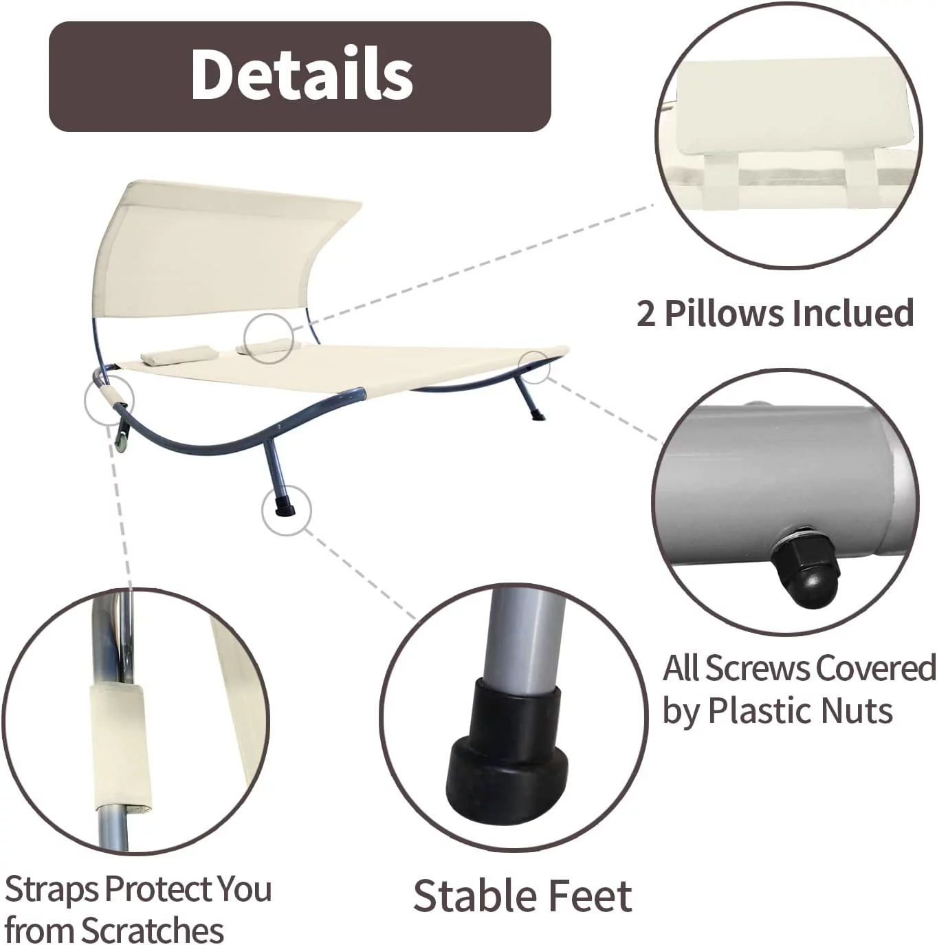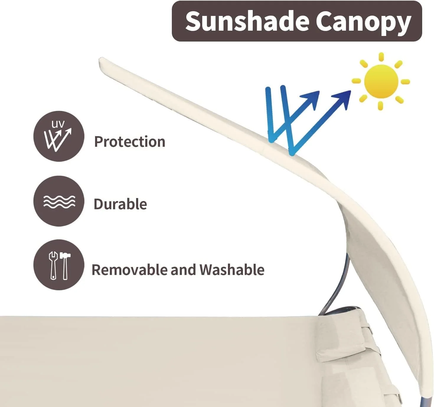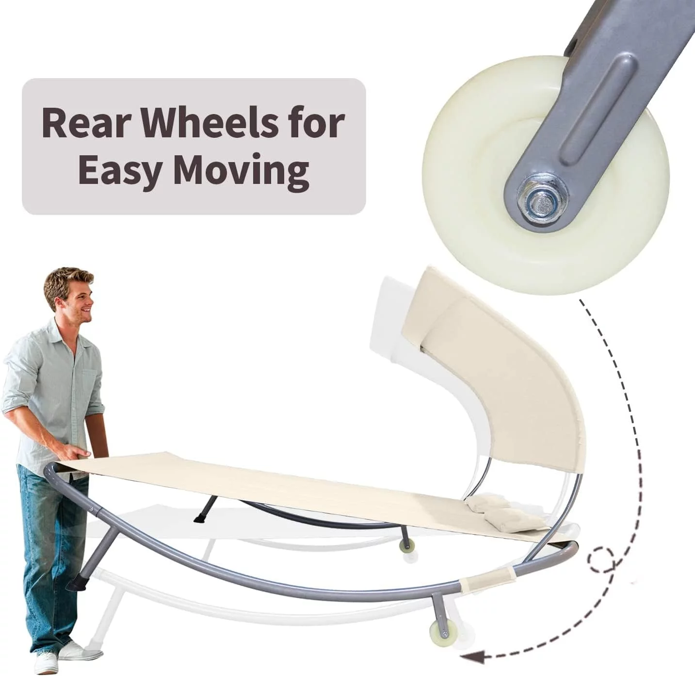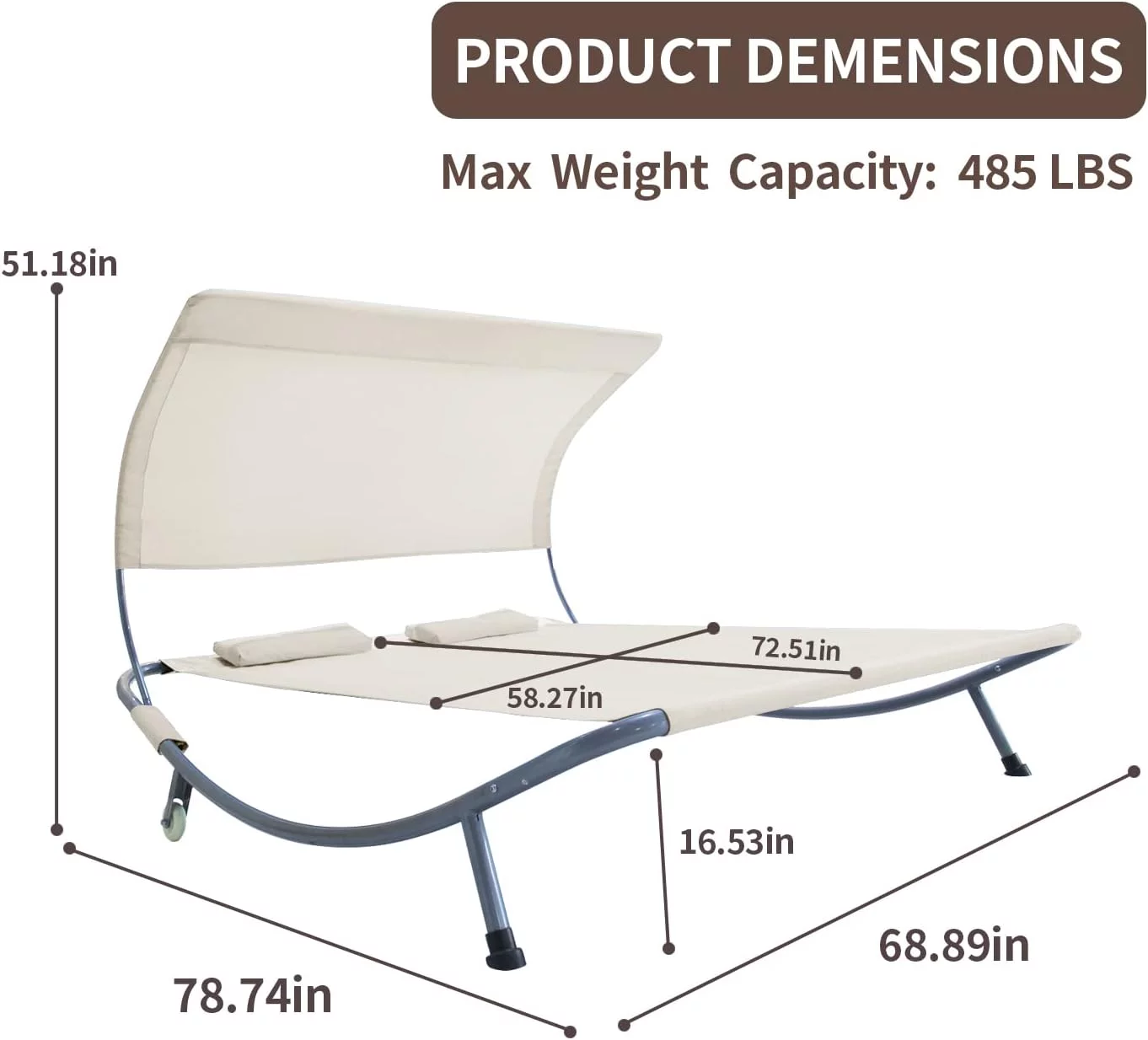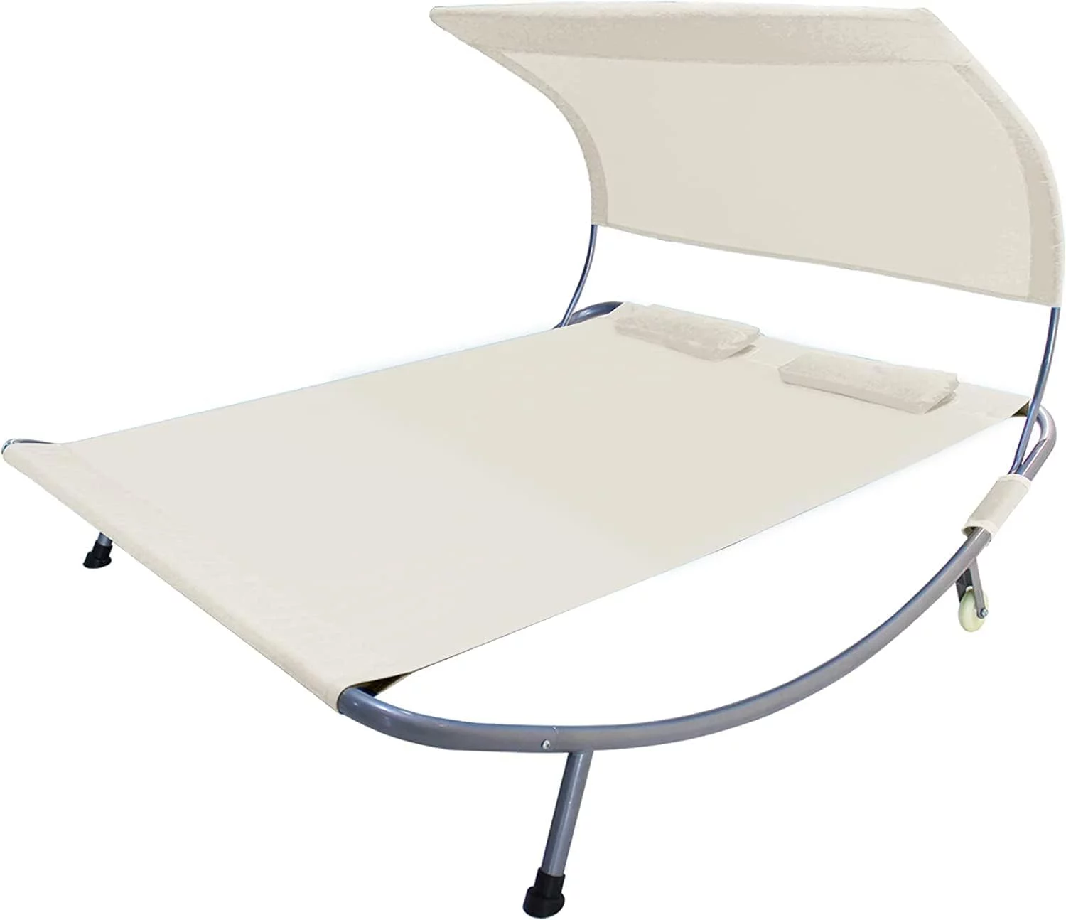 COVERONICS Patio Double Chaise Lounge Bed with Canopy,Headrest Pillow and Wheels,Portable Outdoor Hammock Bed for Patio, Yard, Pool (Beige)