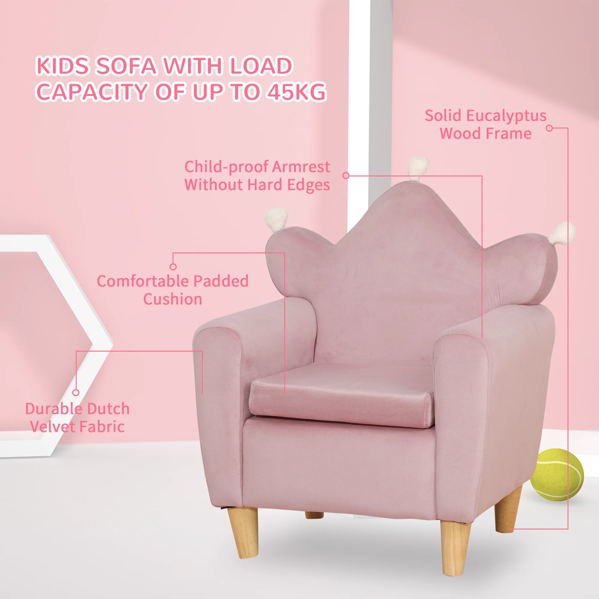 Qaba Soft Kids Sofa Chair, Single Lounger Armchair for Children with Strong Frame, Cute Pink Crown Throne for Relaxing, Watching TV, Studying