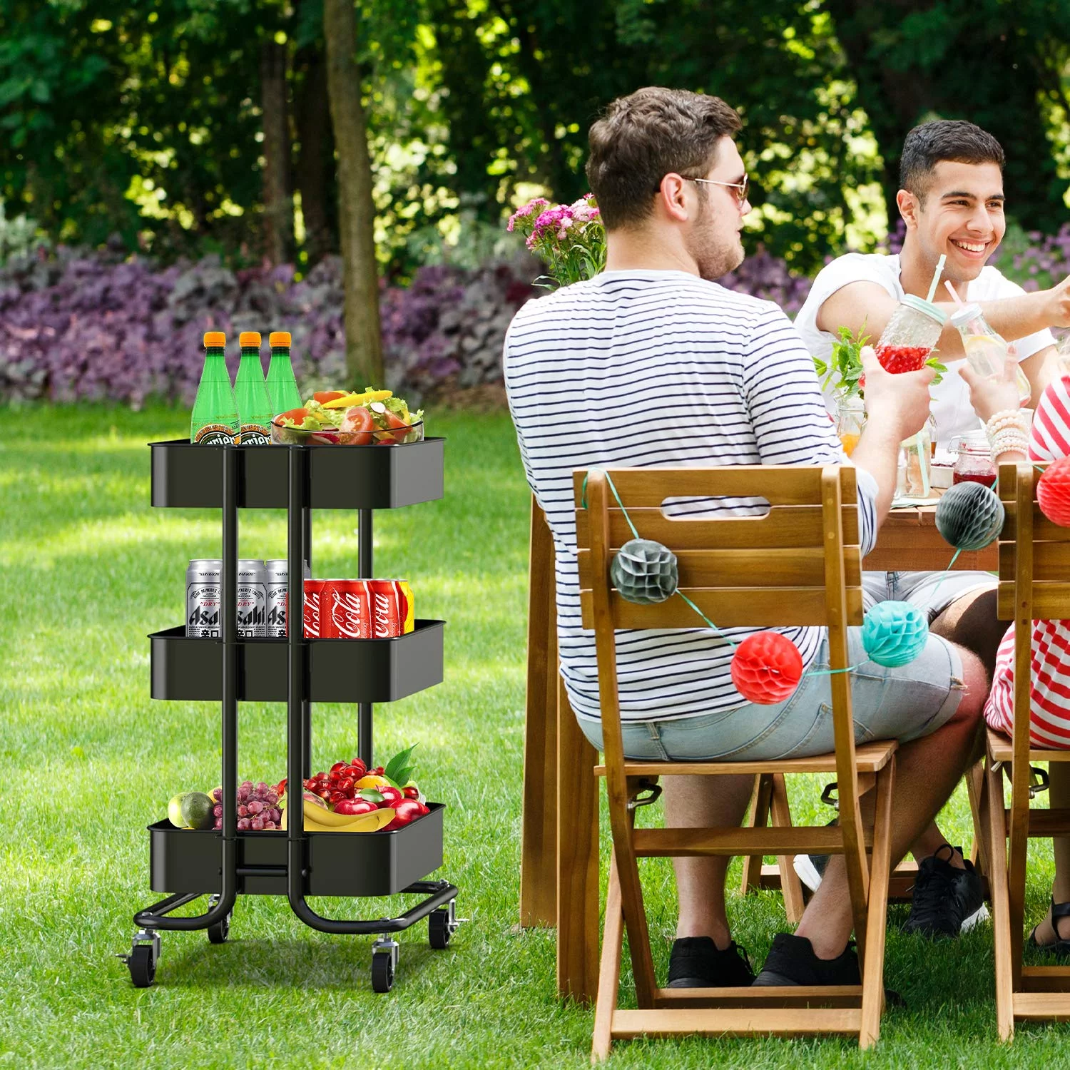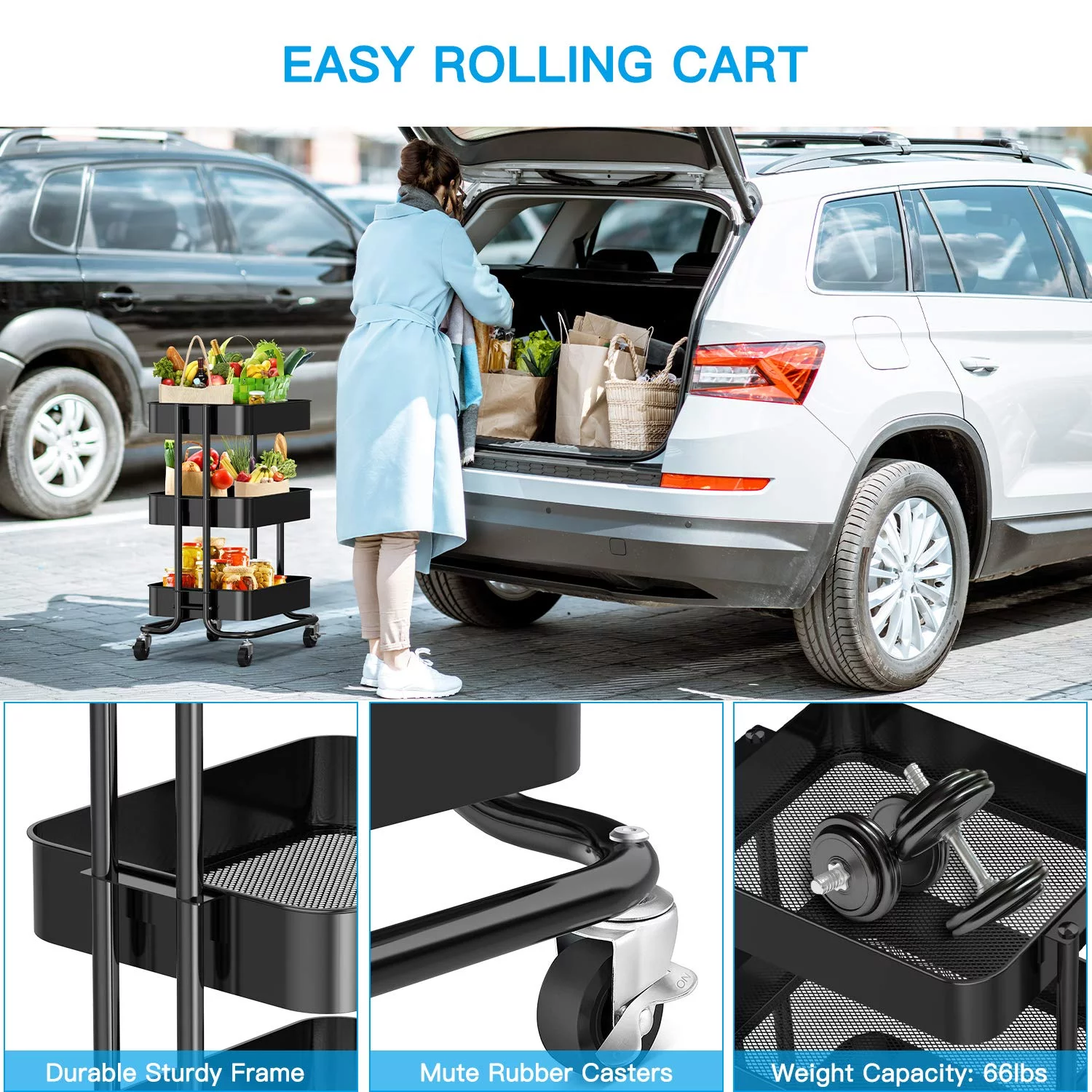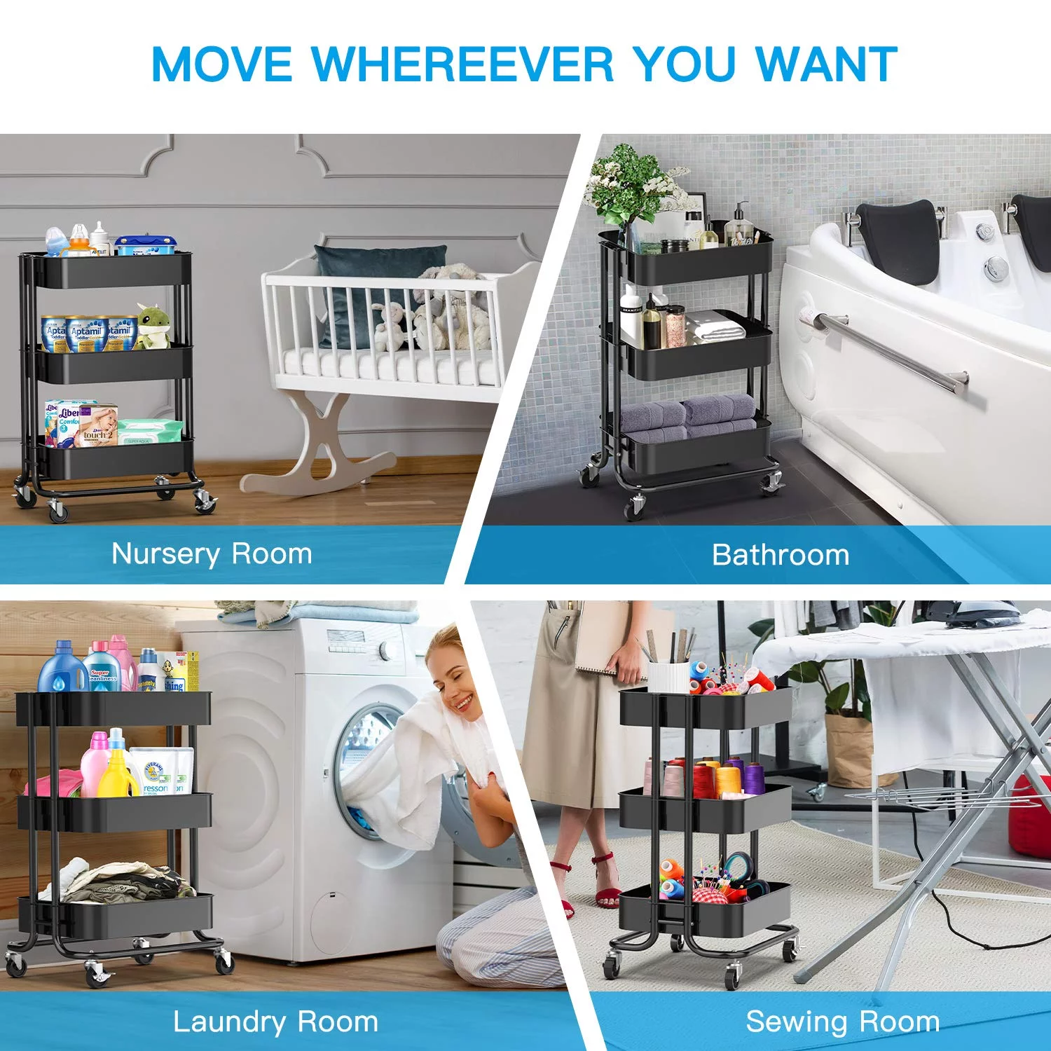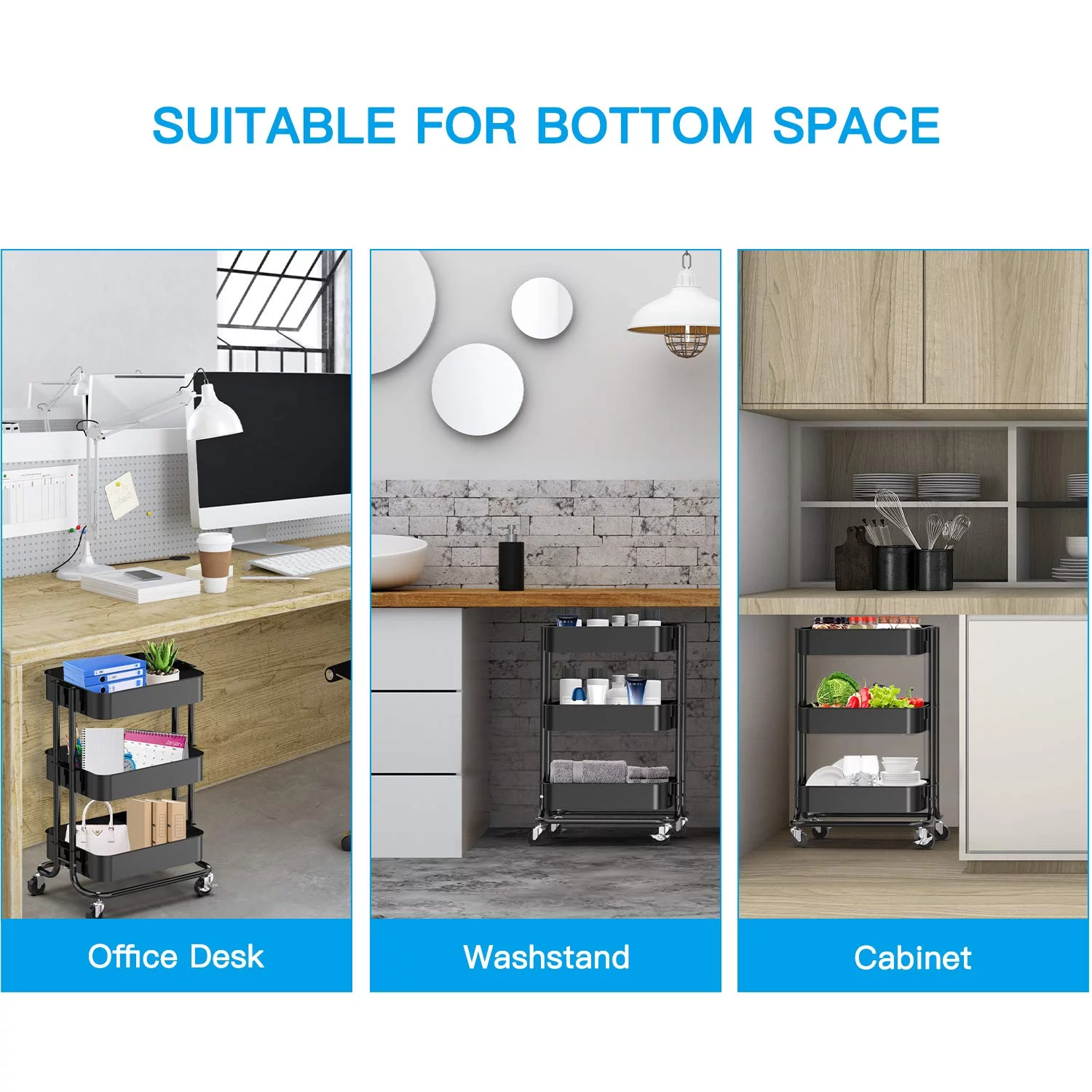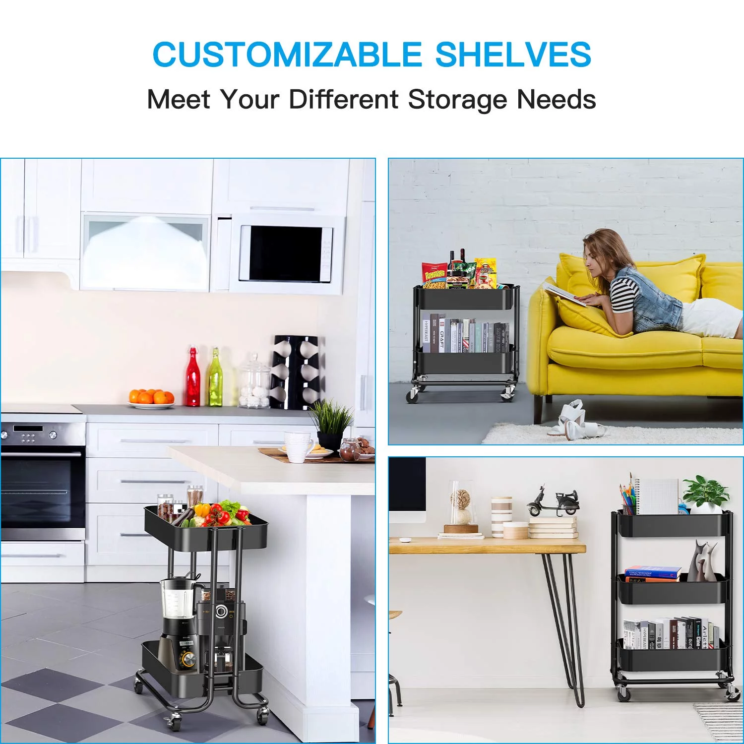 3-Tier Metal Rolling Utility Cart, Multifunction Storage Cart Organization Cart with 2 Lockable Wheels for Home Office Kitchen (Black)